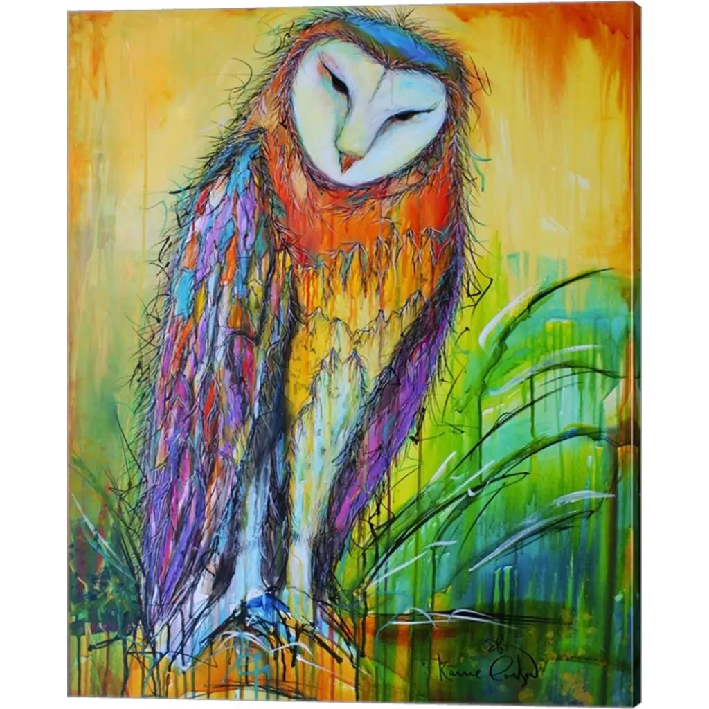 Curious Owl by Karrie Evenson is a high quality piece of canvas artwork. The finished size of this piece is 16" X 20", and it has a depth 0.75". There is a UV protective coating over the entire image, and it is ready to hang on your wall with a standard drywall screw (not included). 100% Satisfaction Guaranteed.