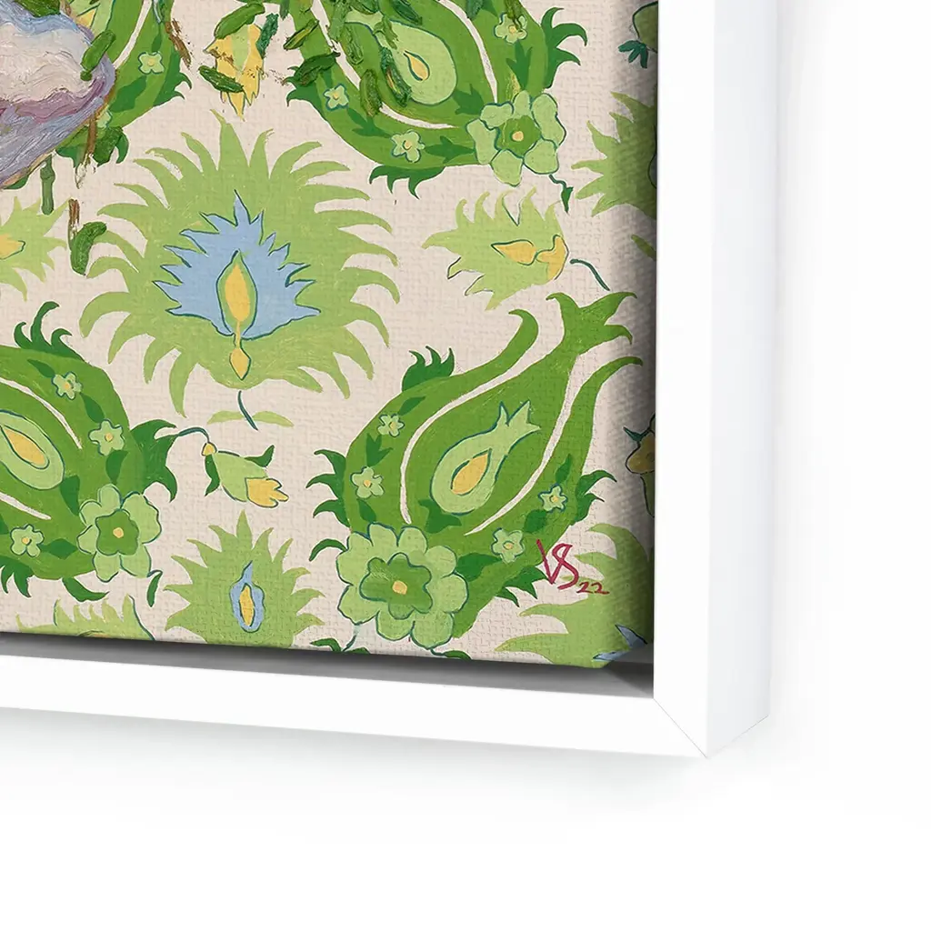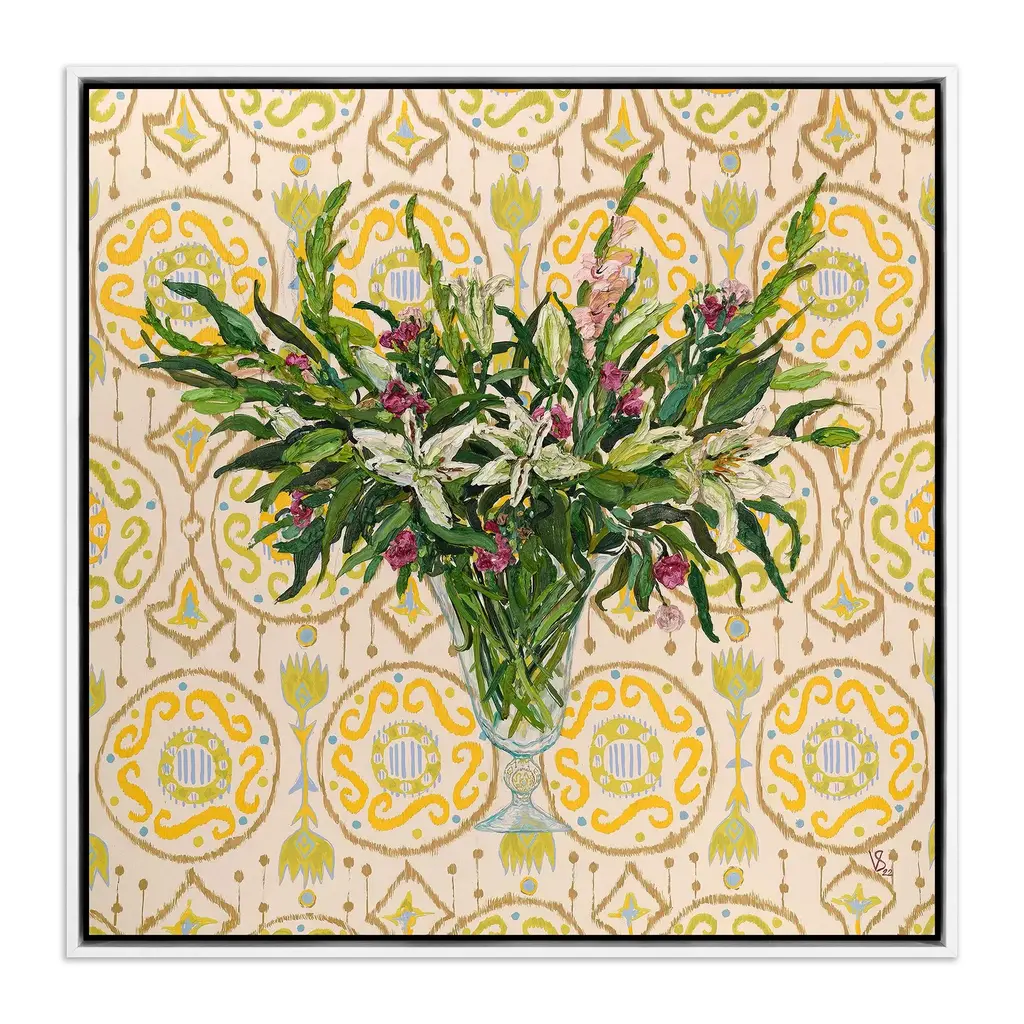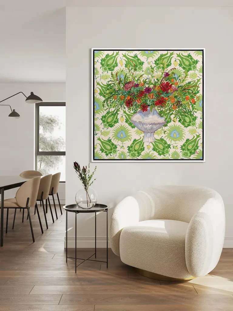 DESCRIPTION: Kashmiri Bloom by Venetia Syms in White Frame, Art Print on Canvas Edition of 100. SPECIFICATIONS: Type: Giclée Art Print on Matte Canvas. Overall Size (in): 40x40. Image Size (in): 38.5x38.5. Orientation: Vertical. Flush/Float/Matted: Float. Frame Color: White. Hanging Hardware: Picture Perfect. FRAMING: Each art work arrives framed and ready to hang. We use handmade frames with a plexiglass glazing front, because it offers less glare than standard glass. At this time, we only offer framed prints. ARTIST BIO: Venetia Syms (b.1990) studied classical portraiture at Charles Cecil Studios in Florence, Italy and went on to University College Falmouth, U.K and the Heatherley’s School of Fine Art in London. Venetia now paints colourful impasto paintings inspired by the natural world from her studio in London. Her contemporary still life paintings are a modern interpretation of a traditional idea by setting flowers in front of patterned fabrics. “I'm obsessed with colourful textile design; I paint interpretations of my favourite fabrics in the background of my paintings. I particularly love Suzani inspired designs which remind me of my travels across central Asia along the silk road allowing my paintings to take you to another place. Using a palette knife I stroke indulgent layers of oil paint to capture the life and colour of cut flowers.” Venetia’s paintings have been exhibited across the U.K and in Amsterdam. She had an exhibition at the Chelsea Flower Show 2022 & 2021.