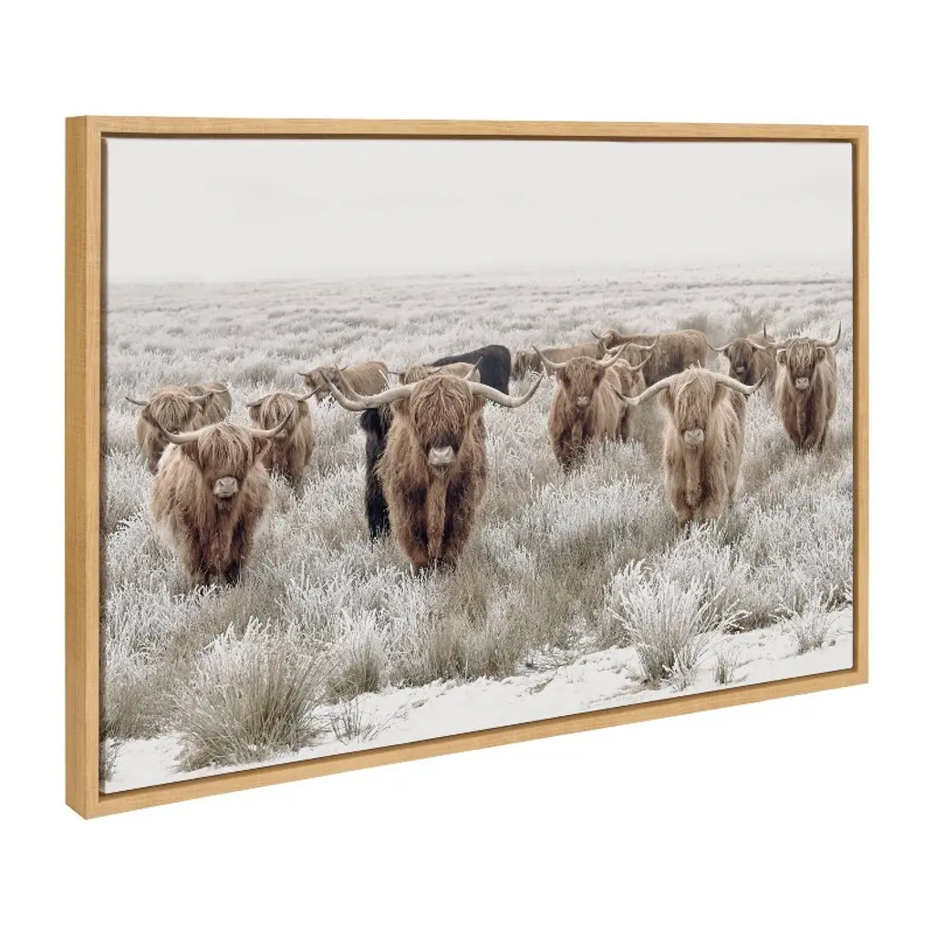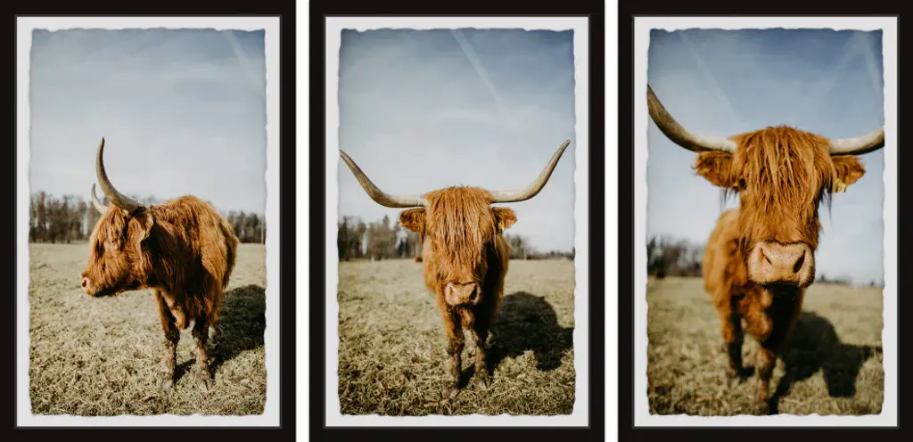Celebrate the rustic charm of farm life with this set of framed canvas art showcasing Texas longhorns and Highland cows. The collection adds a touch of country allure and farm animal appeal to your decor. Framed in the USA in Waunakee, Wisconsin, this modern floating canvas art set of 3 is sure to bring joy to your space. Our design team curates art that will fit perfectly in any room of your home. Showcase this art in your living room, bedroom, home office, kitchen, bathroom, nursery, or anywhere you want to bring a little beauty and charm to your walls. Specializing in home décor, we are continually bringing timeless works of art for the traditional decorator as well as trend-forward pieces for that eclectic art lover. Our high-quality framed canvas art also makes excellent gifts for birthdays, holidays, or housewarming parties. Printed on gallery-wrapped canvas and framed with a simple gallery frame this wall art is easy to display on the wall and will match with any décor style. Display dimensions of the largest piece are 23 inches by 33 inches and the two smaller canvases are each 16 inches by 20 inches. Print Names: “Texas Longhorn, Highland Cow Portrait Close Color and Herd of Highland Cows Color”