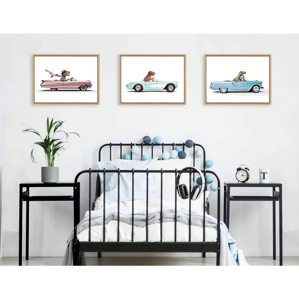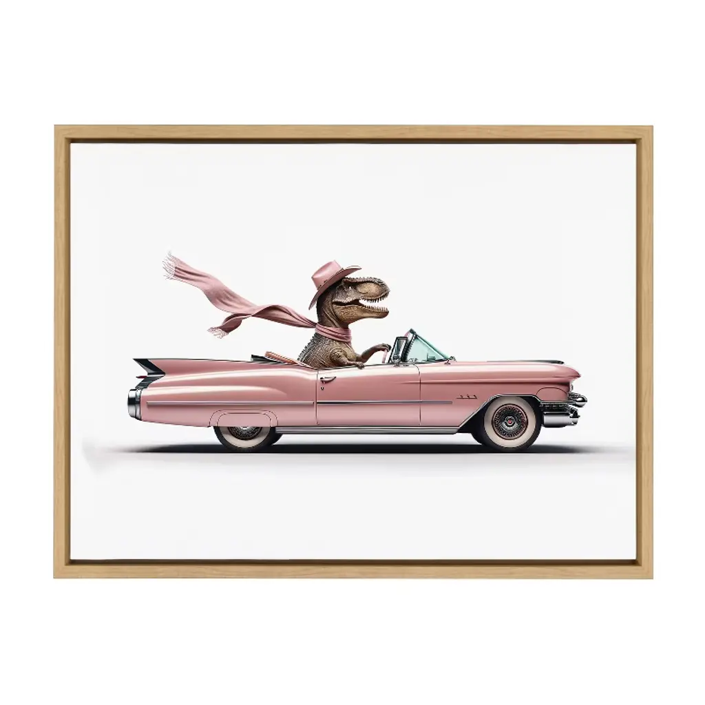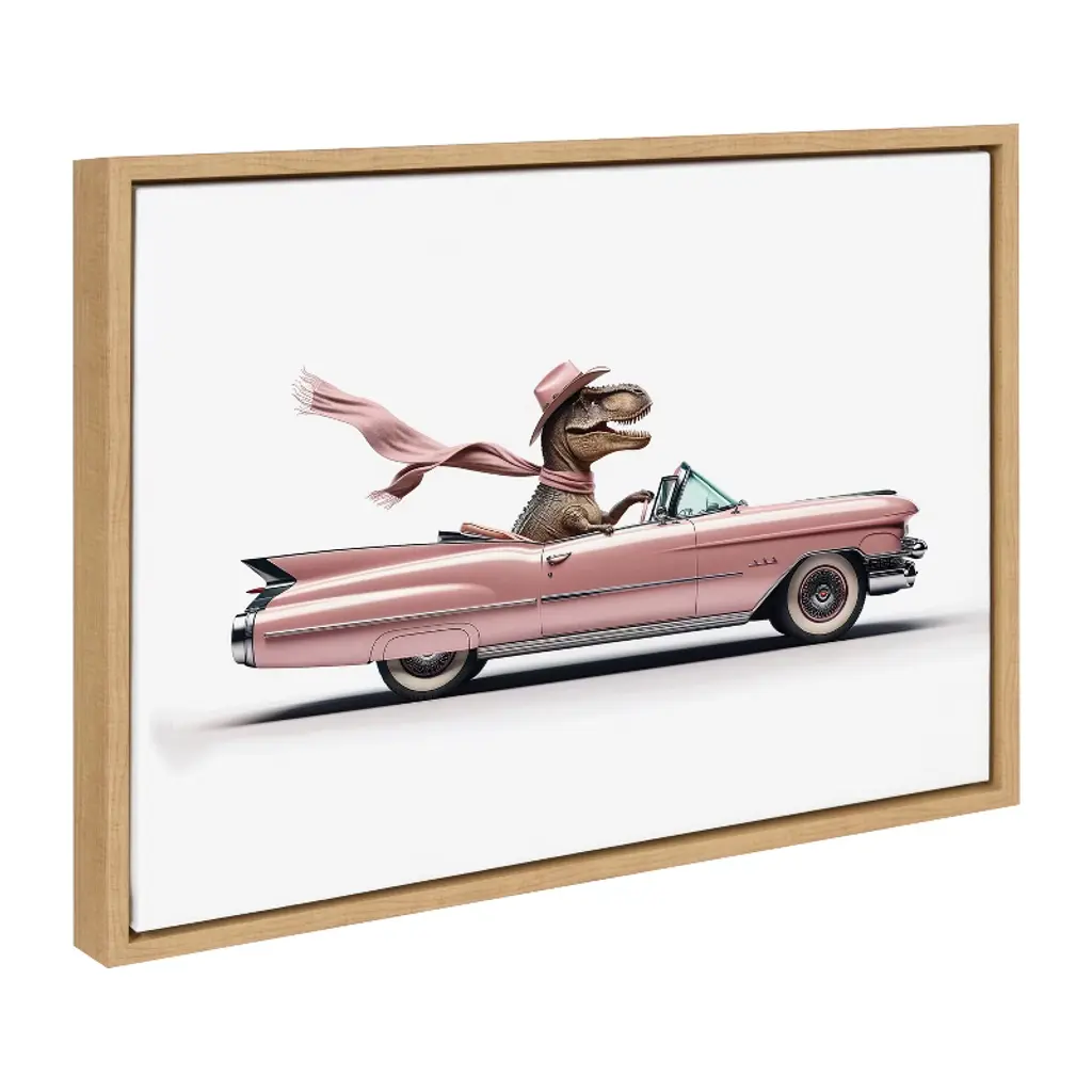 This whimsical artwork by Saint and Sailor Studios features a cowgirl dinosaur driving a 1950s pink Cadillac, blending nostalgia with playful creativity. It makes a delightful addition to any child's room or playful decor. Framed in the USA in Waunakee, Wisconsin, this modern floating canvas art is sure to bring joy to your space. Our design team curates art that will fit perfectly in any room of your home. Showcase this art in your living room, bedroom, home office, kitchen, bathroom, nursery, or anywhere you want to bring a little beauty and charm to your walls. Specializing in home décor, we are continually bringing timeless works of art for the traditional decorator as well as trend-forward pieces for that eclectic art lover. Our high-quality framed canvas art also makes excellent gifts for birthdays, holidays, or housewarming parties. Printed on gallery-wrapped canvas and framed with a simple gallery frame this wall art is easy to display on the wall and will match with any décor style. The outer dimensions are 18 inches by 24 inches by 1.6 inches. Print Name: “Cowgirl Dino Driving 1950s Pink Cadillac”