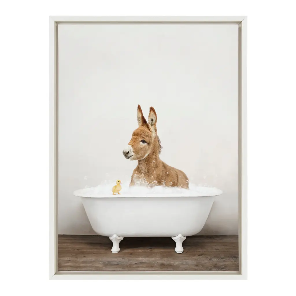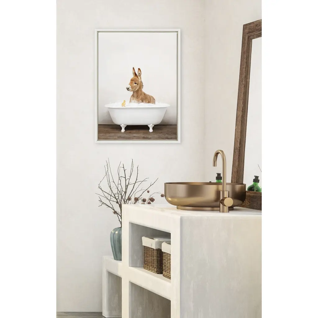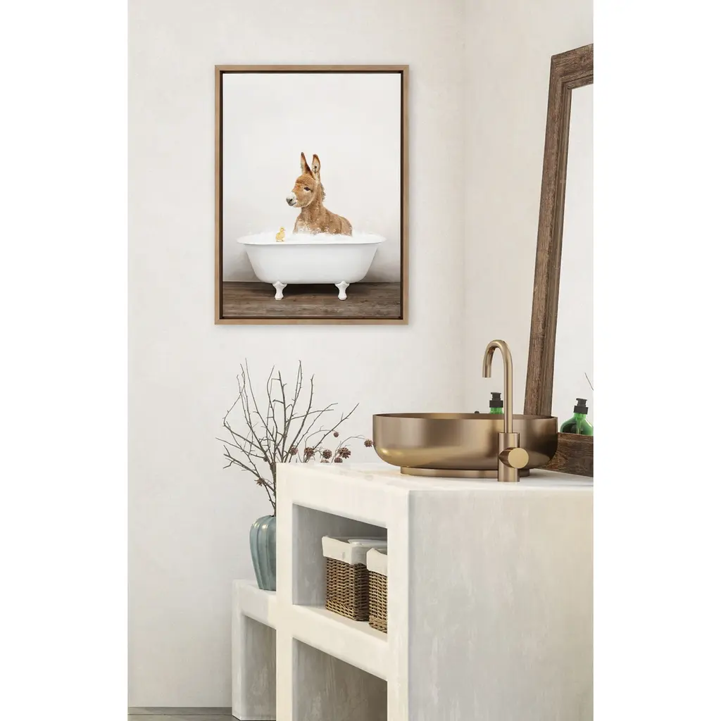 Make a bold impression on your house guests with this whimsical animal art piece by artist Amy Peterson. With its sleek modern frame, this fun, contemporary design is the perfect art piece to add to your home decor collection. Framed in the USA in Waunakee, Wisconsin, this floating canvas art will be a pleasure to look at every day in your living room, bedroom, nursery, or any room in the home. This art print also makes an excellent gift for birthdays, holidays, or house-warming parties. Printed on gallery-wrapped canvas and framed with a lightweight polystyrene frame, this wall art is easy to display on the wall. The outer dimensions are 18 inches by 24 inches by 1.6 inches. Print Name: "Baby Donkey in Rustic Bath"