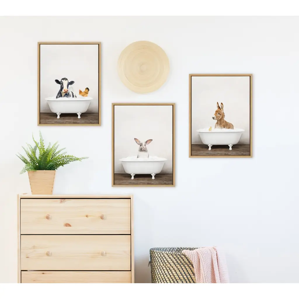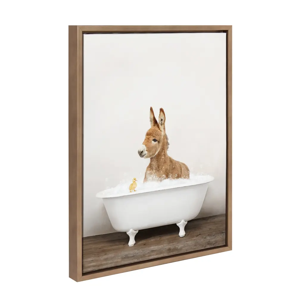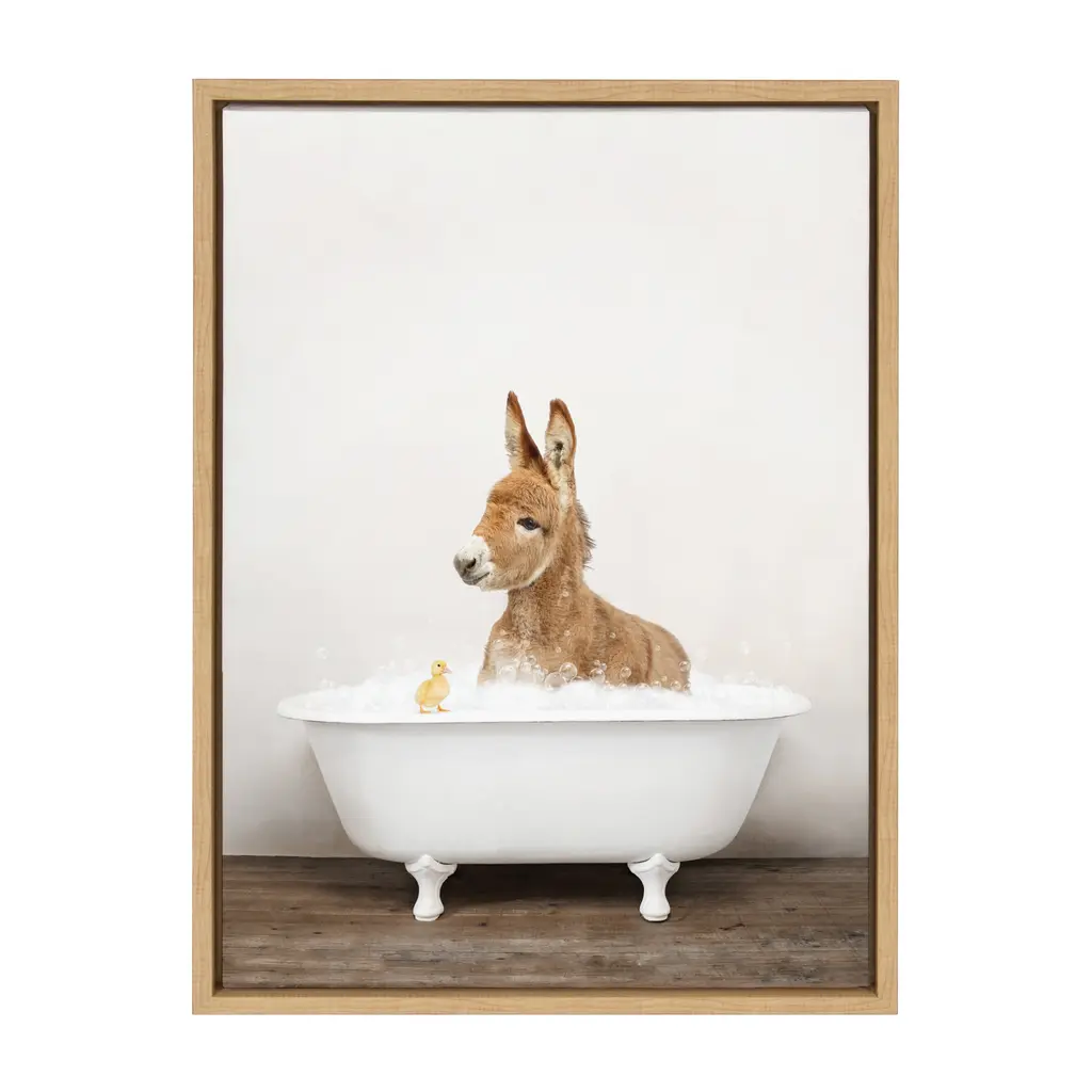 Make a bold impression on your house guests with this whimsical animal art piece by artist Amy Peterson. With its sleek modern frame, this fun, contemporary design is the perfect art piece to add to your home decor collection. Framed in the USA in Waunakee, Wisconsin, this floating canvas art will be a pleasure to look at every day in your living room, bedroom, nursery, or any room in the home. This art print also makes an excellent gift for birthdays, holidays, or house-warming parties. Printed on gallery-wrapped canvas and framed with a lightweight polystyrene frame, this wall art is easy to display on the wall. The outer dimensions are 18 inches by 24 inches by 1.6 inches. Print Name: "Baby Donkey in Rustic Bath"
