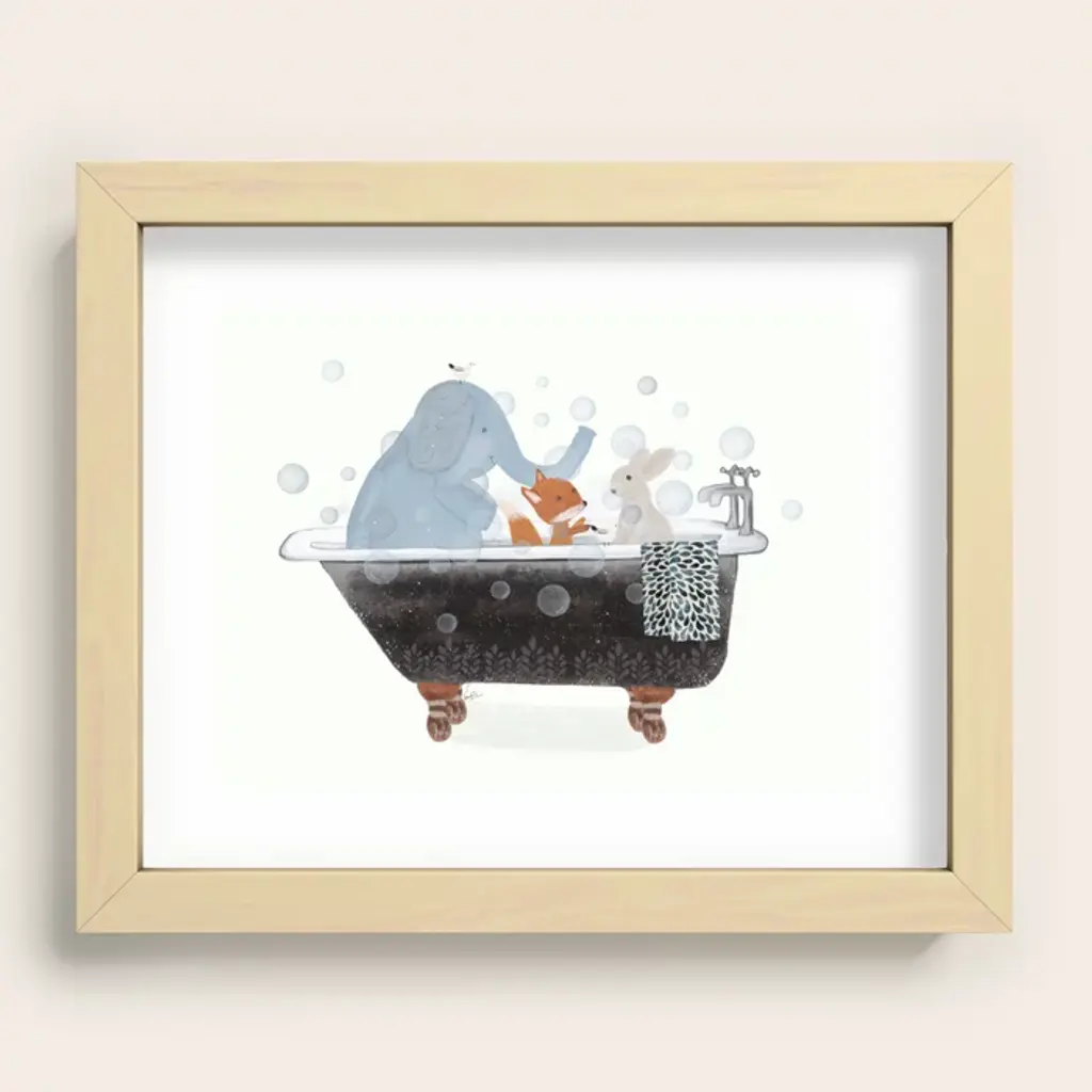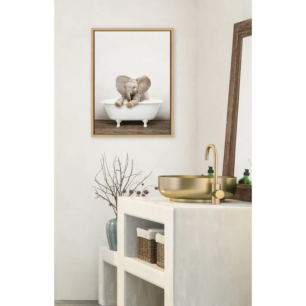 Make a bold impression on your house guests with this whimsical animal art piece by artist Amy Peterson. With its sleek modern frame, this fun, contemporary design is the perfect art piece to add to your home decor collection. Framed in the USA in Waunakee, Wisconsin, this floating canvas art will be a pleasure to look at every day in your living room, bedroom, nursery, or any room in the home. This art print also makes an excellent gift for birthdays, holidays, or house-warming parties. Printed on gallery-wrapped canvas and framed with a lightweight polystyrene frame, this wall art is easy to display on the wall. The outer dimensions are 18 inches by 24 inches by 1.6 inches. Print Name: "Baby Elephant No 6 in Rustic Bath"
