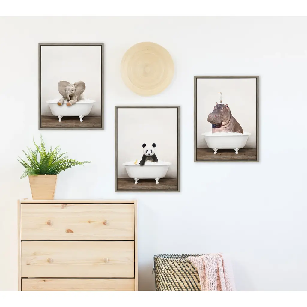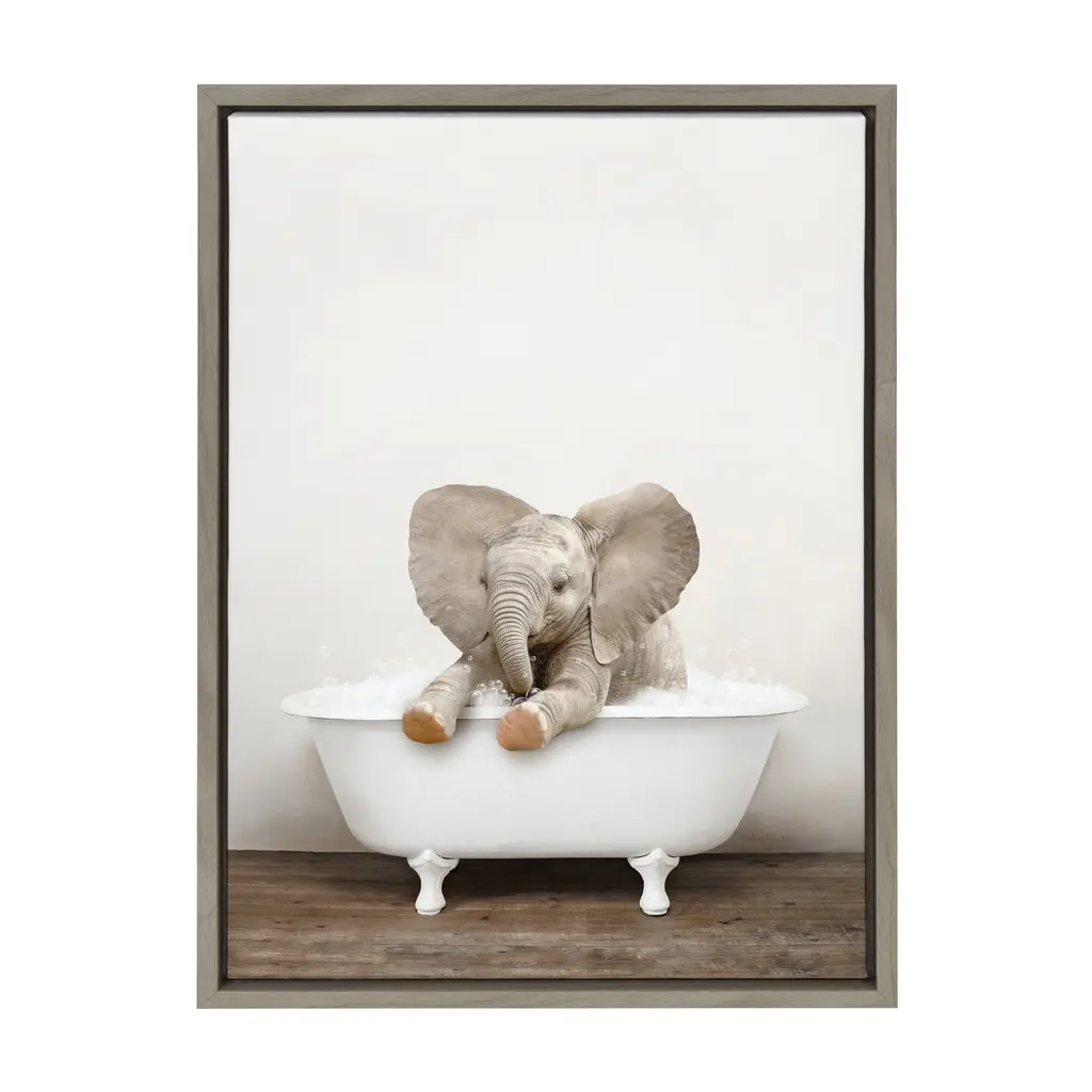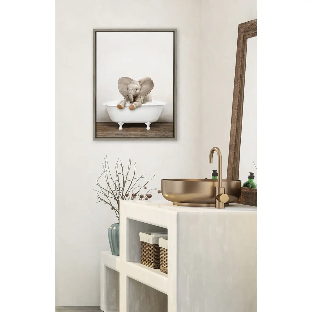 Make a bold impression on your house guests with this whimsical animal art piece by artist Amy Peterson. With its sleek modern frame, this fun, contemporary design is the perfect art piece to add to your home decor collection. Framed in the USA in Waunakee, Wisconsin, this floating canvas art will be a pleasure to look at every day in your living room, bedroom, nursery, or any room in the home. This art print also makes an excellent gift for birthdays, holidays, or house-warming parties. Printed on gallery-wrapped canvas and framed with a lightweight polystyrene frame, this wall art is easy to display on the wall. The outer dimensions are 18 inches by 24 inches by 1.6 inches. Print Name: "Baby Elephant No 6 in Rustic Bath"