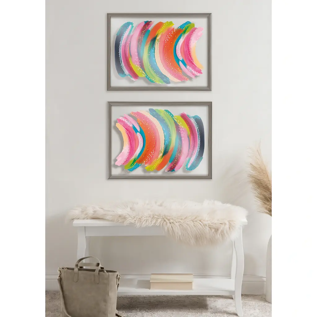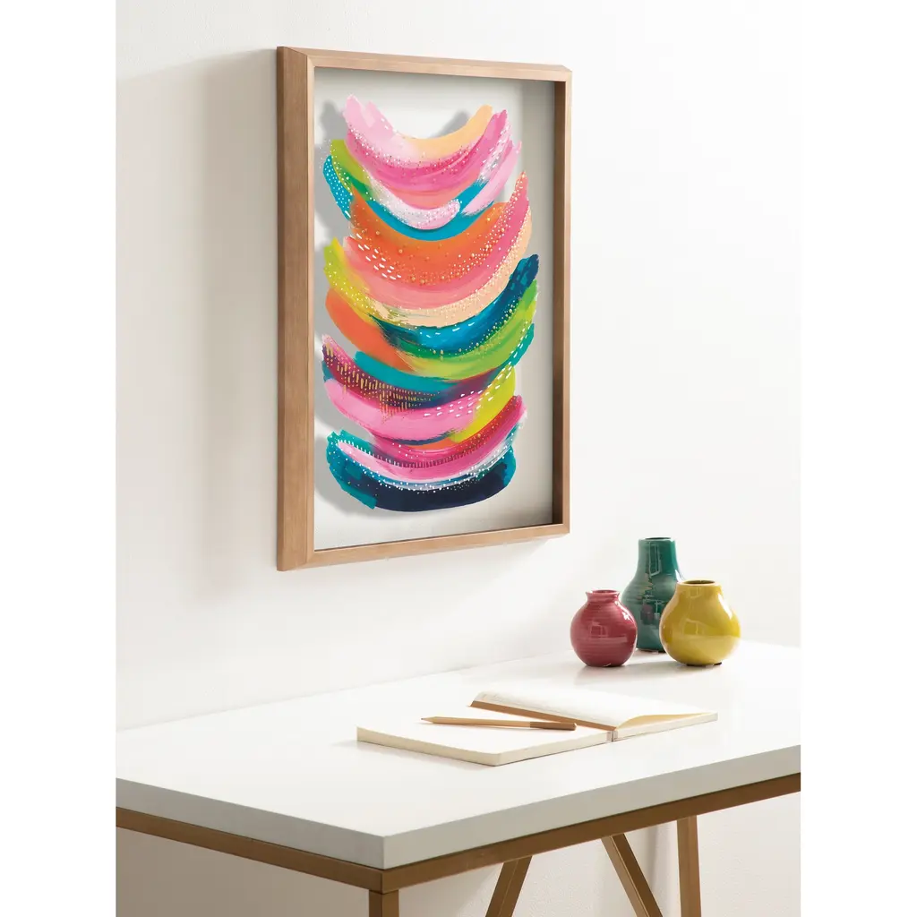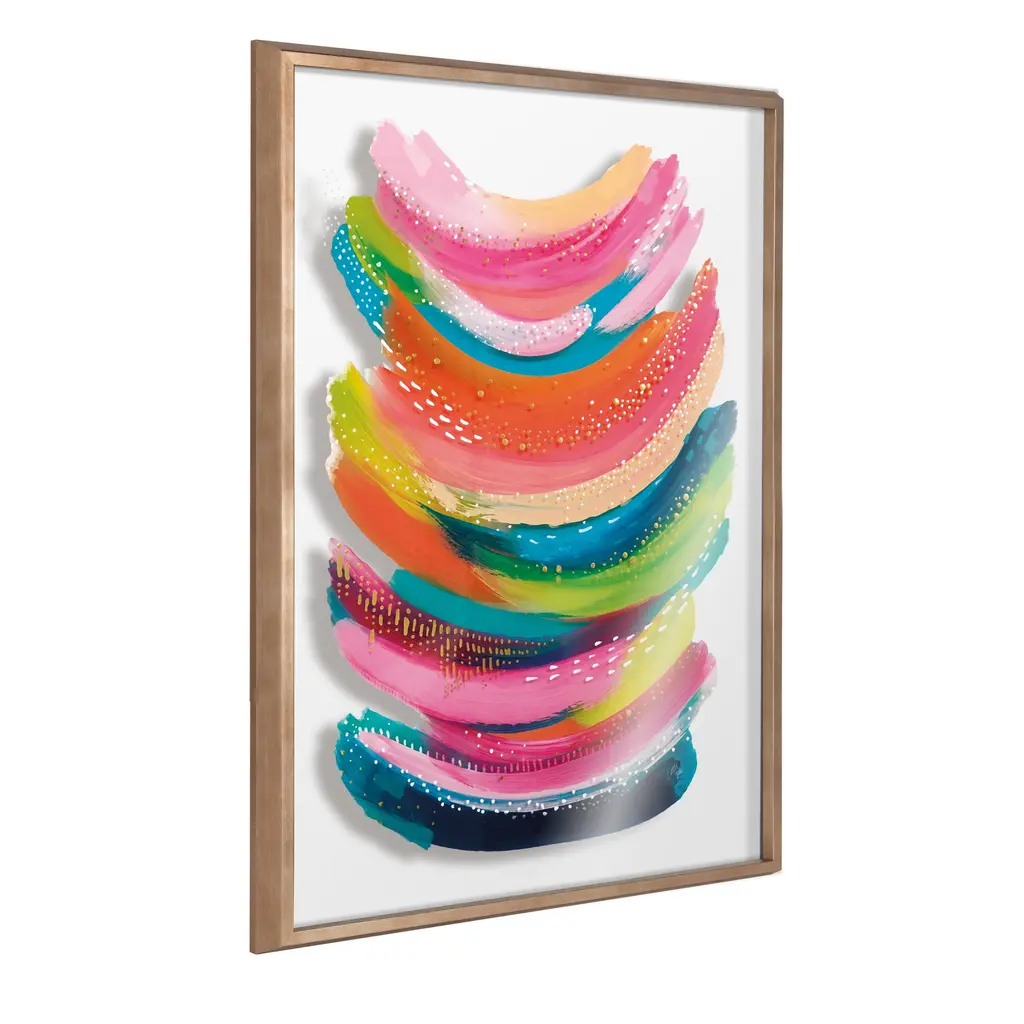 Add a burst of modern art to your home with the Kate and Laurel Blake 'Bright Abstract' Framed Glass Art by Ettavee. This unique artwork features a vibrant, multicolor abstract design printed directly on glass, creating a truly stunning piece. The brown frame adds a sleek touch to the modern style of the artwork. Jessi Raulet of EttaVee designed 'Bright Abstract', making it a one-of-a-kind addition to your decor. Measuring 24 inches high x 18 inches wide x 1.6 inches deep and equipped with 2 hangers, this framed glass art is ready to bring upscale, artistic style to your home.Features: