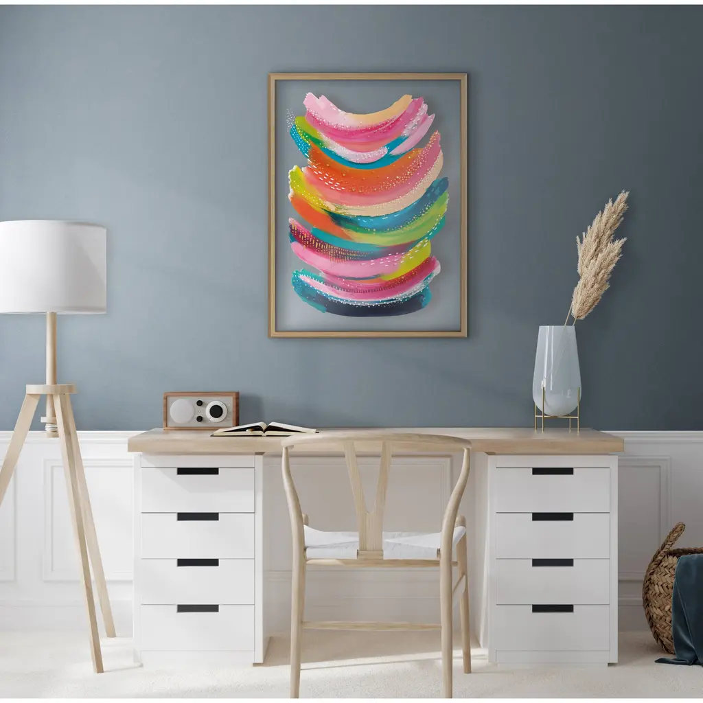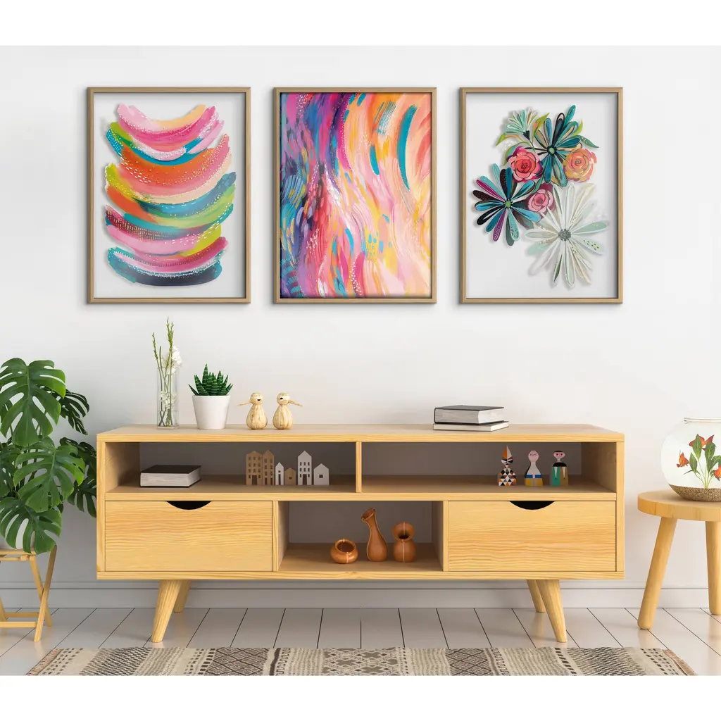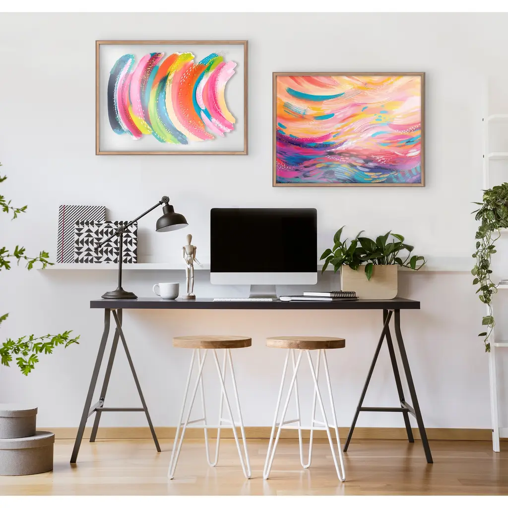 Add a burst of modern art to your home with the Kate and Laurel Blake 'Bright Abstract' Framed Glass Art by Ettavee. This unique artwork features a vibrant, multicolor abstract design printed directly on glass, creating a truly stunning piece. The brown frame adds a sleek touch to the modern style of the artwork. Jessi Raulet of EttaVee designed 'Bright Abstract', making it a one-of-a-kind addition to your decor. Measuring 24 inches high x 18 inches wide x 1.6 inches deep and equipped with 2 hangers, this framed glass art is ready to bring upscale, artistic style to your home.Features: