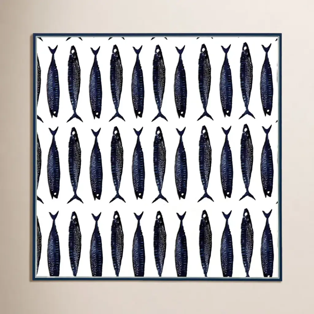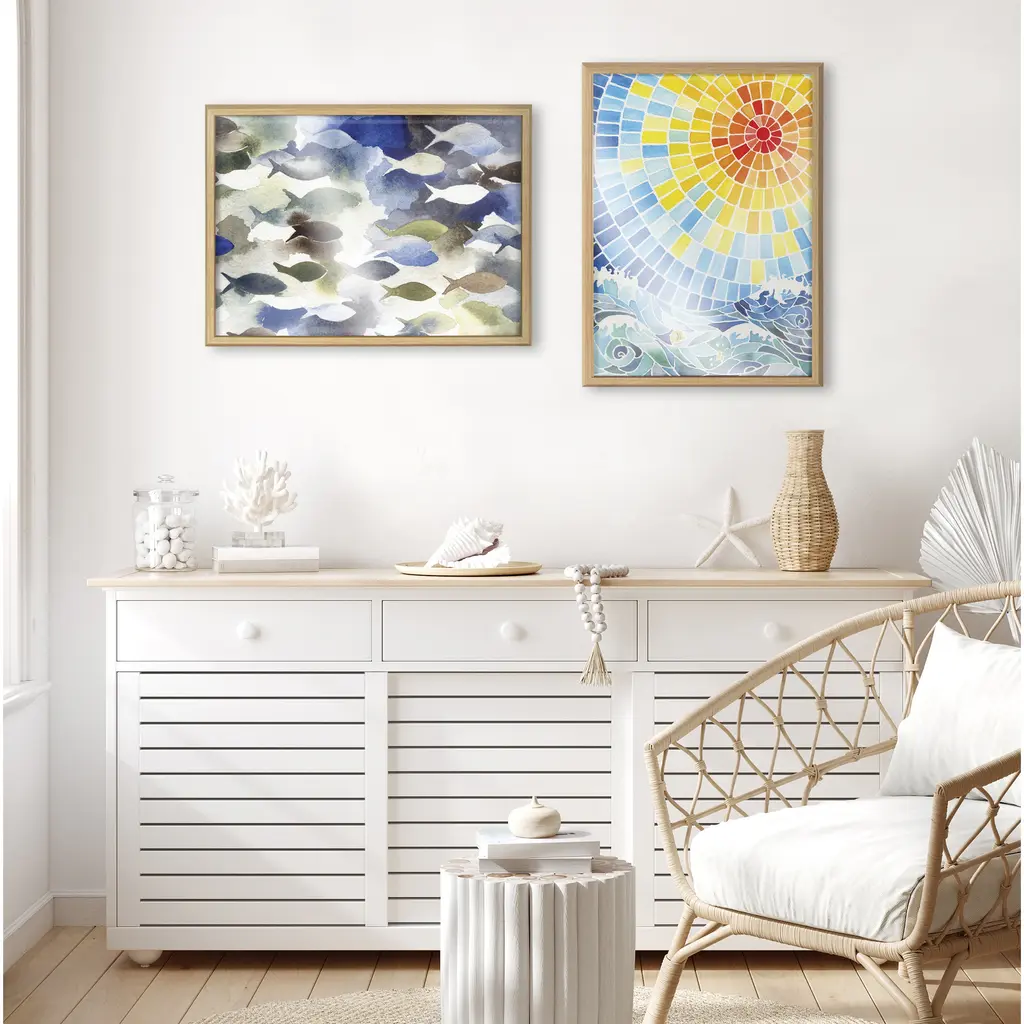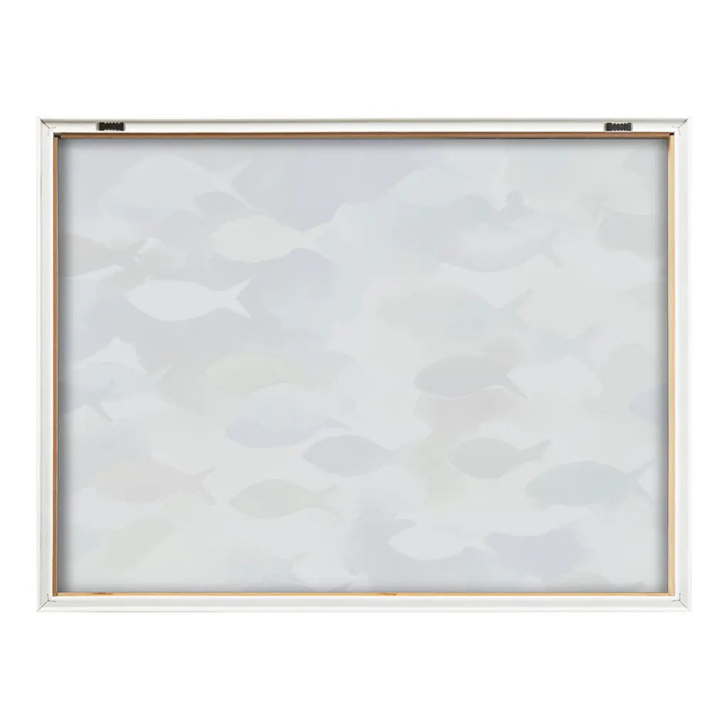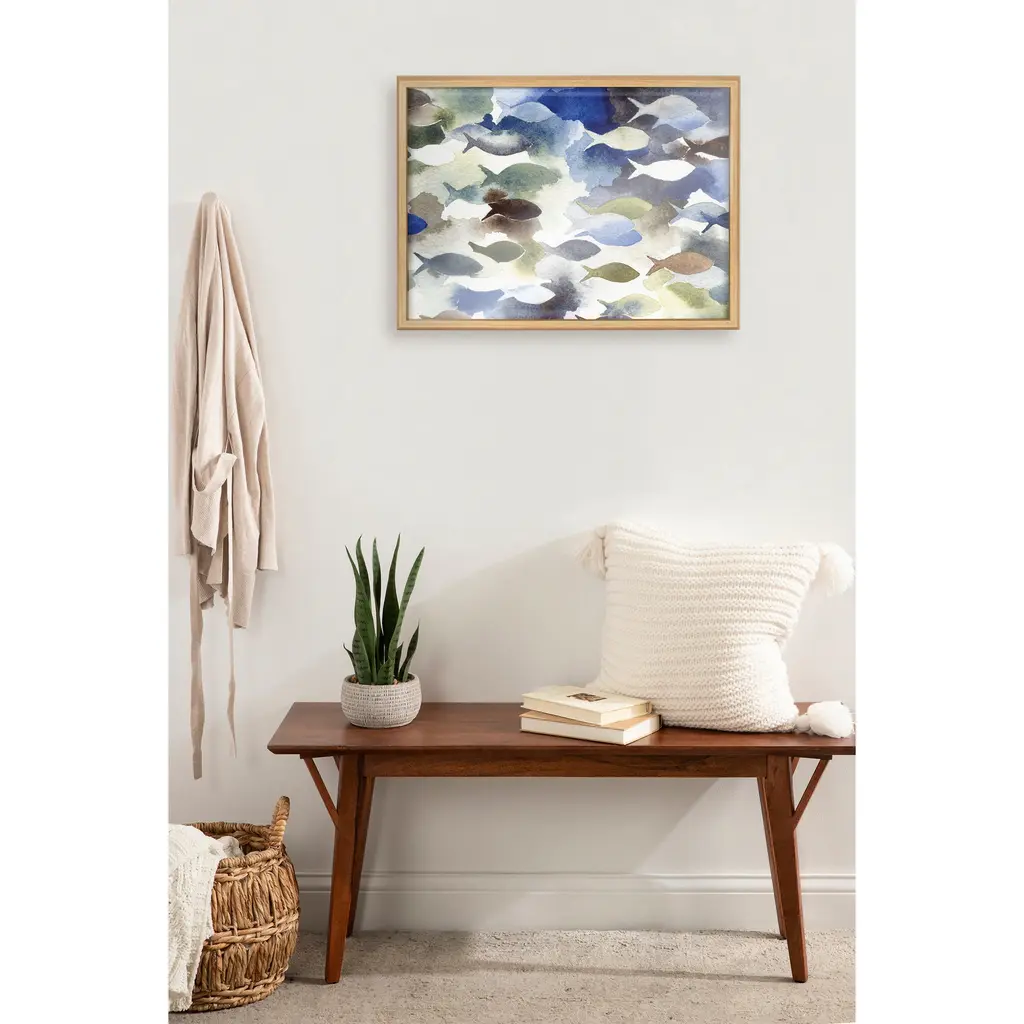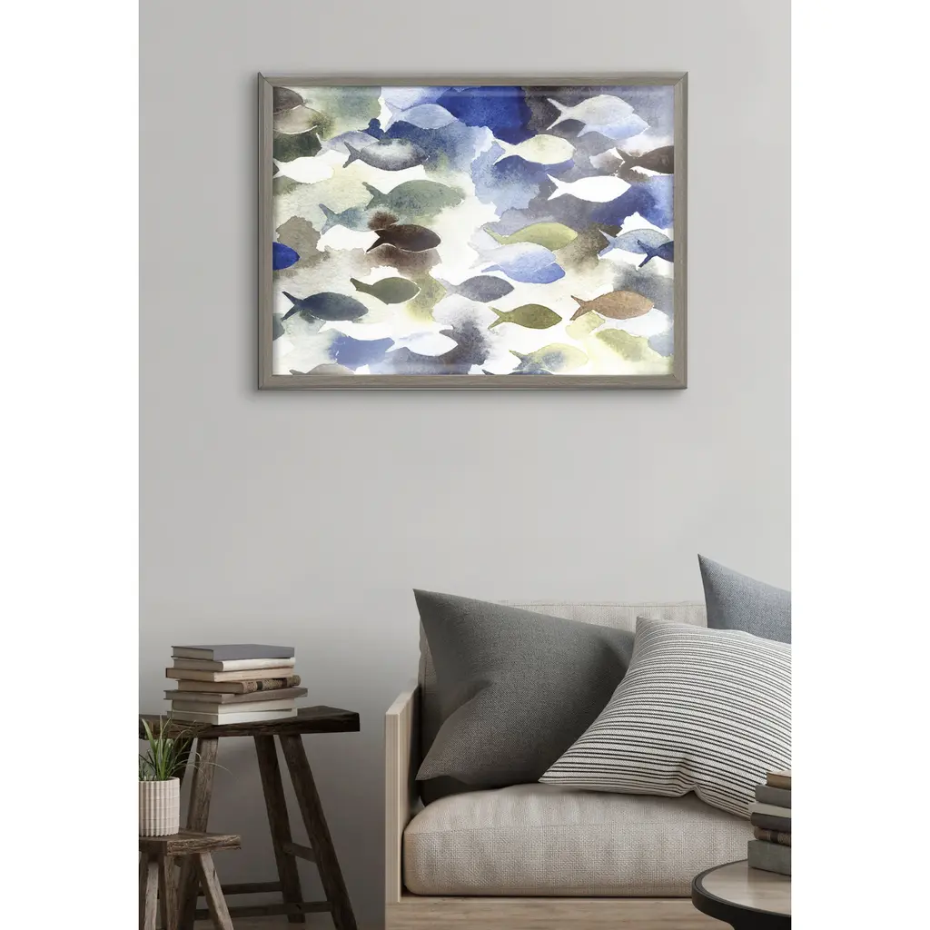Immerse yourself in the cool camaraderie of this adorable school of fish in this bold blue art print. Framed in the USA in Waunakee, Wisconsin, this glass art will be a pleasure to look at every day in your living room, bedroom, nursery, or any room in the home. This art print also makes an excellent gift for birthdays, holidays, or house-warming parties. Printed on glass and framed with a lightweight polystyrene frame, this wall art is easy to display on the wall. The outer dimensions are 18 inches by 24 inches. Print Name: "Concurrent"