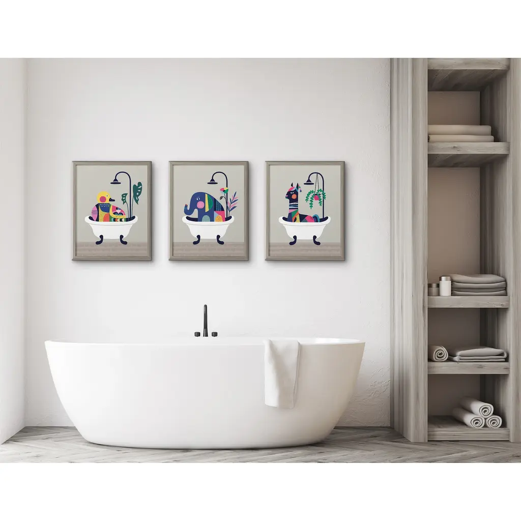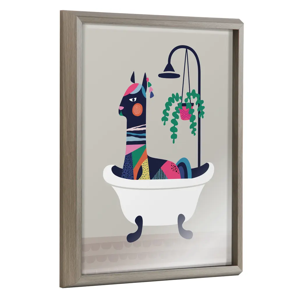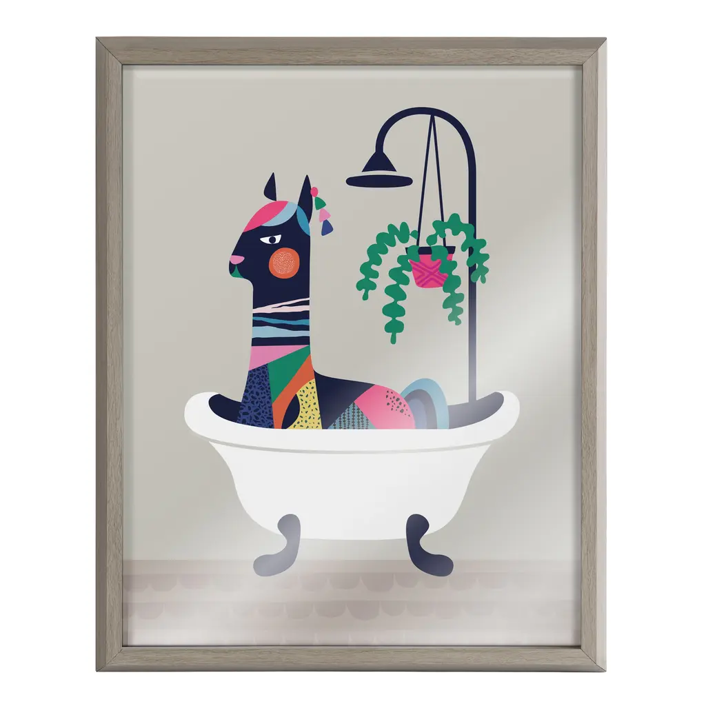 Get your little ones ready for bathtime with this adorable wall art that's perfect for the bathroom! Framed in a sleek modern frame, this contemporary design is the perfect art piece to add to your home decor collection. Printed and framed in the USA in Waunakee, Wisconsin, this printed glass art will be a pleasure to look at every day in your bathroom, bedroom, nursery, or powder room. This print also makes an excellent gift for a birthday, holiday, or house-warming party. It also has two hangers already attached for easy wall display. The outer dimensions are 20 inches by 16 inches. Print Name: "Mid Century Modern Llama in the Tub"