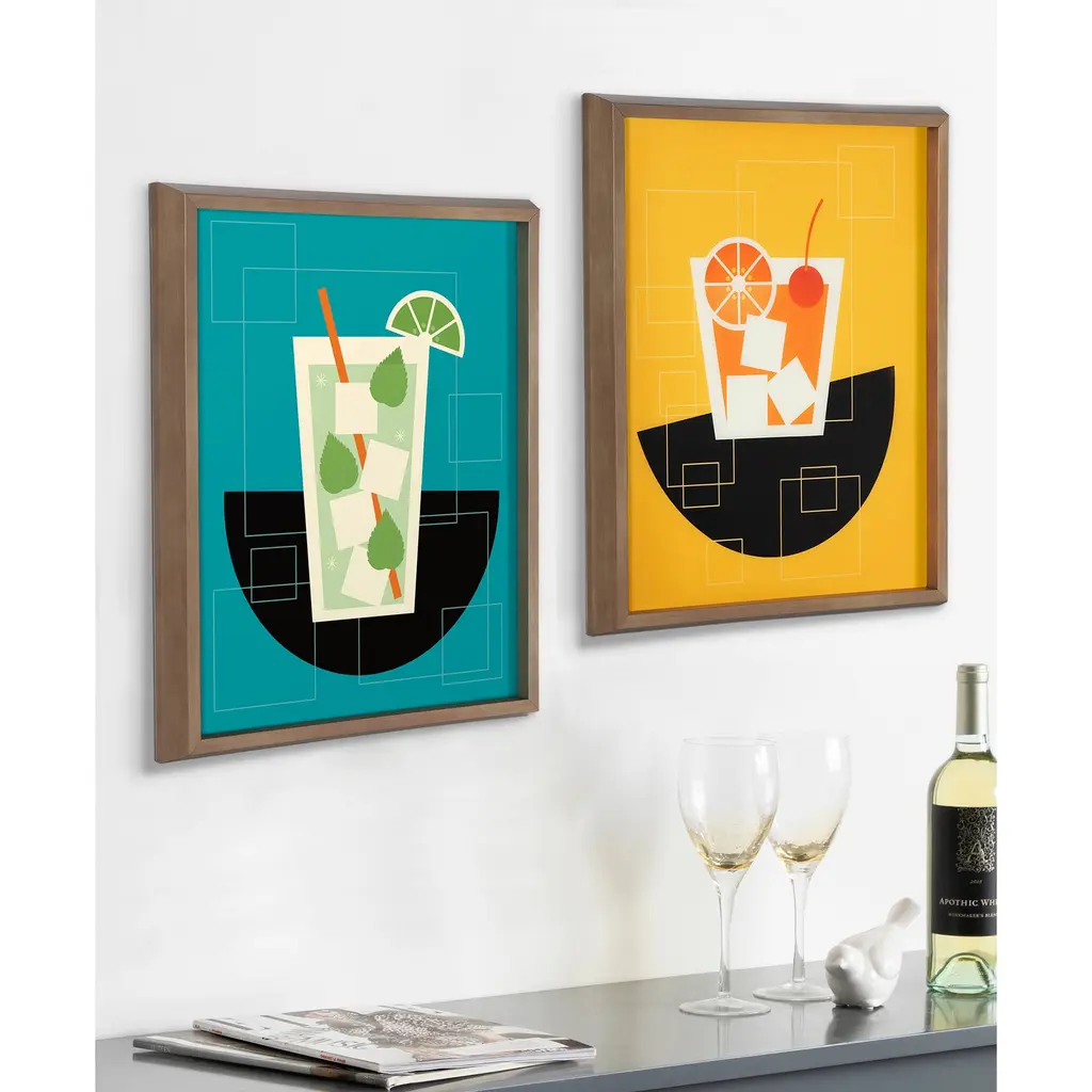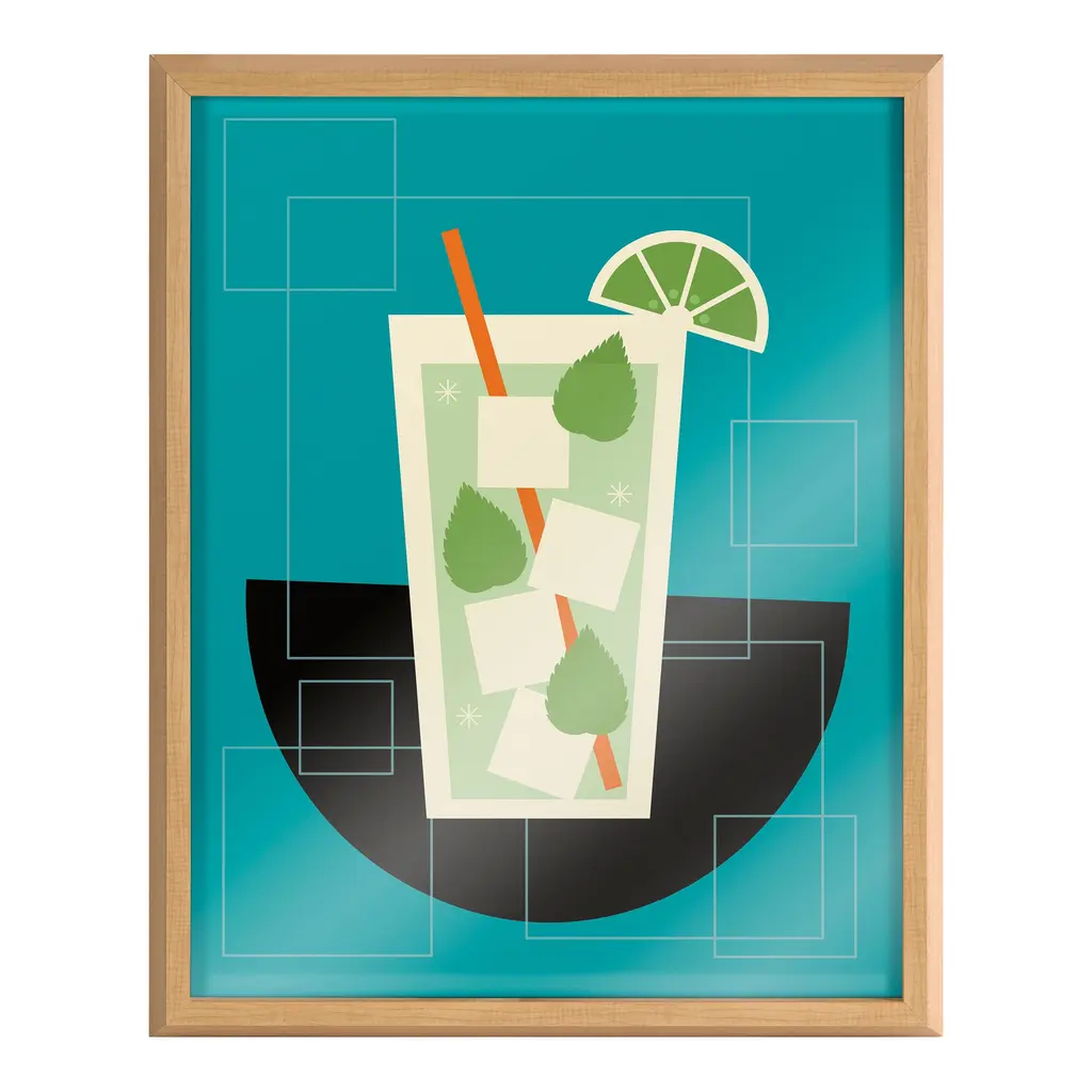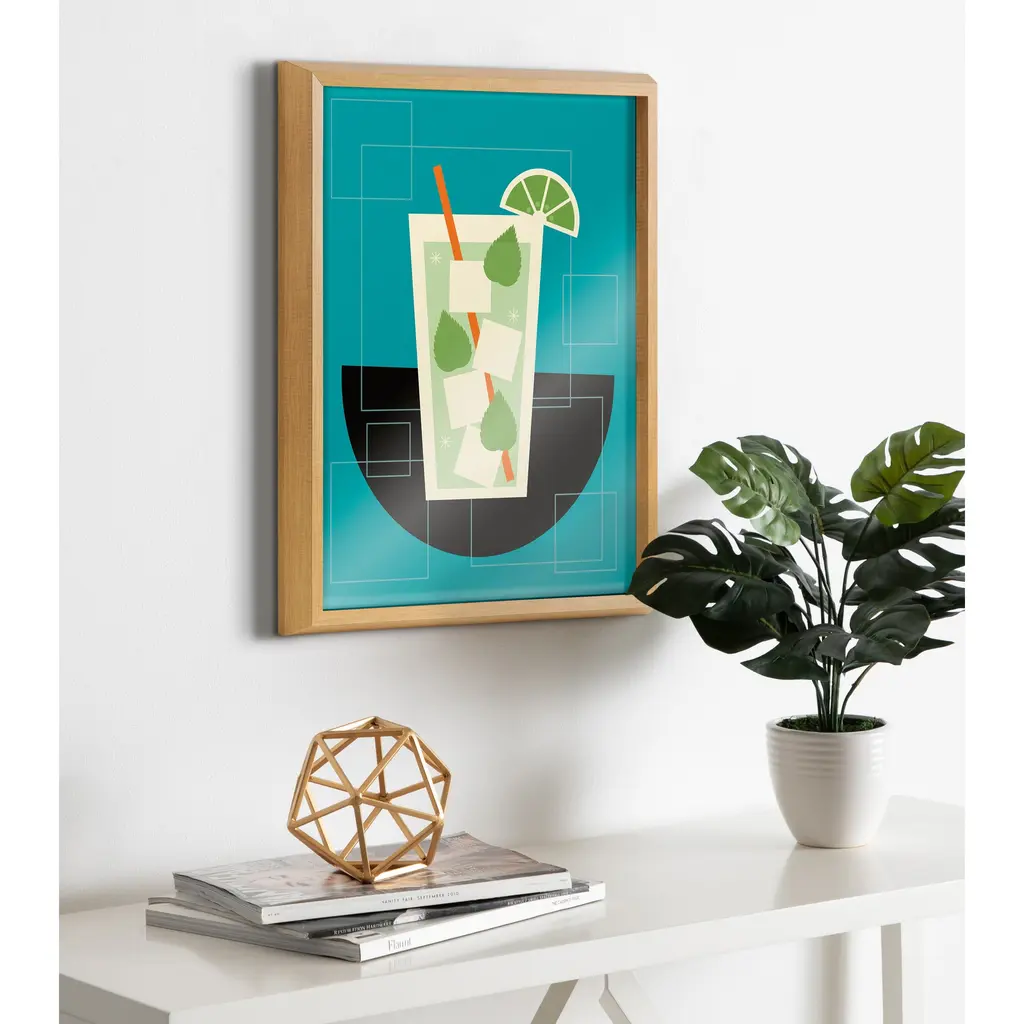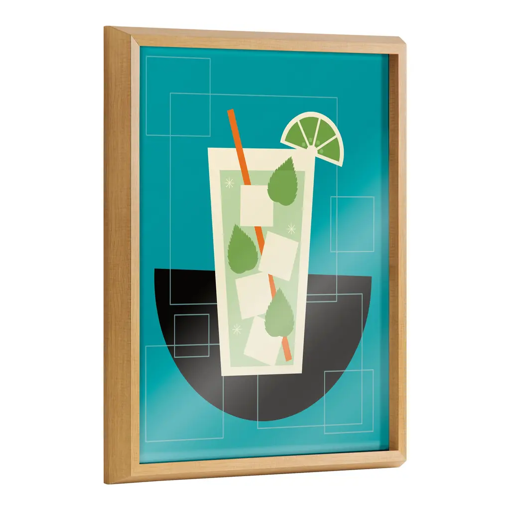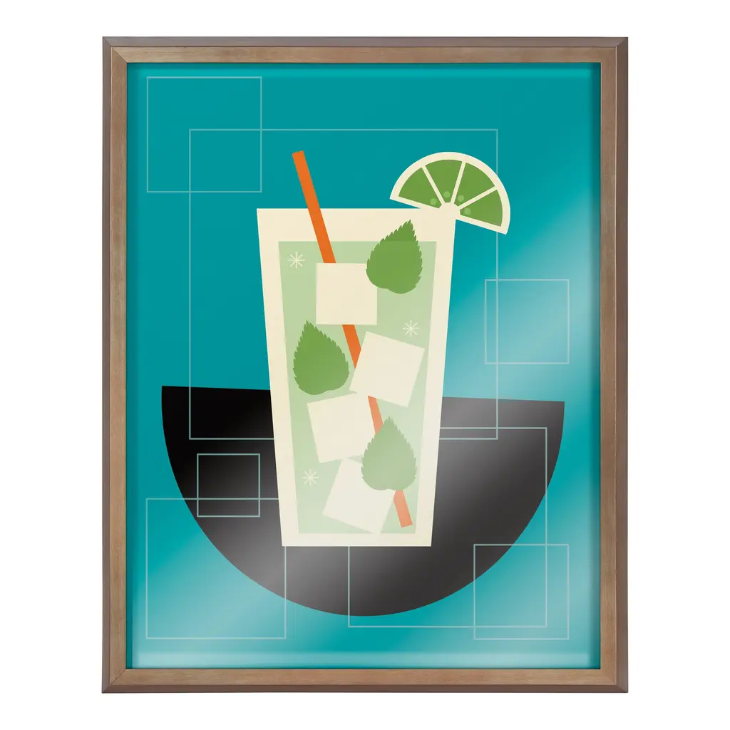 Clock out of work because it's time for cocktails! This decorative mojito print is a fantastic addition to any bar or entertaining area. Framed in a sleek modern frame, this contemporary design is the perfect art piece to add to your home decor collection. Printed and framed in the USA in Waunakee, Wisconsin, this printed glass art will be a pleasure to look at every day in your living room, bar, kitchen, man cave, or she-shed. This print also makes an excellent gift for a birthday, holiday, or house-warming party. It also has two hangers already attached for easy wall display. The outer dimensions are 20 inches by 16 inches. Print Name: "Mojito"