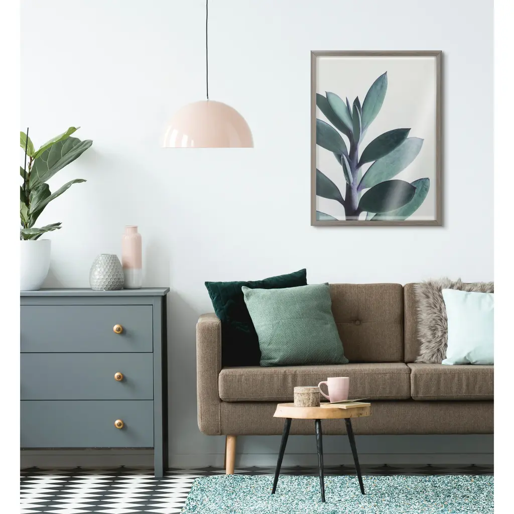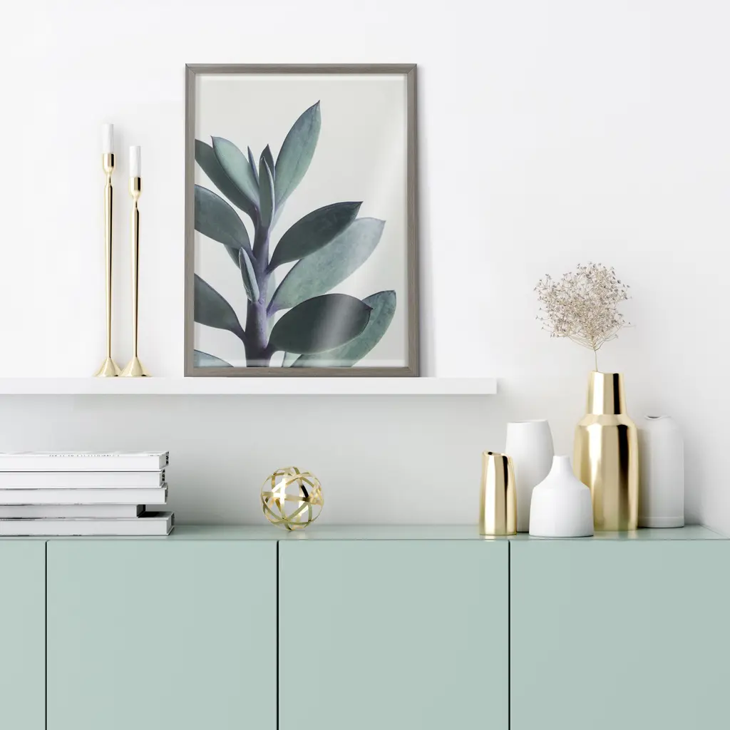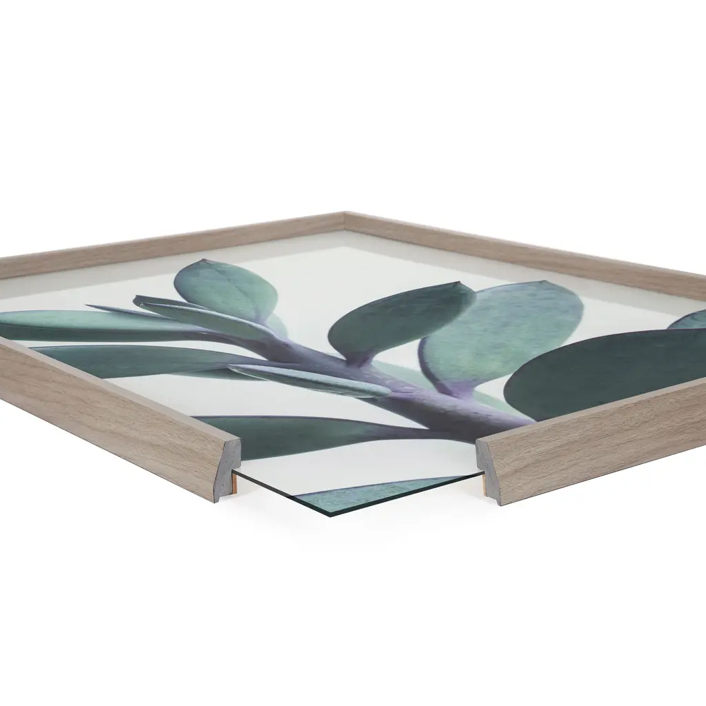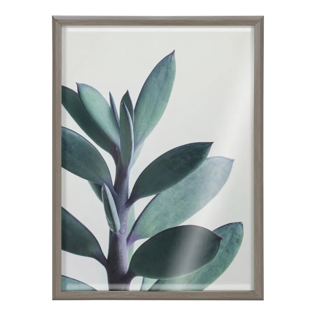 Display this decorative succulent art on your wall to bring a little life into your home. Framed in a sleek modern frame, this contemporary design is the perfect art piece to add to your home decor collection. Printed and framed in the USA in Waunakee, Wisconsin, this printed glass art will be a pleasure to look at every day in your living room, bedroom, office, or any room in the home. This print also makes an excellent gift for a birthday, holiday, or house-warming. It also has two hangers already attached for easy wall display. The outer dimensions are 24 inches by 18 inches. Print Name: "Senecio 1"