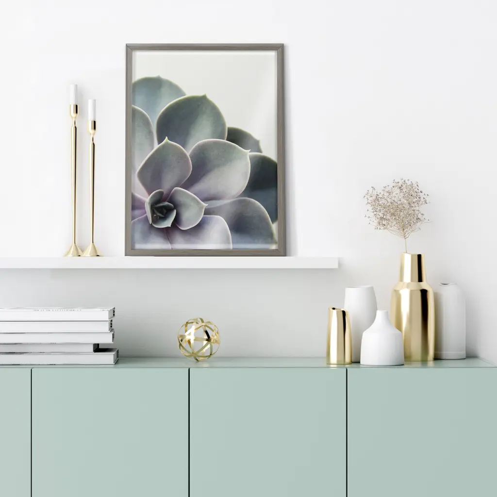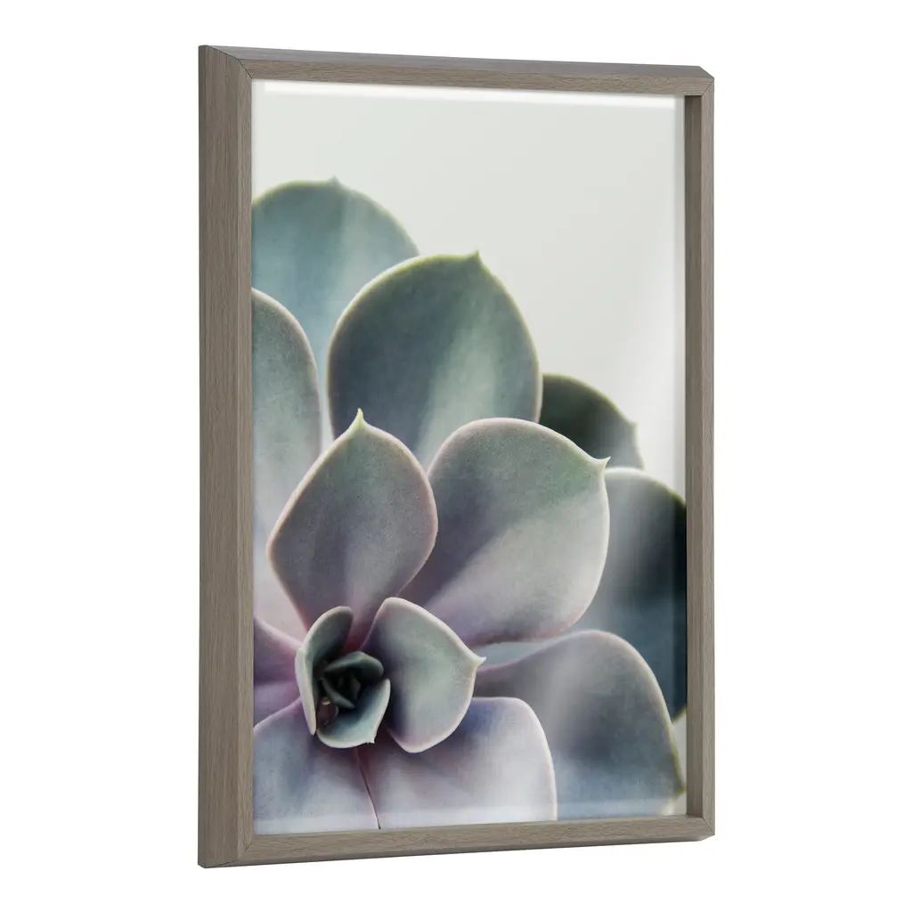 This sophisticated art print is perfect for adding greenery to your home with zero maintenance. Framed in a sleek modern frame, this contemporary design is the perfect art piece to add to your home decor collection. Printed and framed in the USA in Waunakee, Wisconsin, this printed glass art will be a pleasure to look at every day in your living room, bedroom, office, or any room in the home. This print also makes an excellent gift for a birthday, holiday, or house-warming. It also has two hangers already attached for easy wall display. The outer dimensions are 24 inches by 18 inches. Print Name: "Succulent 5"