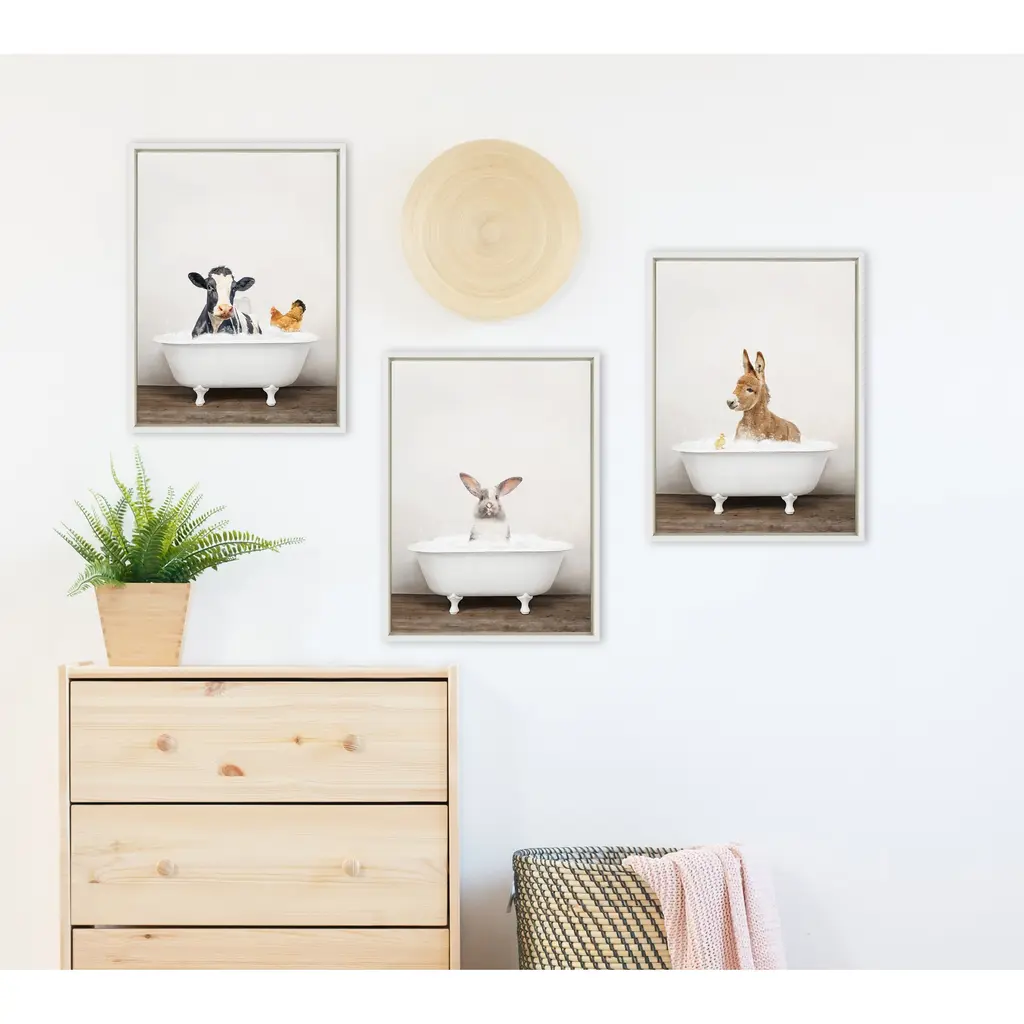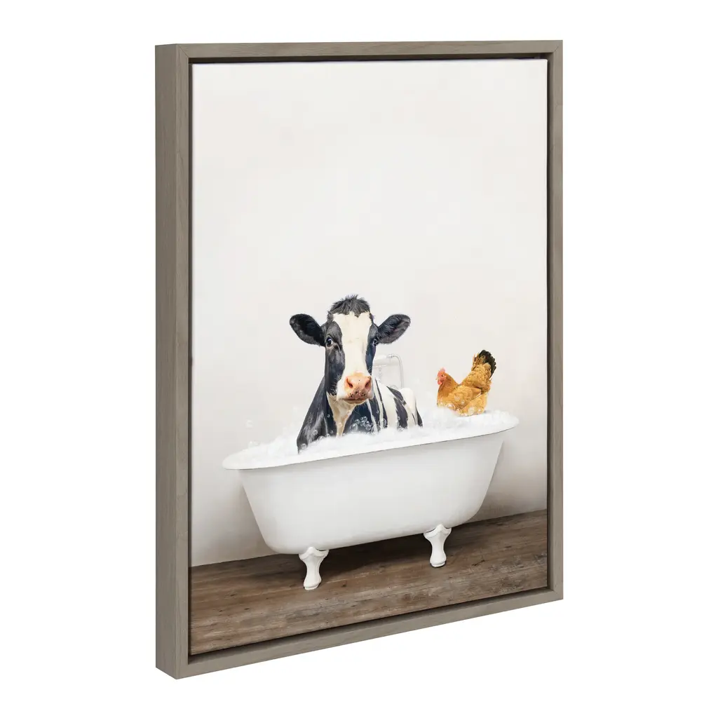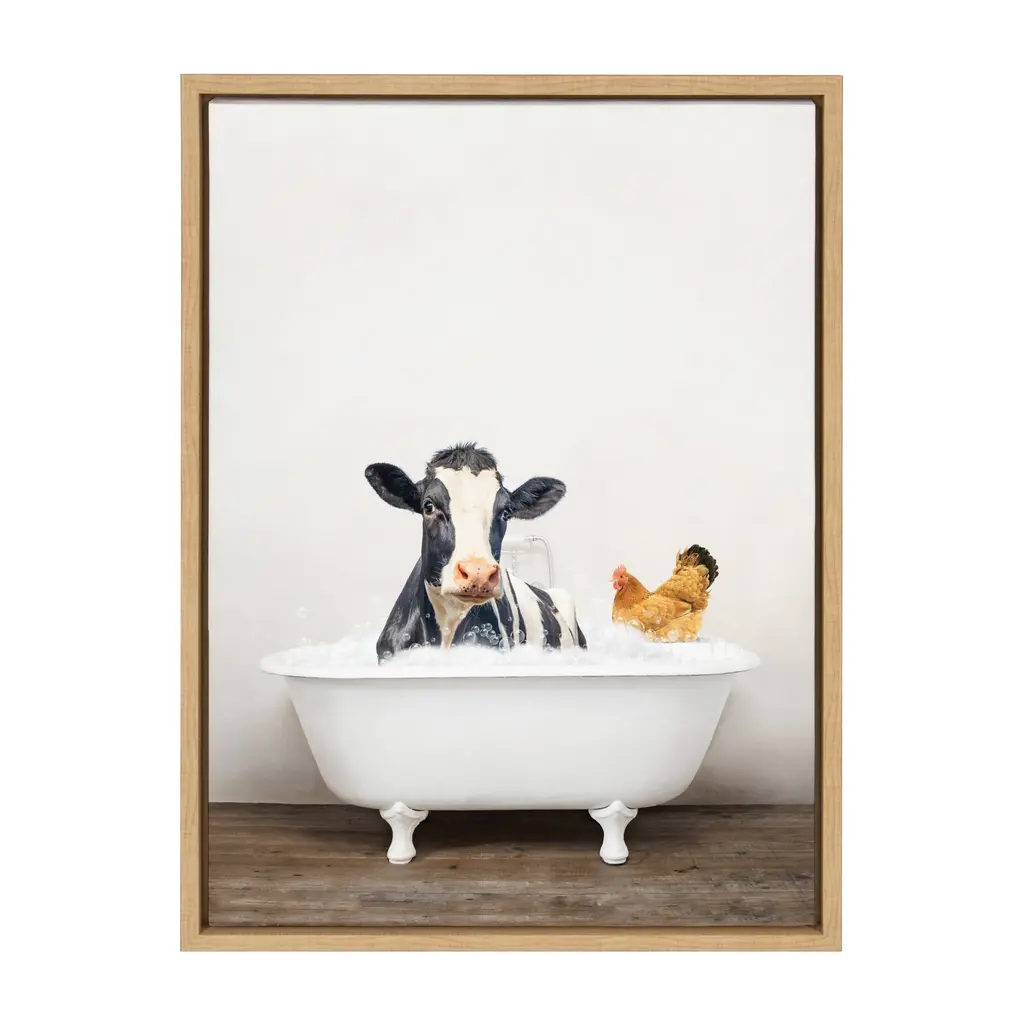 Make a bold impression on your house guests with this whimsical animal art piece by artist Amy Peterson. With its sleek modern frame, this fun, contemporary design is the perfect art piece to add to your home decor collection. Framed in the USA in Waunakee, Wisconsin, this floating canvas art will be a pleasure to look at every day in your living room, bedroom, nursery, or any room in the home. This art print also makes an excellent gift for birthdays, holidays, or house-warming parties. Printed on gallery-wrapped canvas and framed with a lightweight polystyrene frame, this wall art is easy to display on the wall. The outer dimensions are 18 inches by 24 inches by 1.6 inches. Print Name: "Cow and Chicken in Rustic Bath"