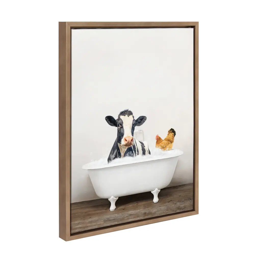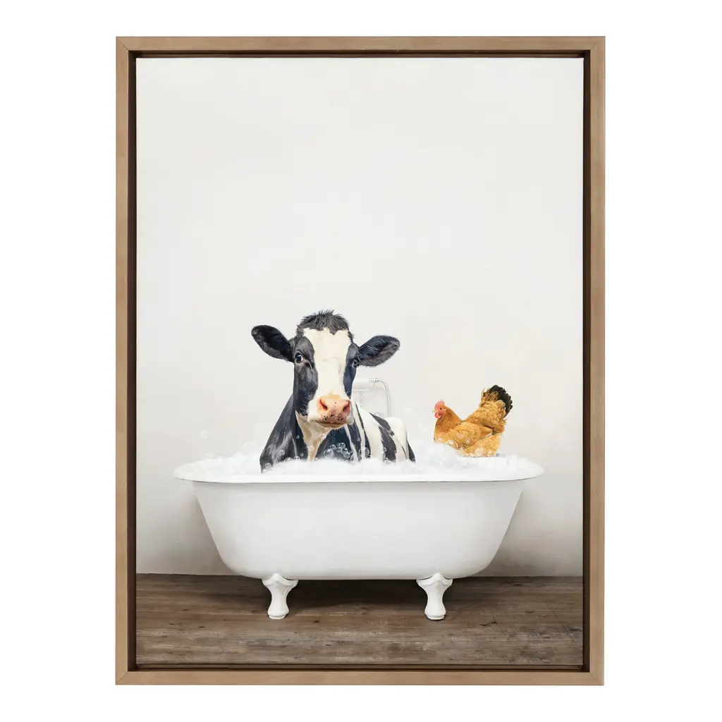 Make a bold impression on your house guests with this whimsical animal art piece by artist Amy Peterson. With its sleek modern frame, this fun, contemporary design is the perfect art piece to add to your home decor collection. Framed in the USA in Waunakee, Wisconsin, this floating canvas art will be a pleasure to look at every day in your living room, bedroom, nursery, or any room in the home. This art print also makes an excellent gift for birthdays, holidays, or house-warming parties. Printed on gallery-wrapped canvas and framed with a lightweight polystyrene frame, this wall art is easy to display on the wall. The outer dimensions are 18 inches by 24 inches by 1.6 inches. Print Name: "Cow and Chicken in Rustic Bath"