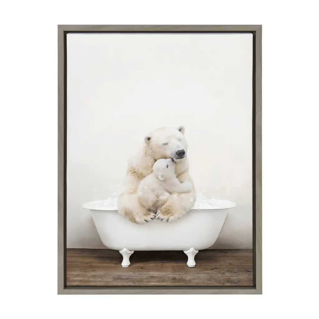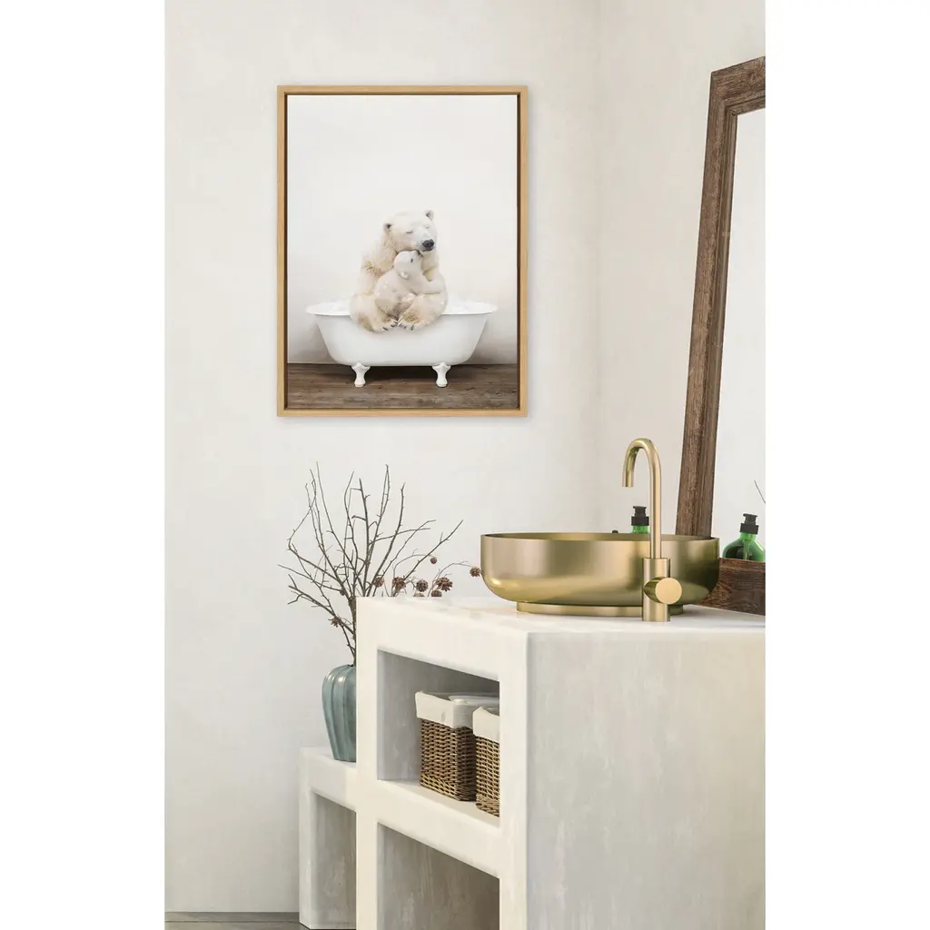Make a bold impression on your house guests with this whimsical animal art piece by artist Amy Peterson. With its sleek modern frame, this fun, contemporary design is the perfect art piece to add to your home decor collection. Framed in the USA in Waunakee, Wisconsin, this floating canvas art will be a pleasure to look at every day in your living room, bedroom, nursery, or any room in the home. This art print also makes an excellent gift for birthdays, holidays, or house-warming parties. Printed on gallery-wrapped canvas and framed with a lightweight polystyrene frame, this wall art is easy to display on the wall. The outer dimensions are 18 inches by 24 inches by 1.6 inches. Print Name: "Mother and Baby Polar Bear in Rustic Bath"