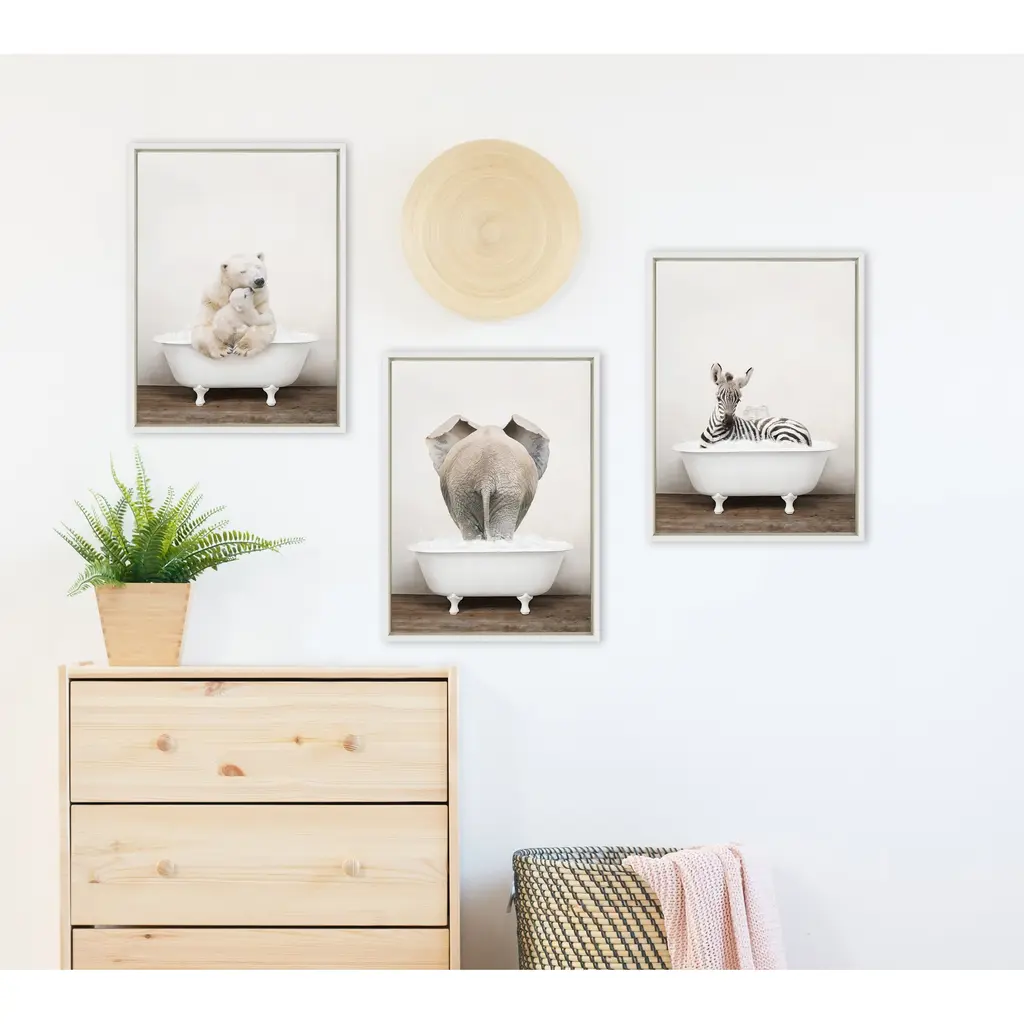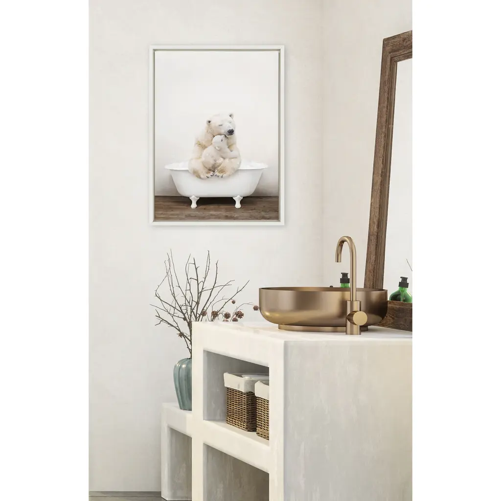 Make a bold impression on your house guests with this whimsical animal art piece by artist Amy Peterson. With its sleek modern frame, this fun, contemporary design is the perfect art piece to add to your home decor collection. Framed in the USA in Waunakee, Wisconsin, this floating canvas art will be a pleasure to look at every day in your living room, bedroom, nursery, or any room in the home. This art print also makes an excellent gift for birthdays, holidays, or house-warming parties. Printed on gallery-wrapped canvas and framed with a lightweight polystyrene frame, this wall art is easy to display on the wall. The outer dimensions are 18 inches by 24 inches by 1.6 inches. Print Name: "Mother and Baby Polar Bear in Rustic Bath"