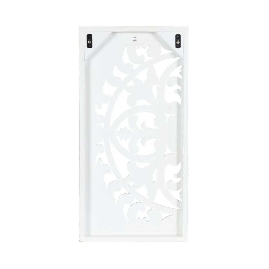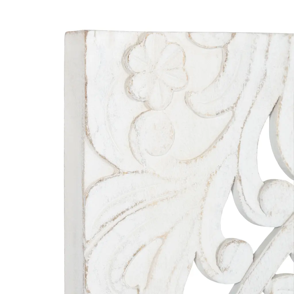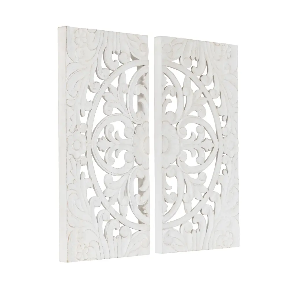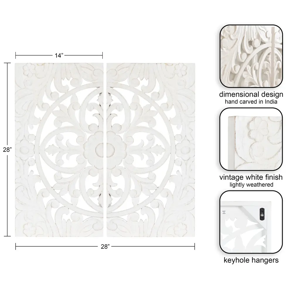 Add a layer of texture and dimension to any room in your house with this beautiful, hand-carved Saanvi wall plaque art set. This is the perfect option for someone looking for a unique pattern that stands out from the wall. The soft white finish helps this set meld well with various design styles. The pattern of the Saanvi wooden wall art set was hand-carved by dedicated artisans in India. This makes each Saanvi piece one-of-a-kind due to slight variations that bring additional character to the pieces of this set. Each of the plaques measures 14 inches wide by 28 inches high to create a substantial statement piece on your wall. Place it in your living room to add a natural wall piece that flows effortlessly with everything from your tables to couches to your hardwood floors! Or, showcase it in your bedroom above your headboard for a textural headliner. The carved pattern evokes traditional detailing while the soft white finish allows it to flow well with various decor schemes or room uses.
