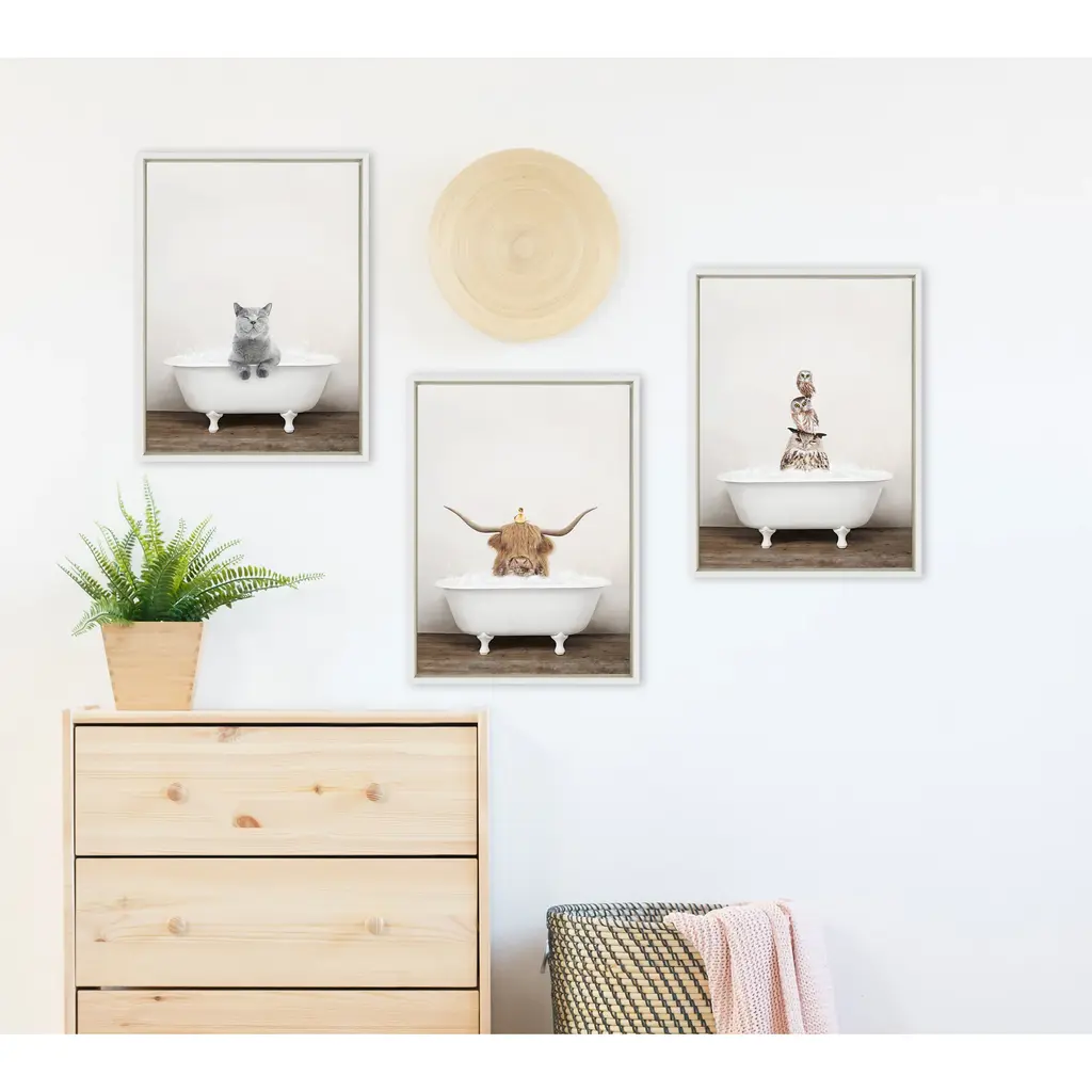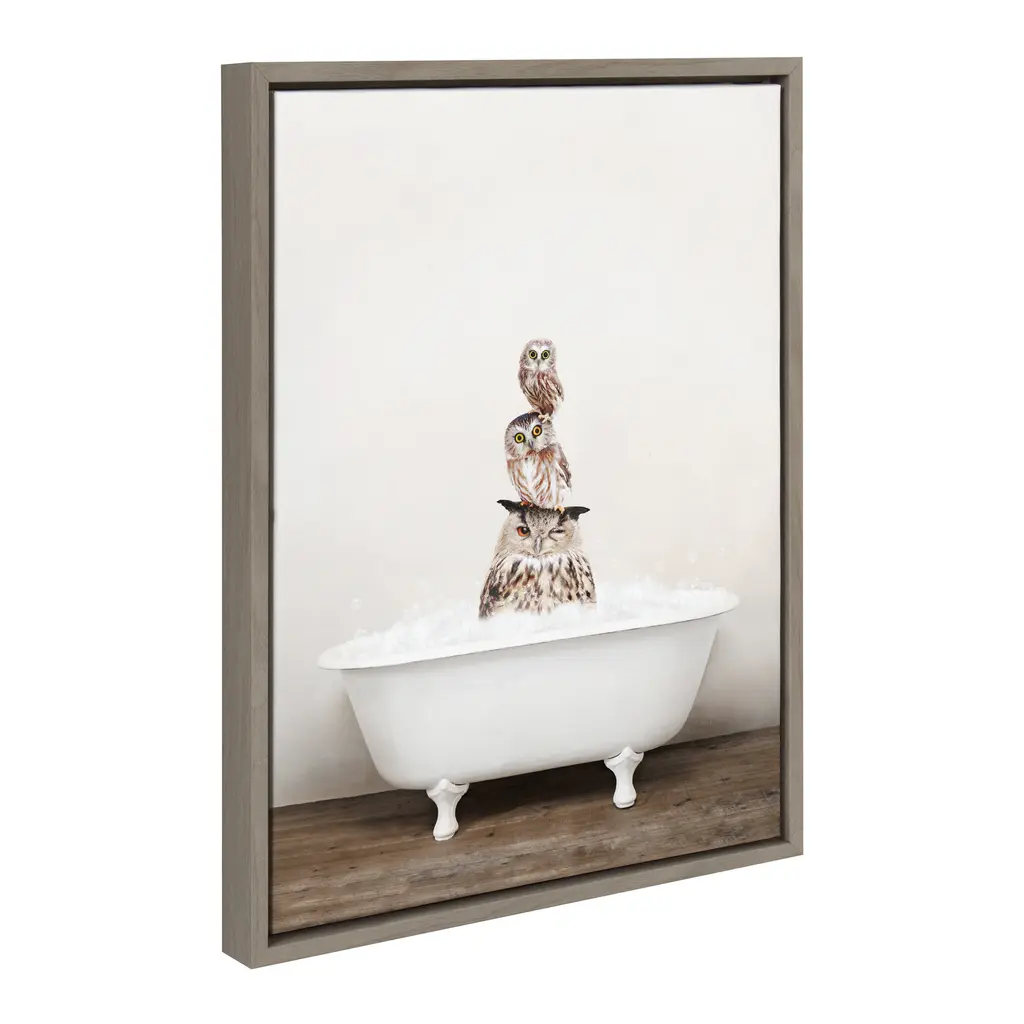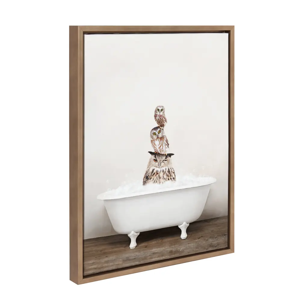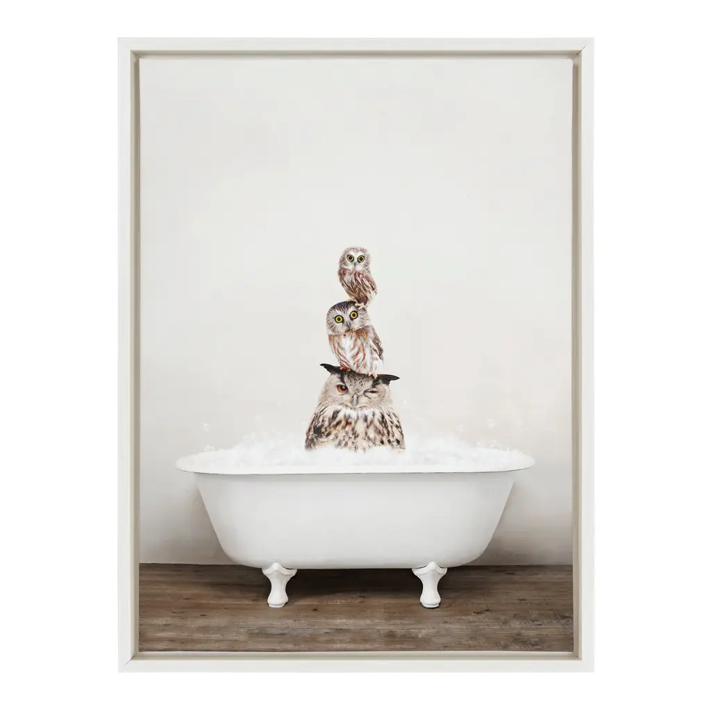 Make a bold impression on your house guests with this whimsical animal art piece by artist Amy Peterson. With its sleek modern frame, this fun, contemporary design is the perfect art piece to add to your home decor collection. Framed in the USA in Waunakee, Wisconsin, this floating canvas art will be a pleasure to look at every day in your living room, bedroom, nursery, or any room in the home. This art print also makes an excellent gift for birthdays, holidays, or house-warming parties. Printed on gallery-wrapped canvas and framed with a lightweight polystyrene frame, this wall art is easy to display on the wall. The outer dimensions are 18 inches by 24 inches by 1.6 inches. Print Name: "Stacked Owls in Rustic Bath"