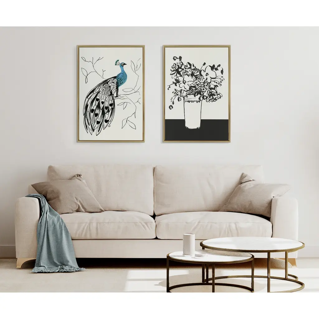 Show the unique eccentricities of your style with this striking and avant-garde peacock art print from SnazzyHues. Framed in a sleek modern frame, this contemporary design is the perfect art piece to add to your home decor collection. Printed and framed in the USA in Waunakee, Wisconsin, this framed linen textured canvas art will be a pleasure to look at every day in your living room, bedroom, office, or any room in the home. This art print also makes an excellent gift for a birthday, holiday, or house-warming. It has two hangers already attached for easy wall display. The outer dimensions are 33 inches by 23 inches by 1.6 inches. Print Name: "658 Peacock"