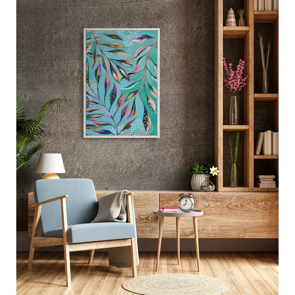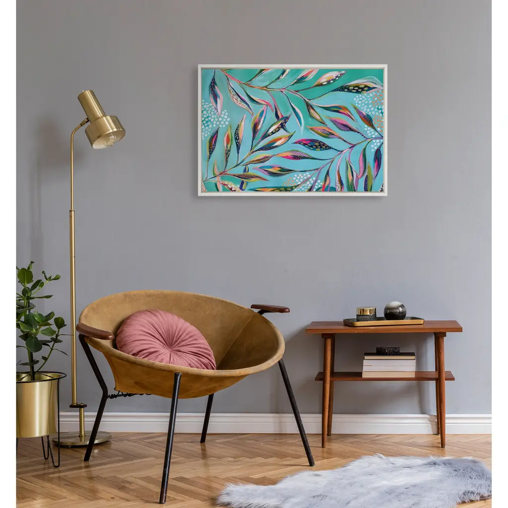 Provide your space with a soothing, colorful accent piece by Jessi Raulet of Ettavee. Portraying strings of leaves floating atop the water, this lovely framed canvas print brings lovely shades of blues and greens into your home. Framed in the USA in Waunakee, Wisconsin, this floating canvas art will be a pleasure to look at every day in your living room, bedroom, nursery, or any room in the home. This art print also makes an excellent gift for birthdays, holidays, or house-warming parties. Printed on gallery-wrapped canvas and framed with a lightweight polystyrene frame, this wall art is easy to display on the wall. The outer dimensions are 23 inches by 33 inches by 1.6 inches. Print Name: "A Tranquil Moment"