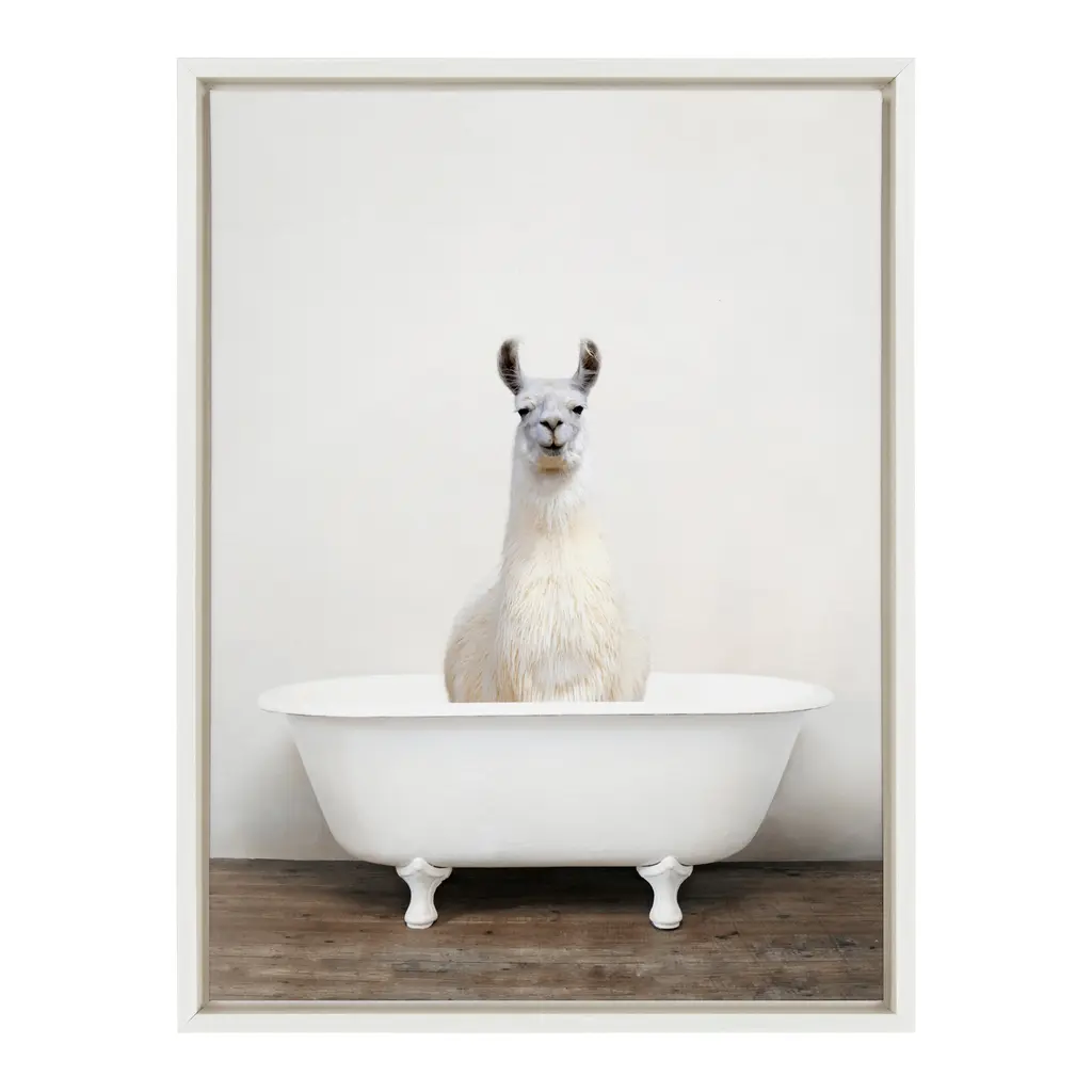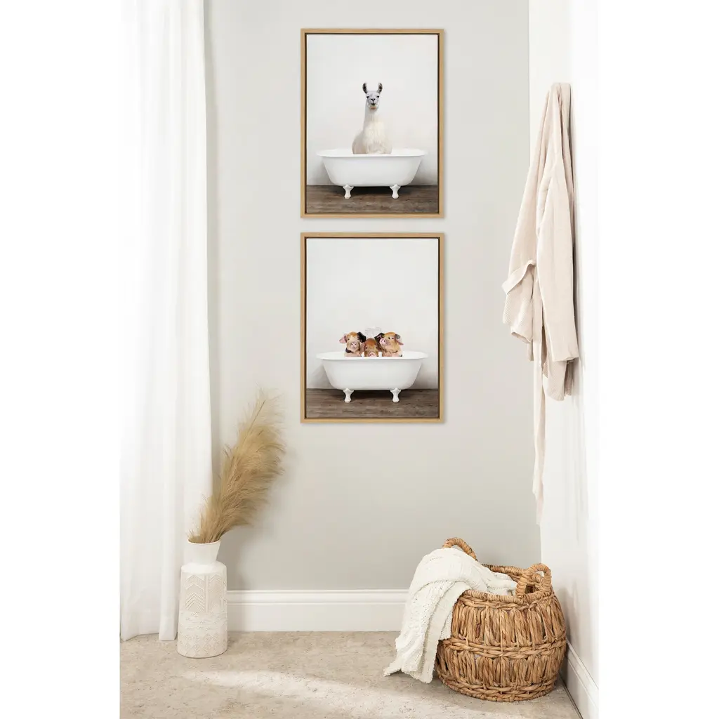 Splish splash, this little Animal's taking a bath! Framed in the USA in Waunakee, Wisconsin, this floating canvas art will be a pleasure to look at every day in your living room, bedroom, nursery, or any room in the home. Printed on gallery-wrapped canvas and framed with a lightweight polystyrene frame, this wall art has two hangers already attached to the MDF back for easy wall display. Print Name: "Animal in the Tub Color"