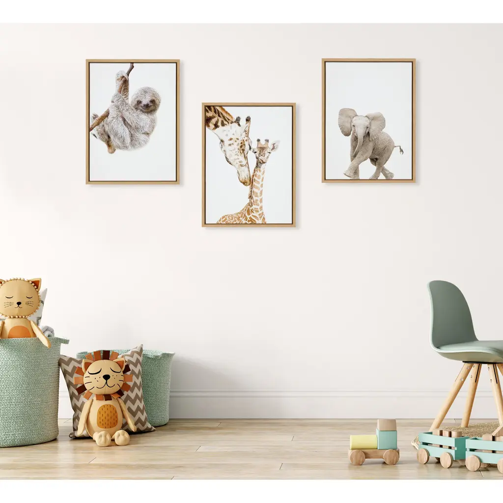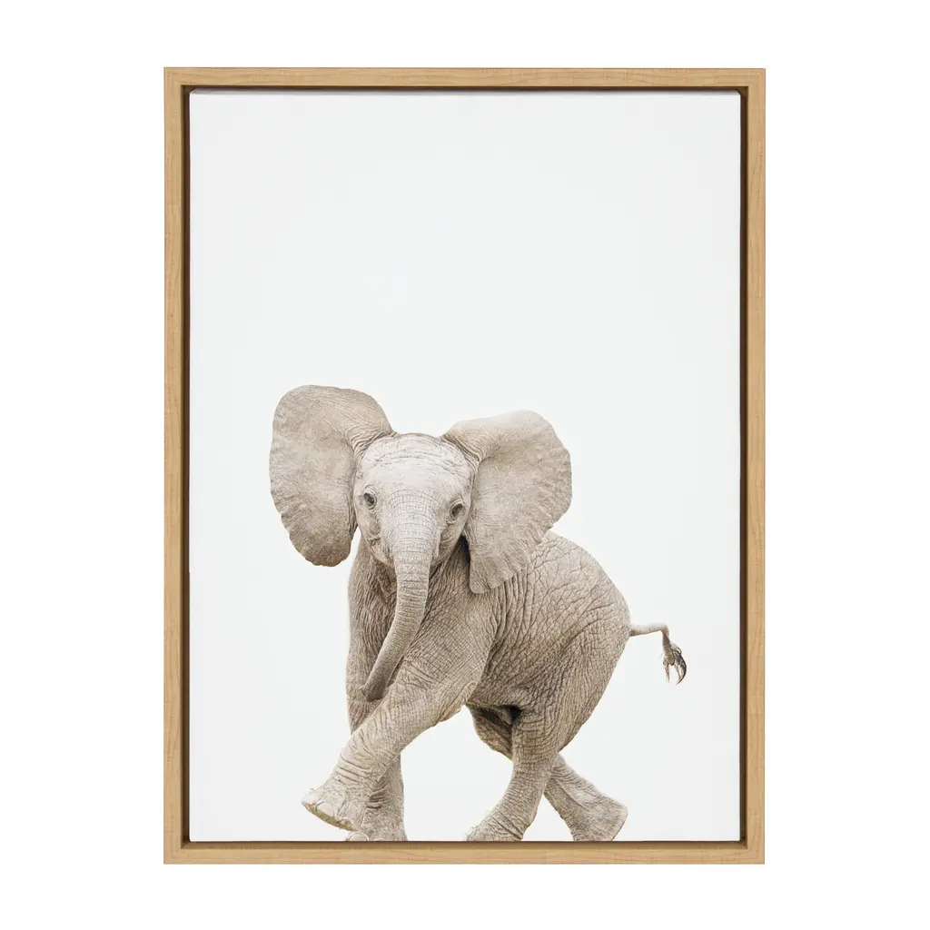 Provide your space with some whimsical appeal with this baby elephant portrait. This lovely, light piece by Amy Peterson Art Studio is perfect for any animal lover. Framed in the USA in Waunakee, Wisconsin, this floating canvas art will be a pleasure to look at every day in your living room, bedroom, nursery, or any room in the home. This art print also makes an excellent gift for birthdays, holidays, or house-warming parties. Printed on gallery-wrapped canvas and framed with a lightweight polystyrene frame, this wall art is easy to display on the wall. The outer dimensions are 18 inches by 24 inches by 1.6 inches. Print Name: "Baby Elephant Walk"