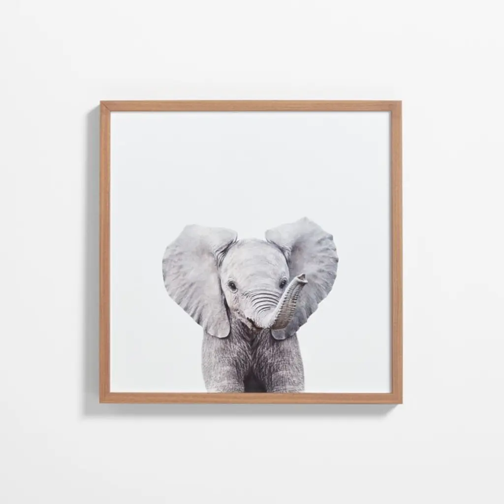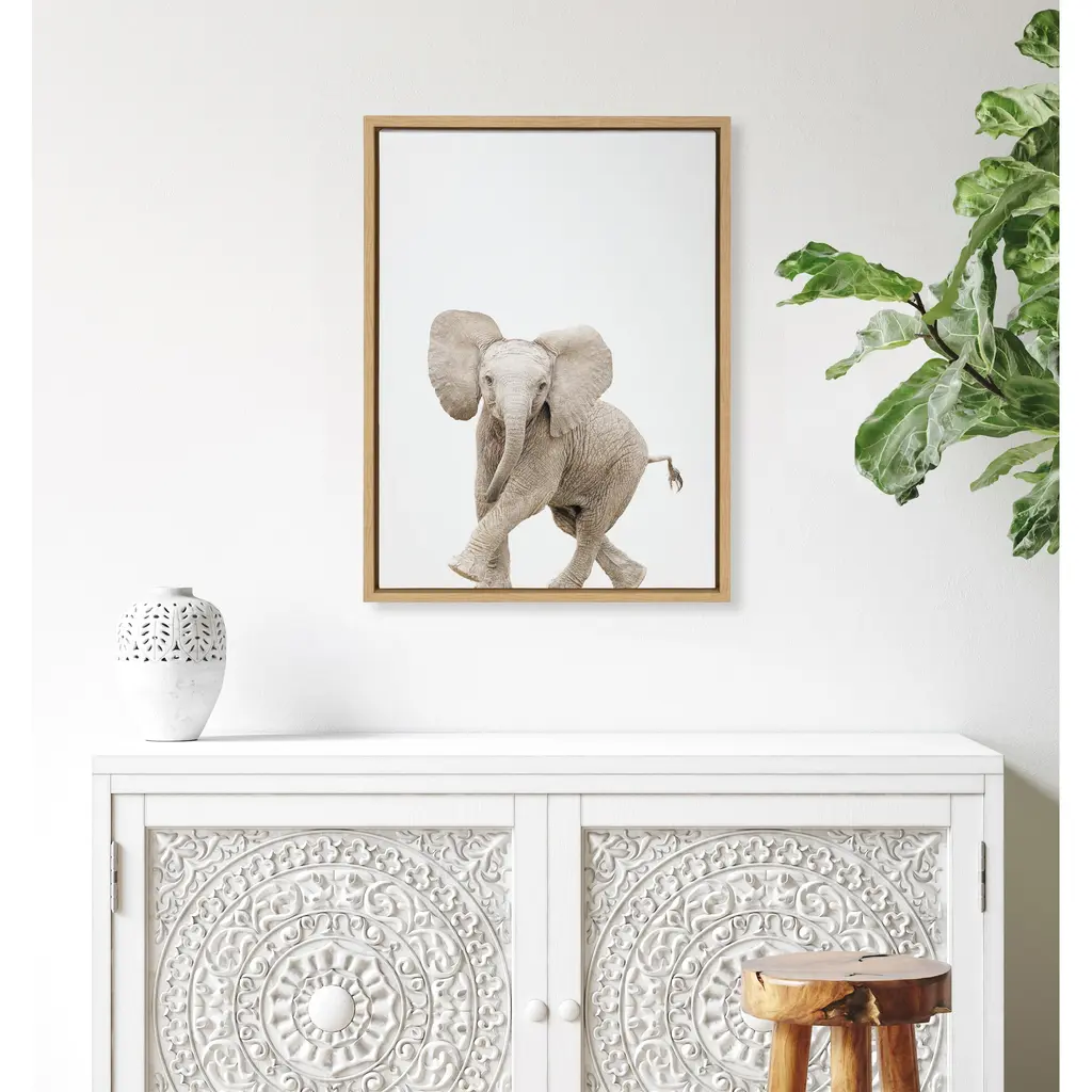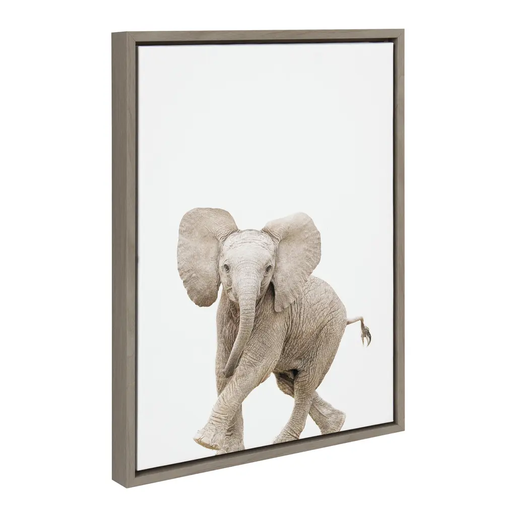 Provide your space with some whimsical appeal with this baby elephant portrait. This lovely, light piece by Amy Peterson Art Studio is perfect for any animal lover. Framed in the USA in Waunakee, Wisconsin, this floating canvas art will be a pleasure to look at every day in your living room, bedroom, nursery, or any room in the home. This art print also makes an excellent gift for birthdays, holidays, or house-warming parties. Printed on gallery-wrapped canvas and framed with a lightweight polystyrene frame, this wall art is easy to display on the wall. The outer dimensions are 18 inches by 24 inches by 1.6 inches. Print Name: "Baby Elephant Walk"