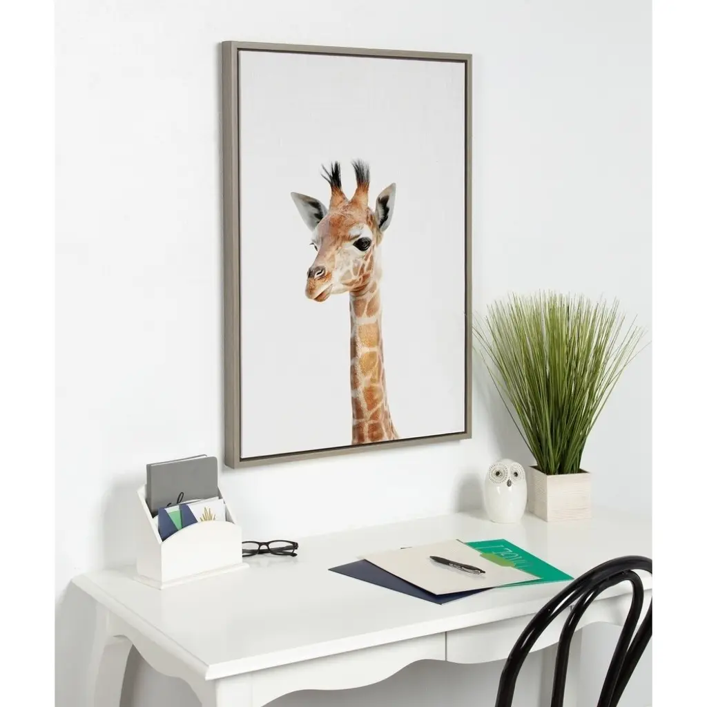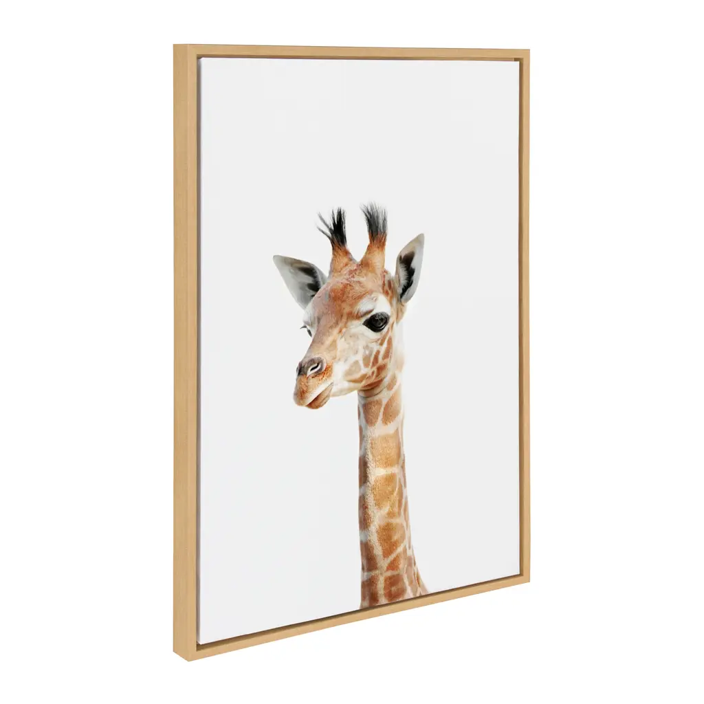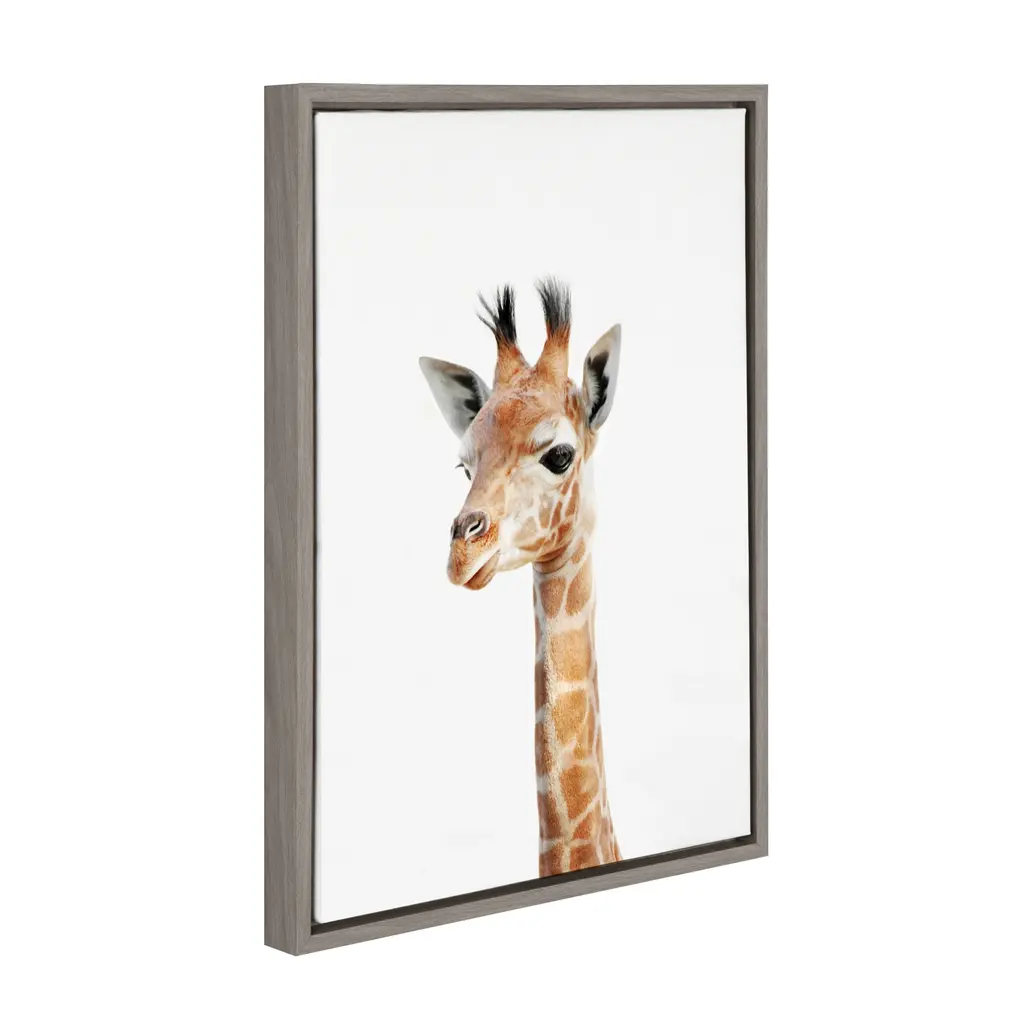 Add some whimsical charm to your nursery, living room, or office with this adorable portrait of a baby giraffe. The floating, gallery-wrapped canvas design adds a three-dimensional pop, while the minimalist polystyrene frame has contemporary style. Thanks to the simple design and included hardware, this ready-to-hang art is easy to install.