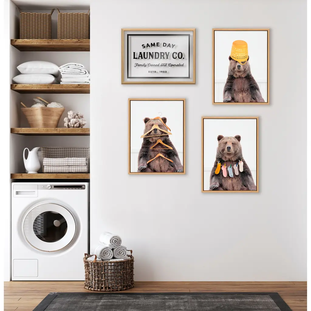 Amy Peterson has done it again, but this time they are animals for your laundry room! Whether it's an Animal or bunny who's helping you fold, a brown bear trying to sort hangers or lost socks or an adorable polar bear helping carry the basket, these art prints are sure to bring a smile to your face! Framed in the USA in Waunakee, Wisconsin, this floating canvas art will be a pleasure to look at every day in your living room, bedroom, home office, laundry room, bathroom, or any room in the home. This art print also makes an excellent gift for birthdays, holidays, or house-warming parties. Printed on gallery-wrapped canvas and framed with a lightweight polystyrene frame, this wall art is easy to display on the wall. The outer dimensions are 18 inches by 24 inches by 1.6 inches. Print Name: "Basket Case Bear"