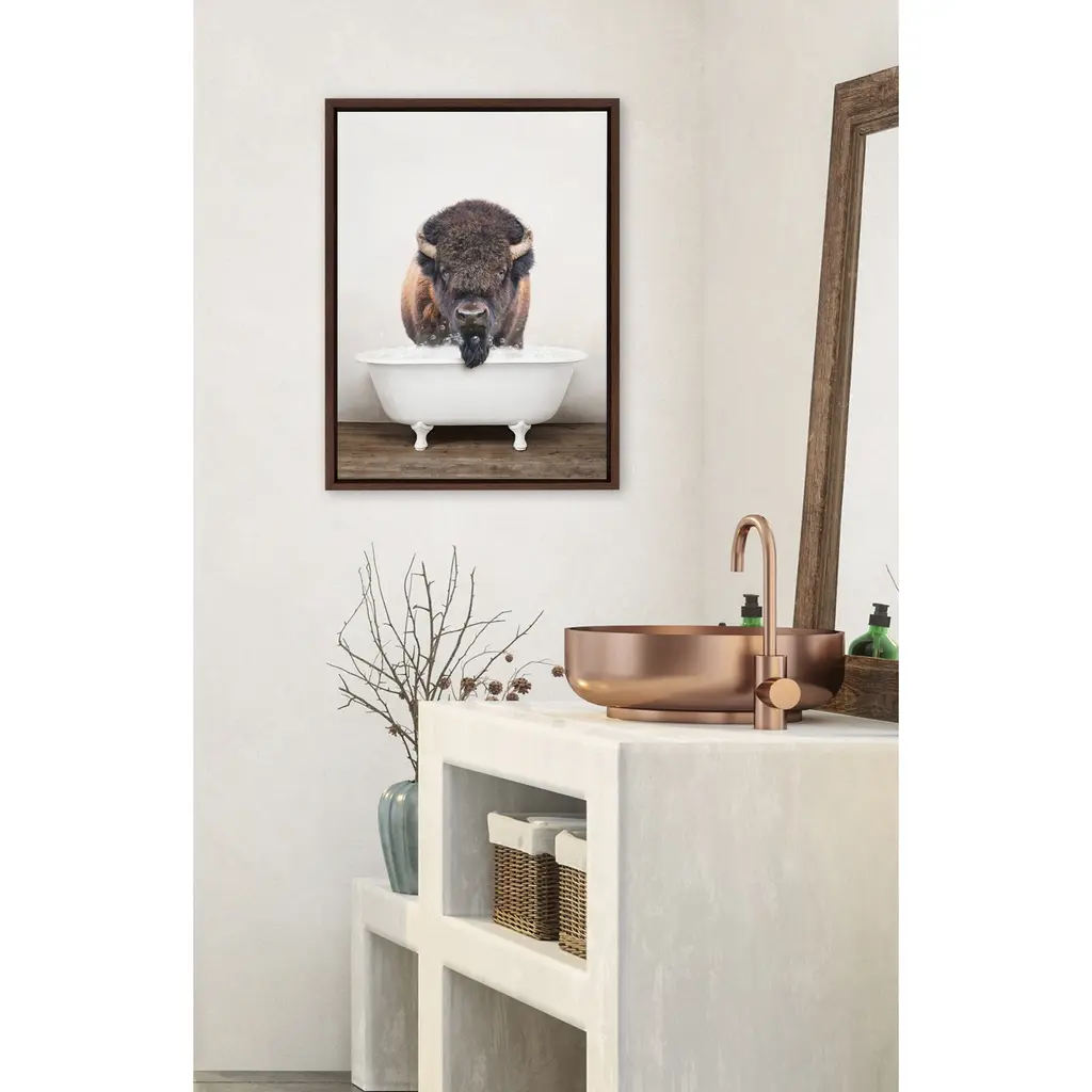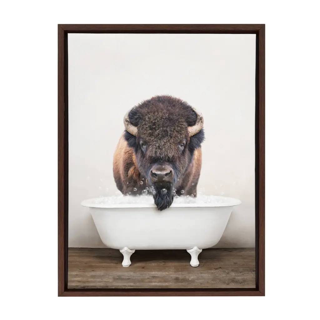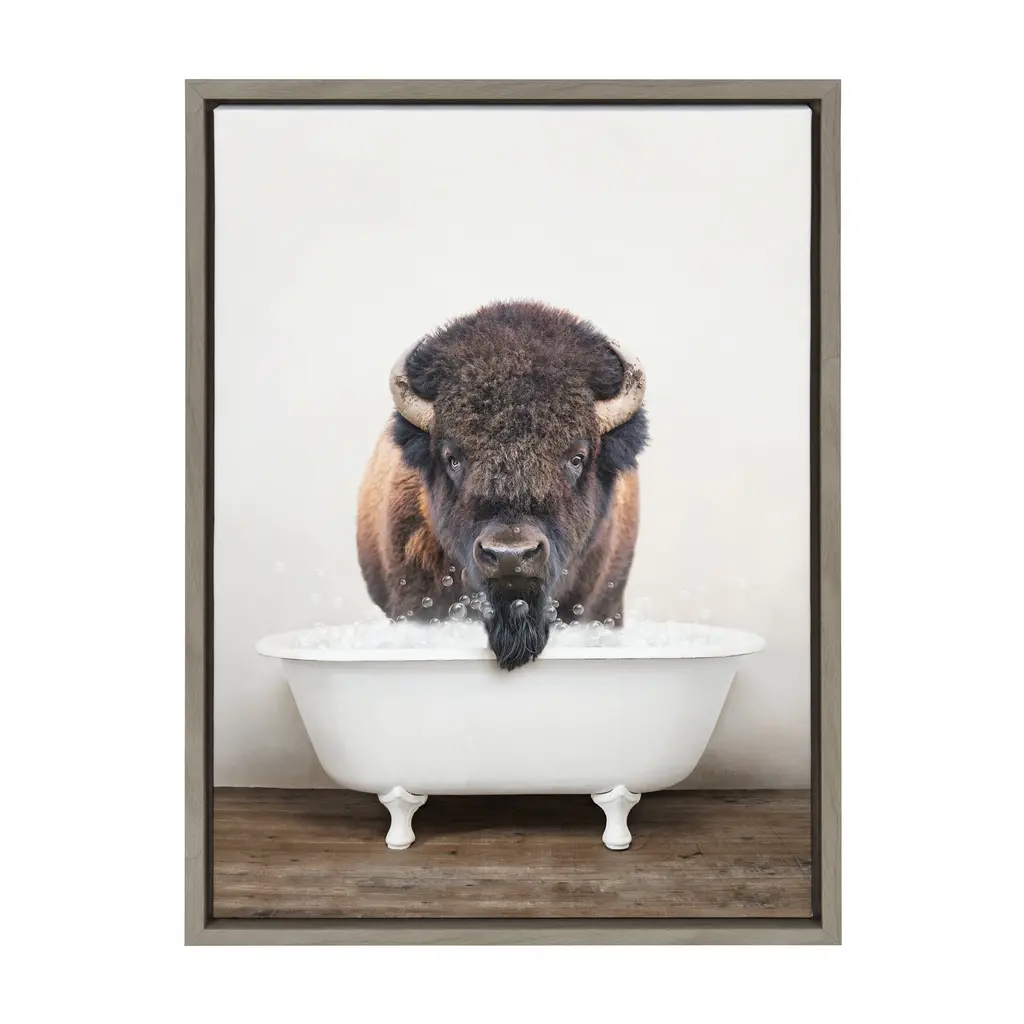 Make a bold impression on your house guests with this whimsical animal art piece by artist Amy Peterson. With its sleek modern frame, this fun, contemporary design is the perfect art piece to add to your home decor collection. Framed in the USA in Waunakee, Wisconsin, this floating canvas art will be a pleasure to look at every day in your living room, bedroom, nursery, or any room in the home. This art print also makes an excellent gift for birthdays, holidays, or house-warming parties. Printed on gallery-wrapped canvas and framed with a lightweight polystyrene frame, this wall art is easy to display on the wall. The outer dimensions are 18 inches by 24 inches by 1.6 inches. Print Name: "Bison Rustic Bubble Bath"