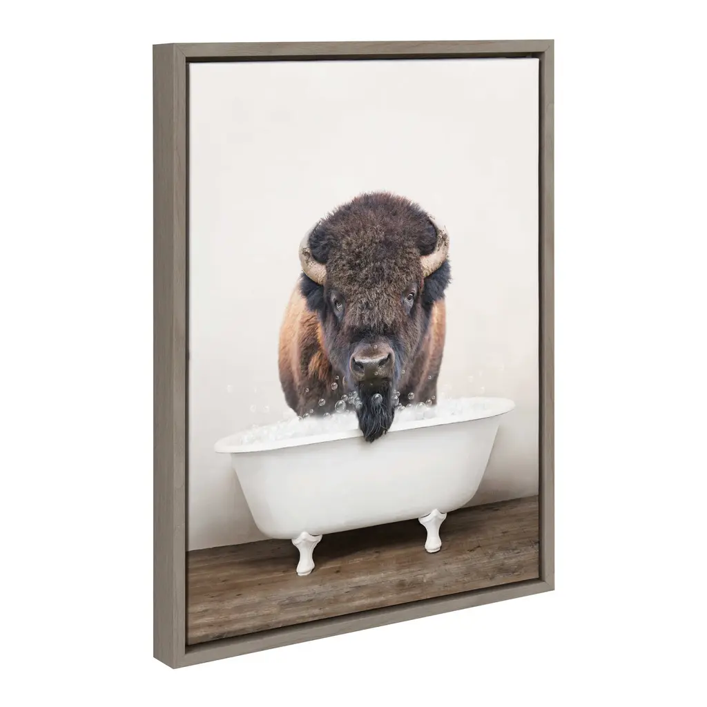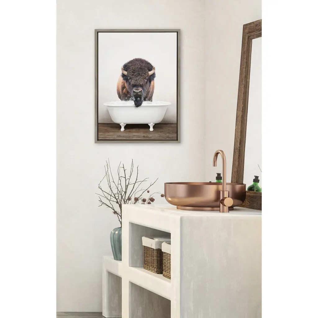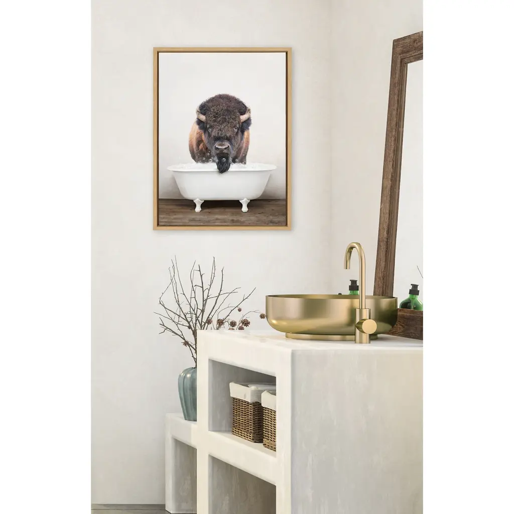 Make a bold impression on your house guests with this whimsical animal art piece by artist Amy Peterson. With its sleek modern frame, this fun, contemporary design is the perfect art piece to add to your home decor collection. Framed in the USA in Waunakee, Wisconsin, this floating canvas art will be a pleasure to look at every day in your living room, bedroom, nursery, or any room in the home. This art print also makes an excellent gift for birthdays, holidays, or house-warming parties. Printed on gallery-wrapped canvas and framed with a lightweight polystyrene frame, this wall art is easy to display on the wall. The outer dimensions are 18 inches by 24 inches by 1.6 inches. Print Name: "Bison Rustic Bubble Bath"