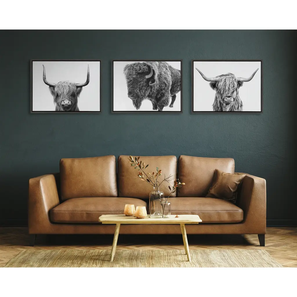 Provide your space with some whimsical appeal with this prairie bison portrait. This lovely, light piece by Amy Peterson Art Studio is perfect for any animal lover. Framed in the USA in Waunakee, Wisconsin, this floating canvas art will be a pleasure to look at every day in your living room, bedroom, nursery, or any room in the home. This art print also makes an excellent gift for birthdays, holidays, or house-warming parties. Printed on gallery-wrapped canvas and framed with a lightweight polystyrene frame, this wall art is easy to display on the wall. The outer dimensions are 18 inches by 24 inches by 1.6 inches. Print Name: "Bison in Snow Black and White"