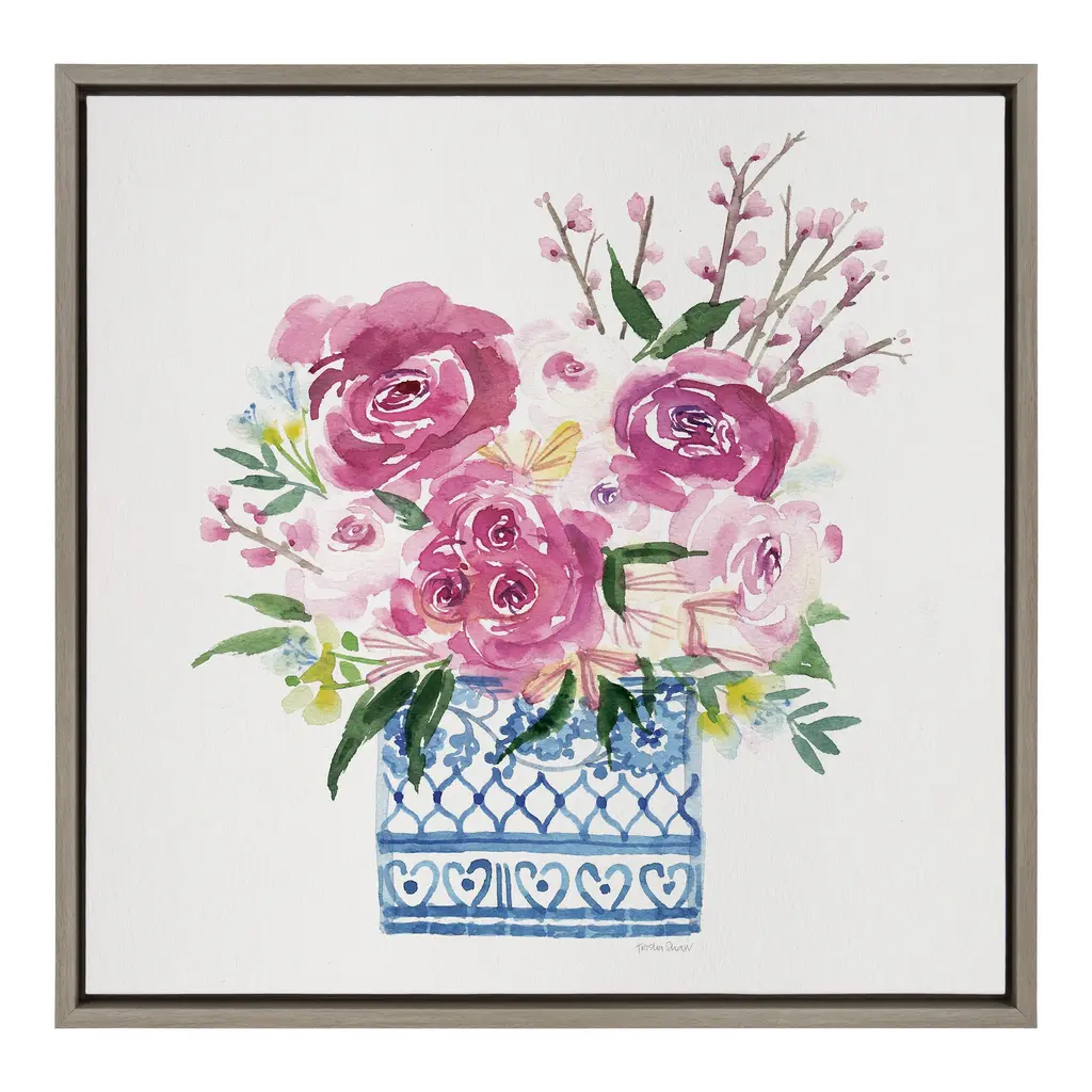 This floral art print is tickled pink at the thought of adding some color to your walls. Framed in the USA in Waunakee, Wisconsin, this floating canvas art will be a pleasure to look at every day in your living room, bedroom, office, or any room in the home. This art print also makes an excellent gift for birthdays, holidays, or house-warming parties. Printed on gallery-wrapped canvas and framed with a lightweight polystyrene frame, this wall art has two hangers already attached to the MDF back for easy wall display. The outer dimensions are 24 inches by 24 inches by 1.63 inches. Print Name: "Pink Blooms in Chinoiserie