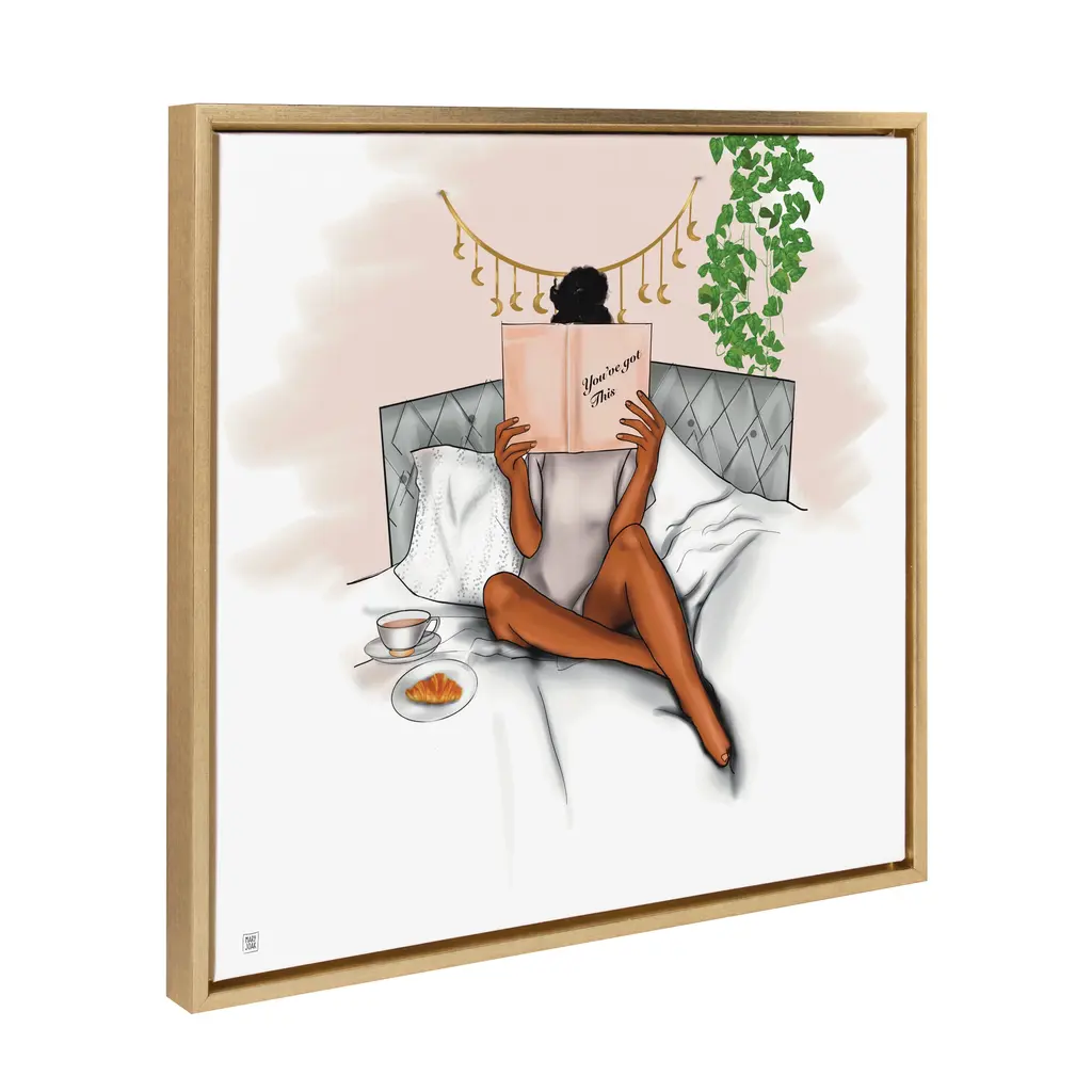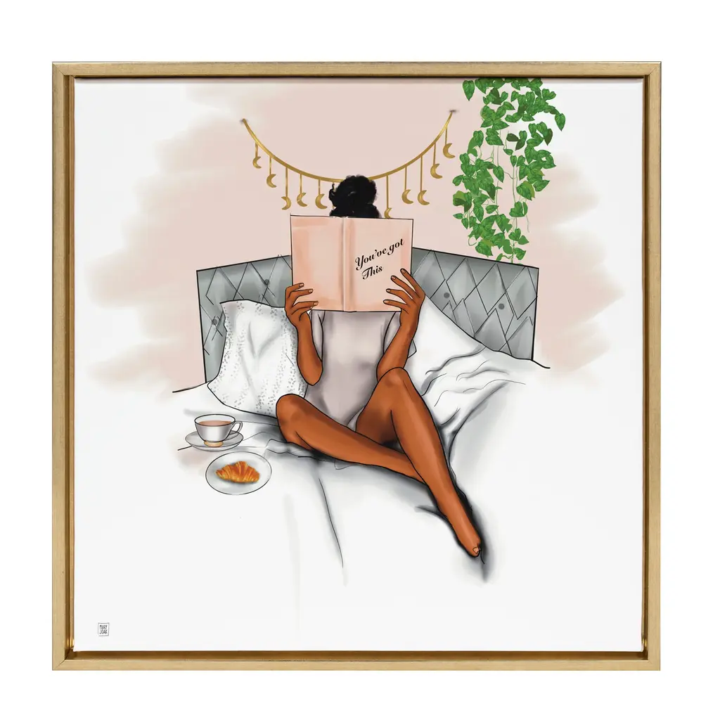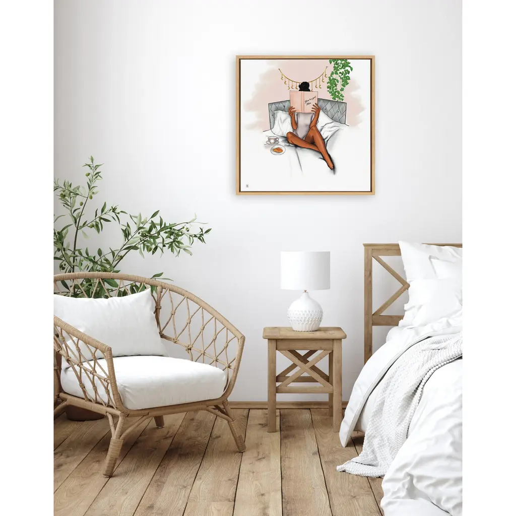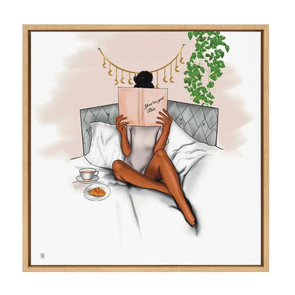 What's better than curling up with a snack and a good book? We'll tell you, nothing. This art print showcases the good things in life with its relaxing boho-style illustration. Framed in the USA in Waunakee, Wisconsin, this floating canvas art will be a pleasure to look at every day in your living room, bedroom, nursery, or any room in the home. This art print also makes an excellent gift for birthdays, holidays, or house-warming parties. Printed on gallery-wrapped canvas and framed with a lightweight polystyrene frame, this wall art has two hangers already attached to the MDF back for easy wall display. The outer dimensions are 22 inches by 22 inches by 1.6 inches. Print Name: "Book Bed And Faith"