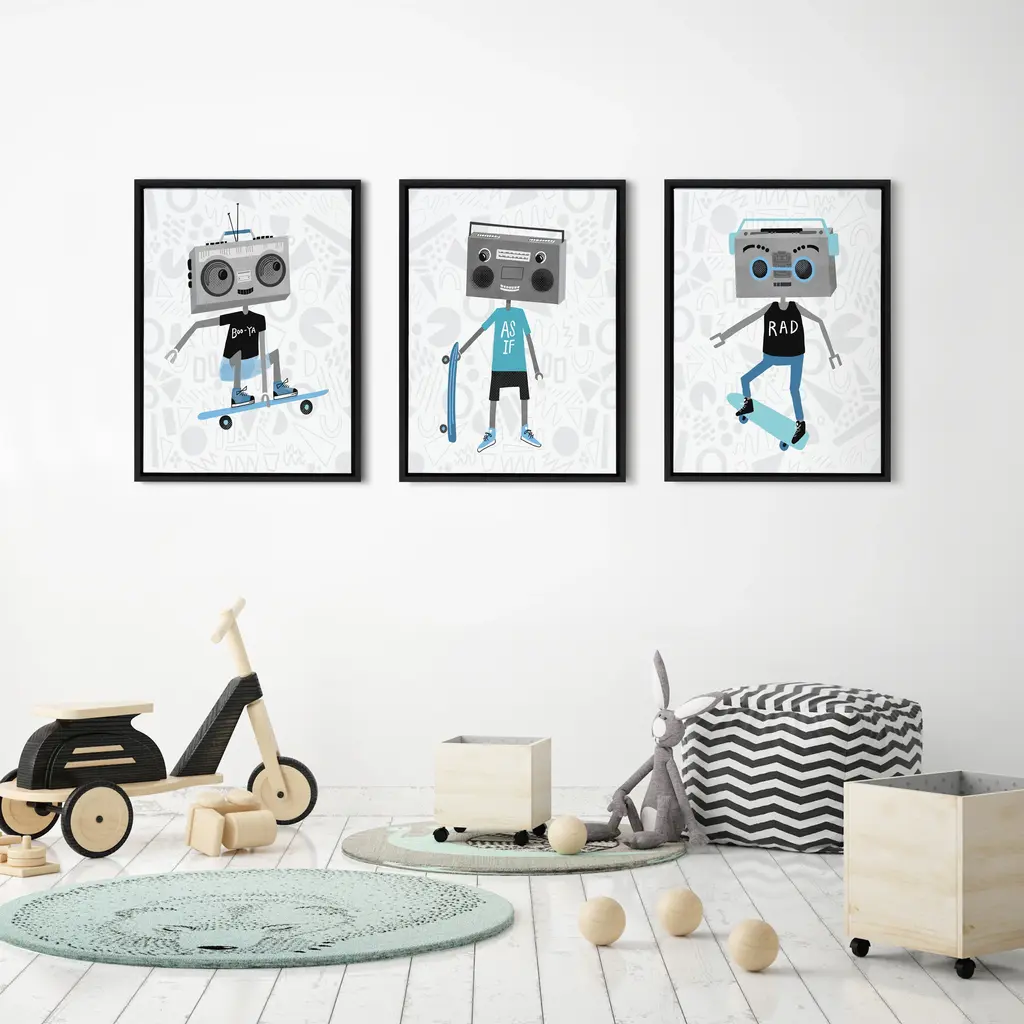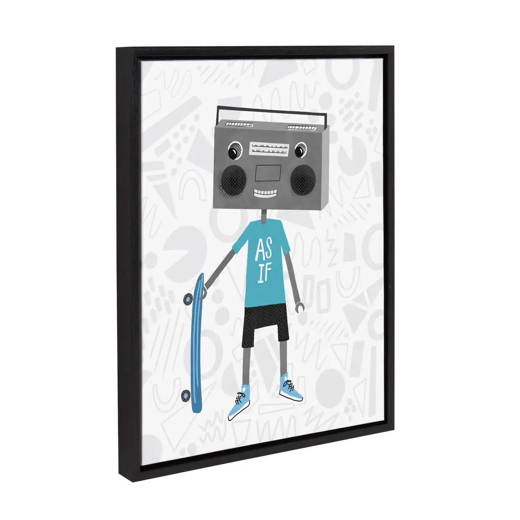 This robot teen makes for a super cool, sci-fi inspired playroom or nursery. Framed in the USA in Waunakee, Wisconsin, this floating canvas art will be a pleasure to look at every day in your living room, bedroom, nursery, or any room in the home. Printed on gallery-wrapped canvas and framed with a lightweight polystyrene frame, this wall art has two hangers already attached to the MDF back for easy wall display. The outer dimensions are 24 inches tall by 18 inches wide by 1.63 inches deep. Print Name: "Boom Box Boy 2"