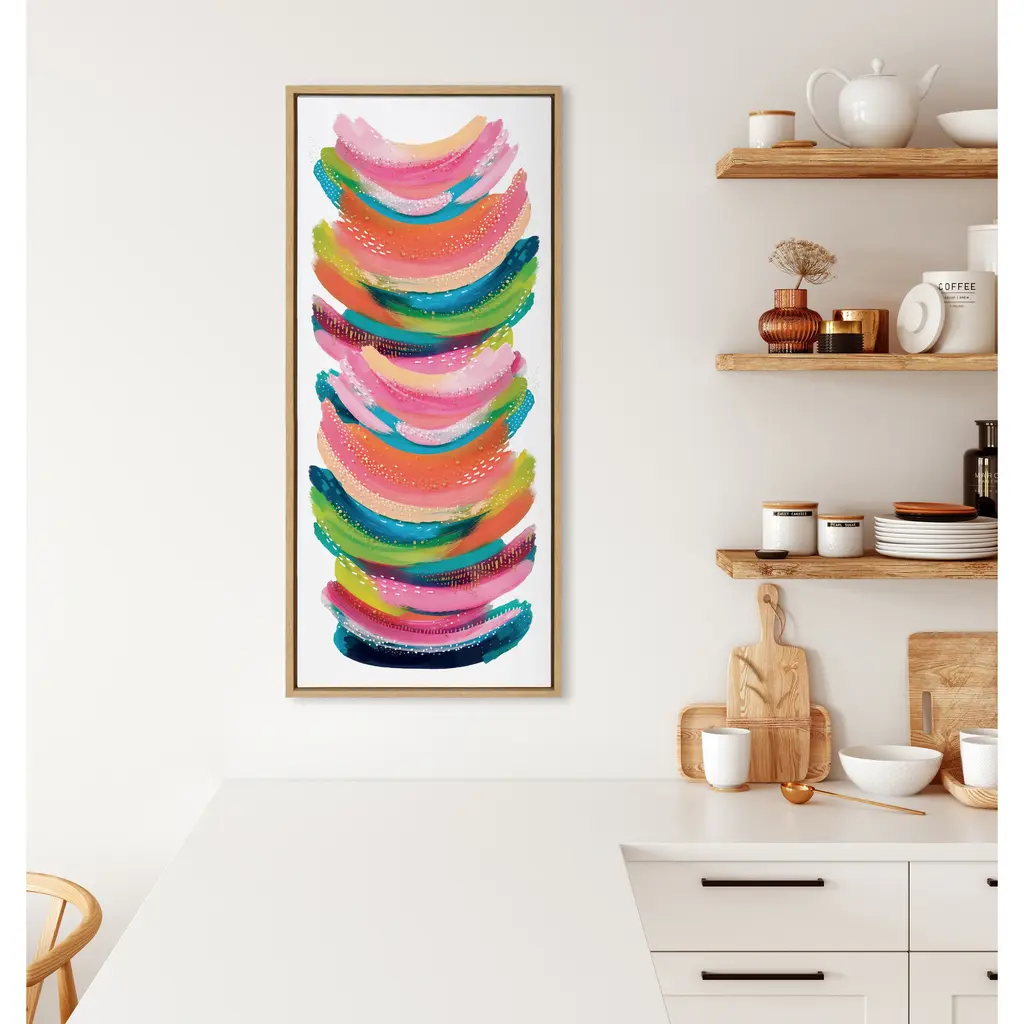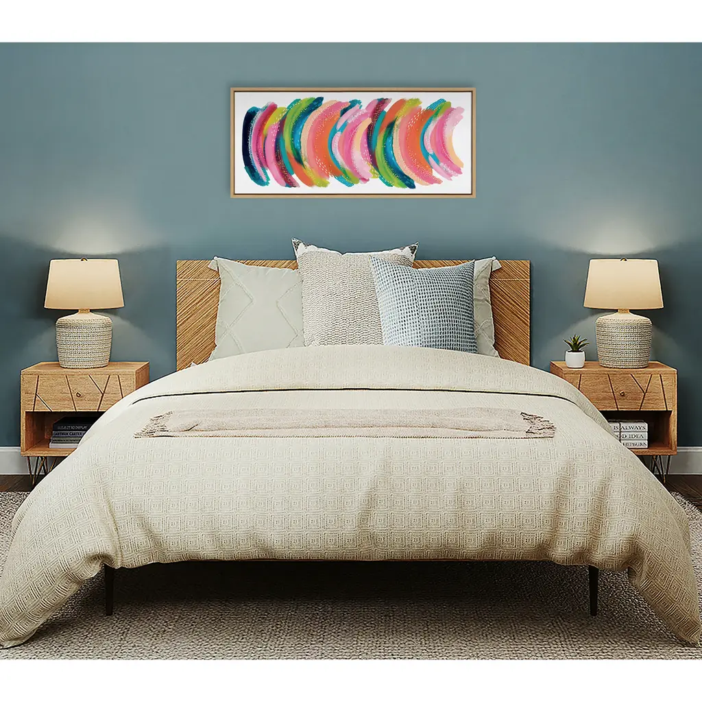 Bring in an array of colors to your bedroom with this 'Bright Abstract' framed canvas art by Jessi Raulet. Distributed by Kate and Laurel, this abstract artwork features a floating design and a gallery-wrapped finish for unique appeal and a professional appearance. The polystyrene frame is lightweight yet sturdy enough to provide additional support to extend this wall display's life. Two hangers pre-attached to this wall art's back facilitate quick mounting, so you can enjoy the beauty of this home decor right out of the box.