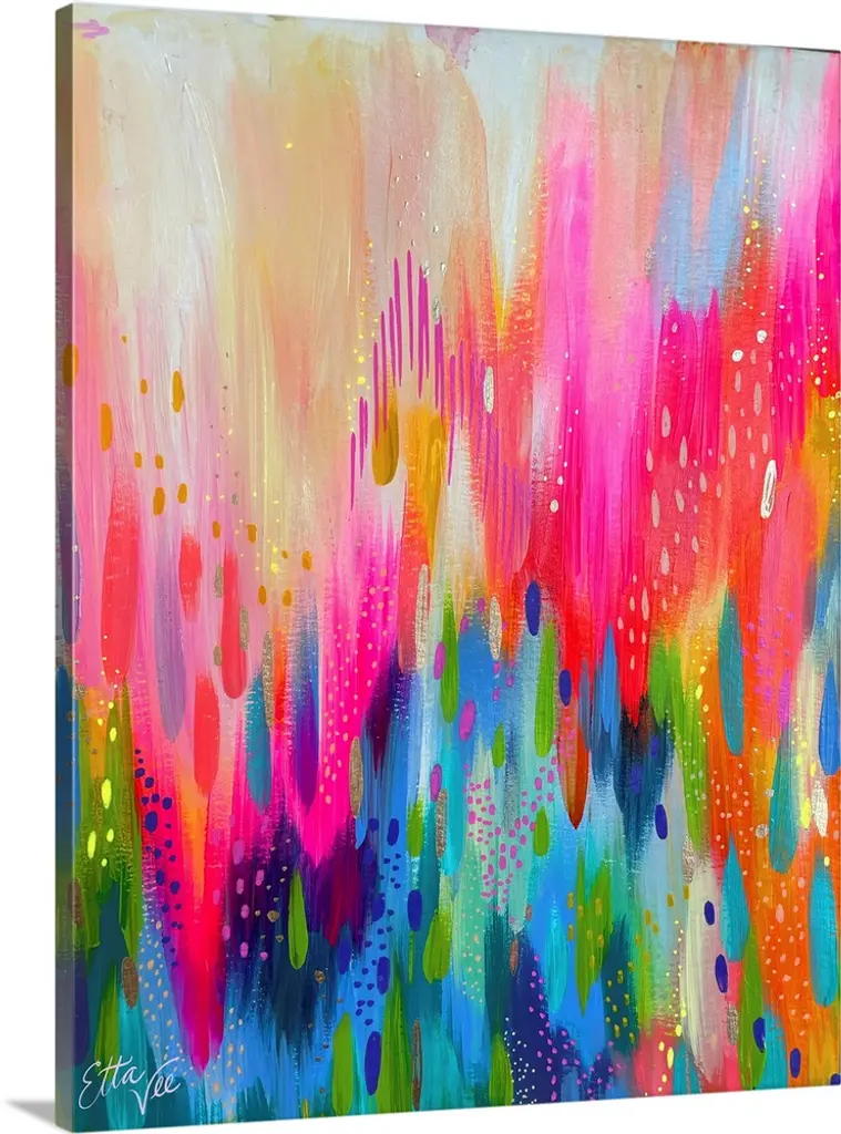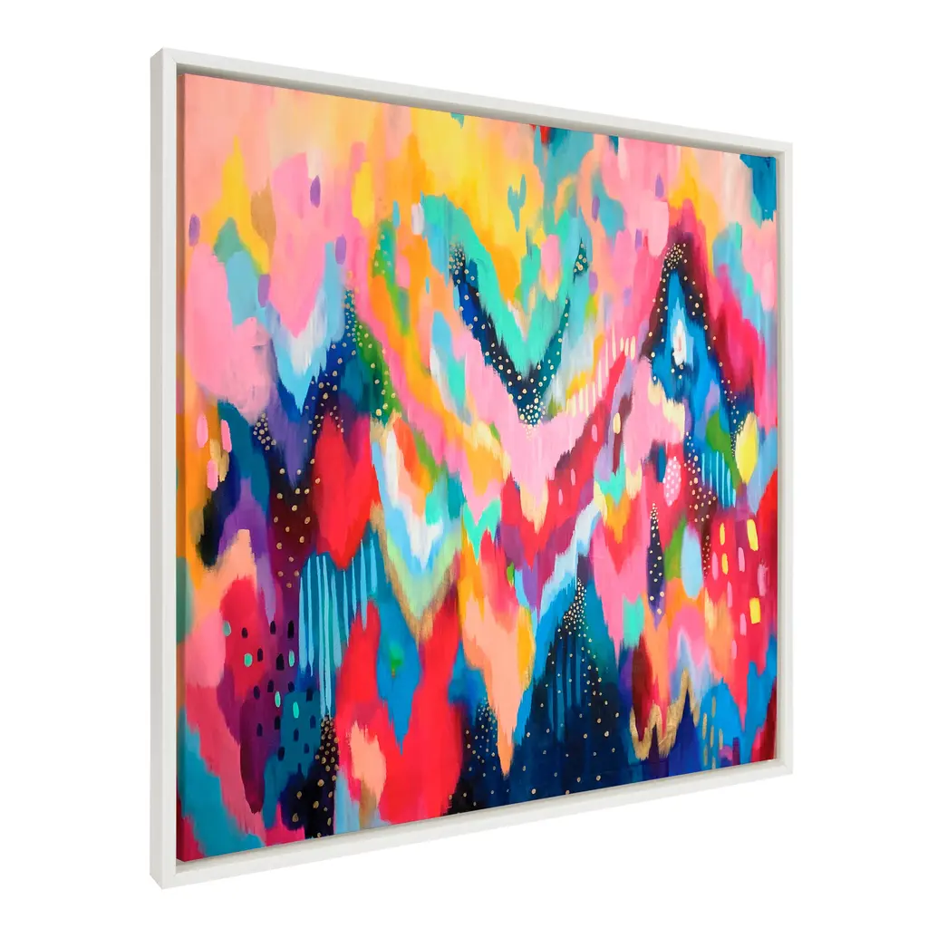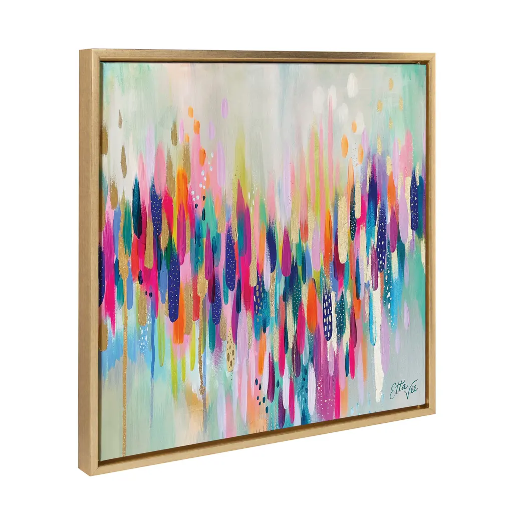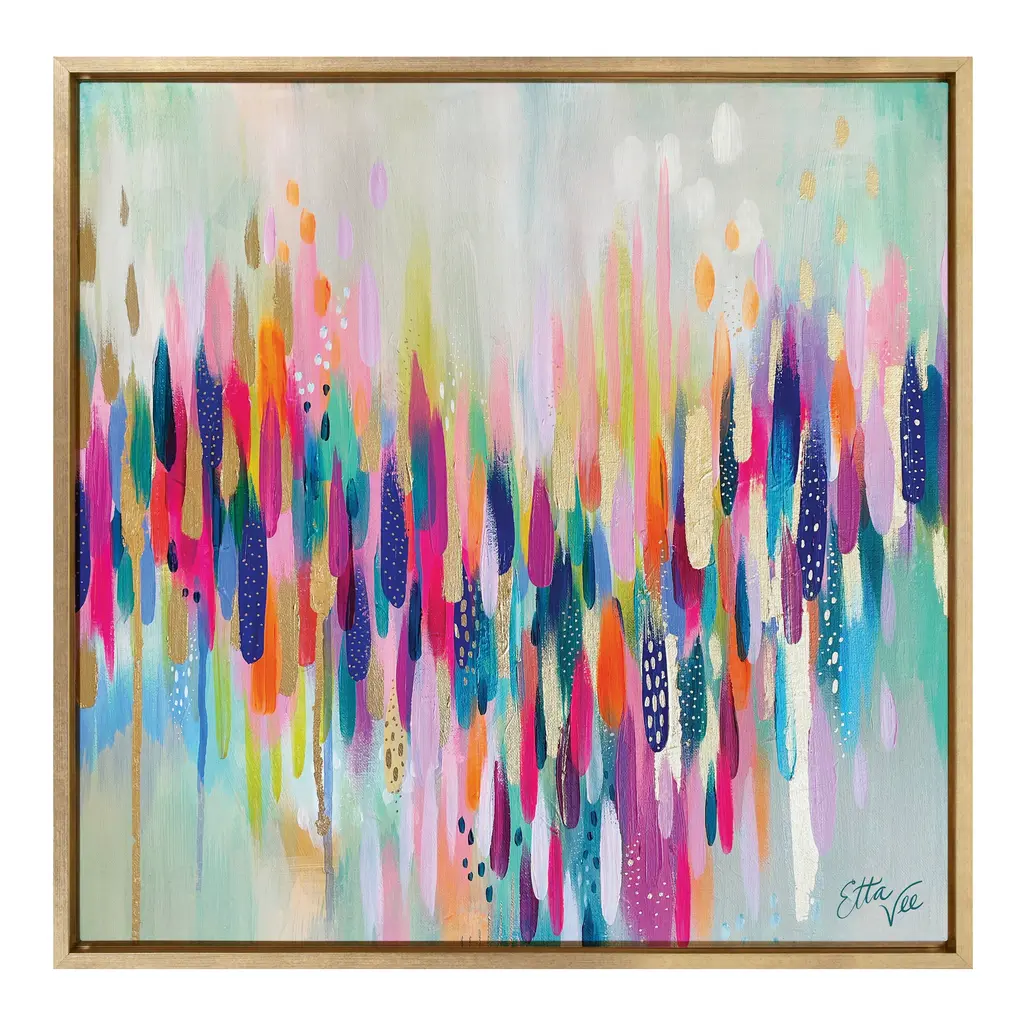 Transform your space with this bright, abstract wall art piece by Jessi Raulet of Ettavee. Its lovely, colorful brushstrokes provide your space with a needed addition of creativity and energy. Framed in the USA in Waunakee, Wisconsin, this modern floating canvas art is sure to bring joy to your space. Our design team curates art that will fit perfectly in any room of your home. Showcase this art in your living room, bedroom, home office, kitchen, bathroom, nursery, or anywhere you want to bring a little beauty and charm to your walls. Specializing in home décor, we are continually bringing timeless works of art for the traditional decorator as well as trend-forward pieces for that eclectic art lover. Our high-quality framed canvas art also makes excellent gifts for birthdays, holidays, or housewarming parties. Printed on gallery-wrapped canvas and framed with a simple gallery frame this wall art is easy to display on the wall and will match with any décor style. The outer dimensions are 30 inches by 30 inches by 1.6 inches. Print Name: "Brushstroke 154"