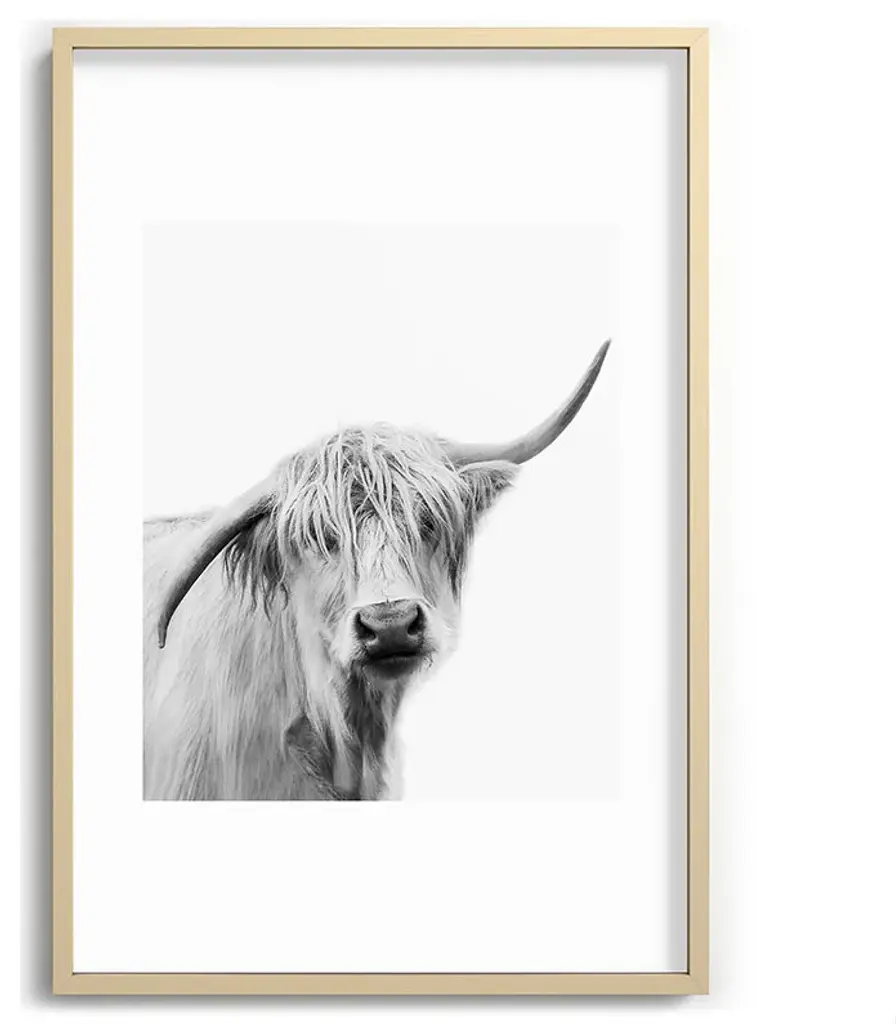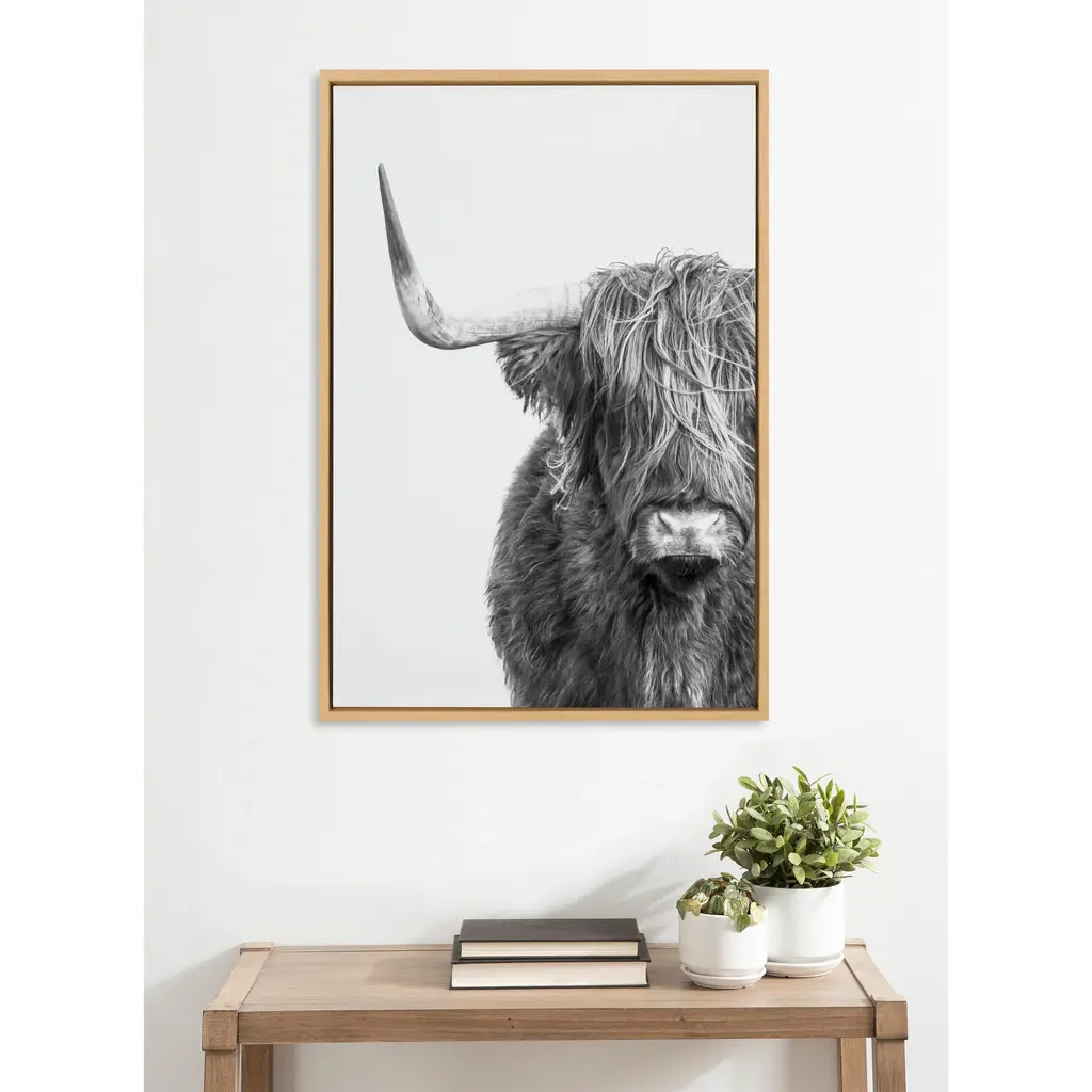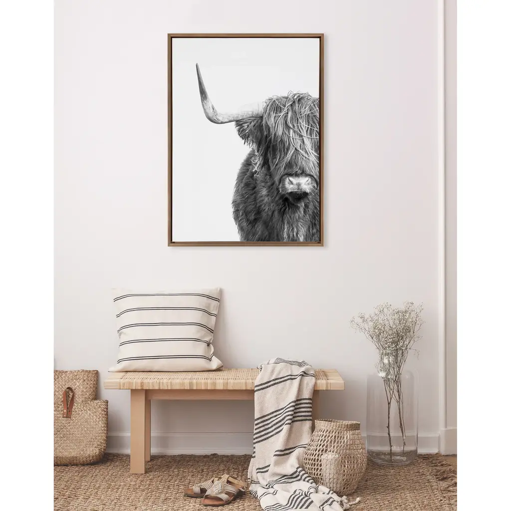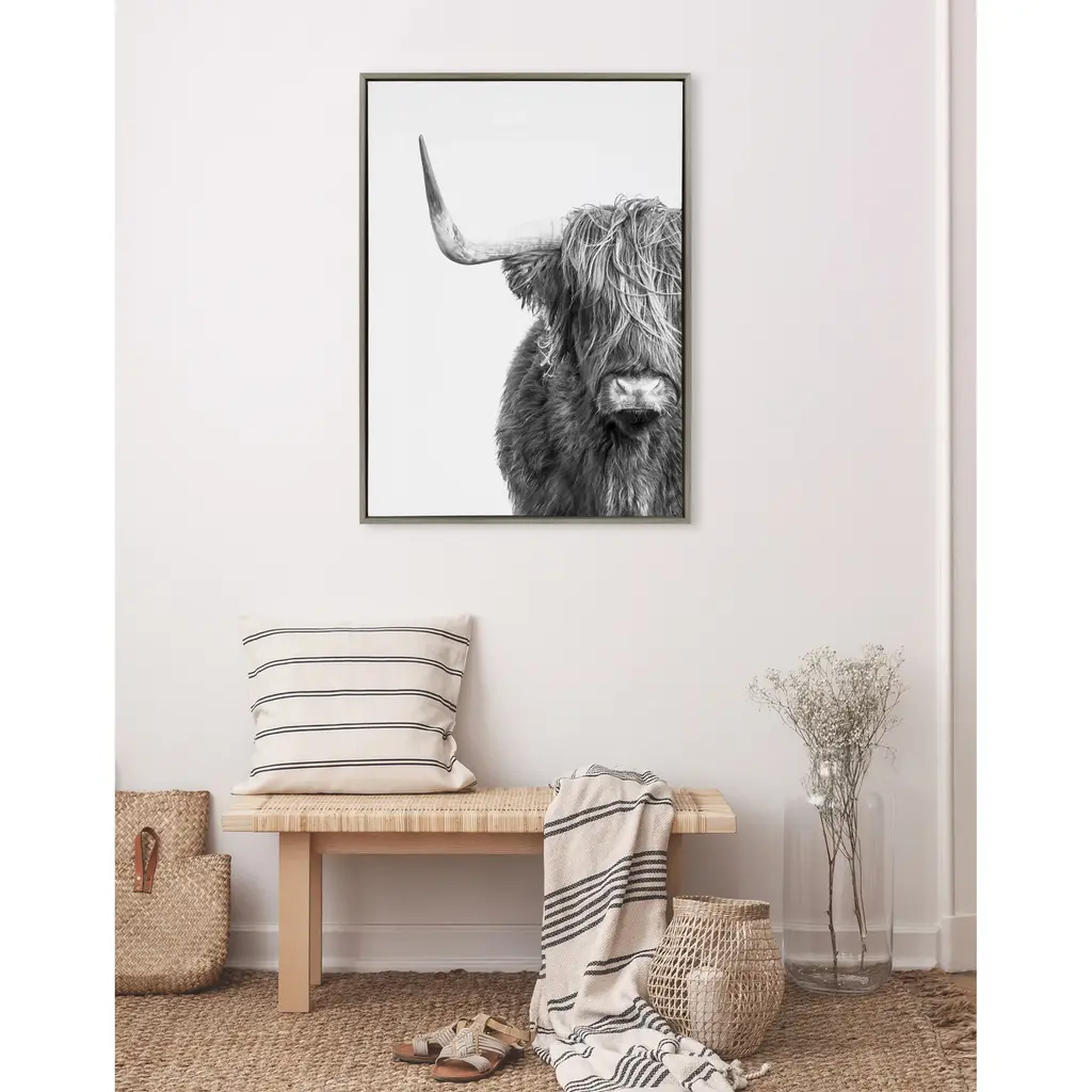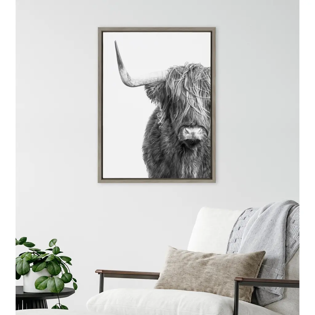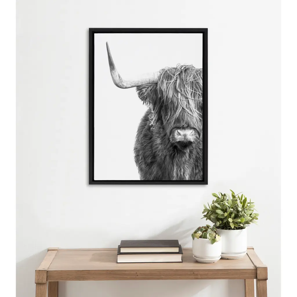Introduce the charm of the countryside into your home with this stunning rustic cow portrait by Amy Peterson Art Studio. This dramatic black-and-white version of the beloved Highland Cow is the perfect refined addition to your home. Framed in the USA in Waunakee, Wisconsin, this modern floating canvas art is sure to bring joy to your space. Our design team curates art that will fit perfectly in any room of your home. Showcase this art in your living room, bedroom, home office, kitchen, bathroom, nursery, or anywhere you want to bring a little beauty and charm to your walls. Specializing in home décor, we are continually bringing timeless works of art for the traditional decorator as well as trend-forward pieces for that eclectic art lover. Our high-quality framed canvas art also makes excellent gifts for birthdays, holidays, or housewarming parties. Printed on gallery-wrapped canvas and framed with a simple gallery frame this wall art is easy to display on the wall and will match with any décor style. The outer dimensions are 23 inches by 33 inches by 1.6 inches. Print Name: "B&W Highland Cow No. 1"
