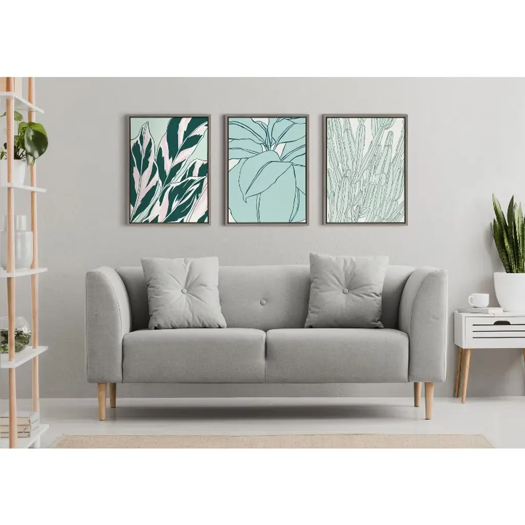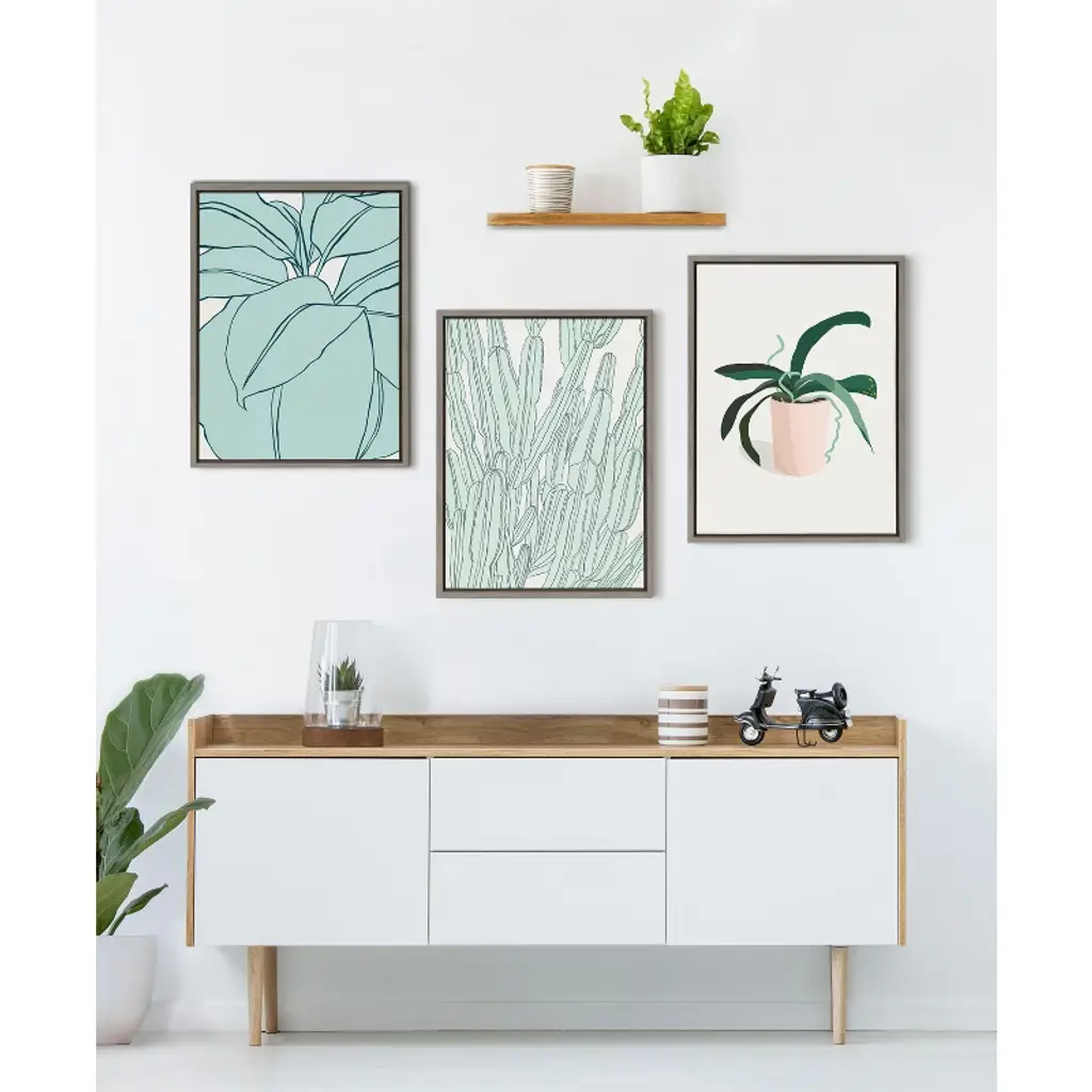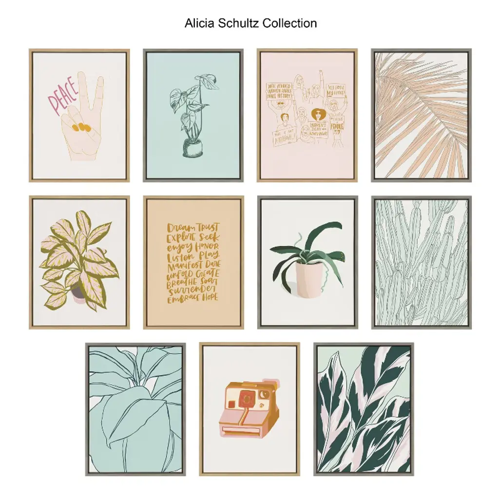 Add a southwestern-inspired flair to your home with this cactus inspired print by artist Alicia Schultz. Framed in the USA in Waunakee, Wisconsin, this floating canvas art will be a pleasure to look at every day in your living room, bedroom, dining room, or any room in the home that needs a southwestern flair. Printed on gallery-wrapped canvas and framed with a lightweight polystyrene frame, this wall art has two hangers already attached to the MDF back for easy wall display. The outer dimensions are 24 inches tall by 18 inches wide by 1.63 inches deep. Print Name: ?Cacti Garden?