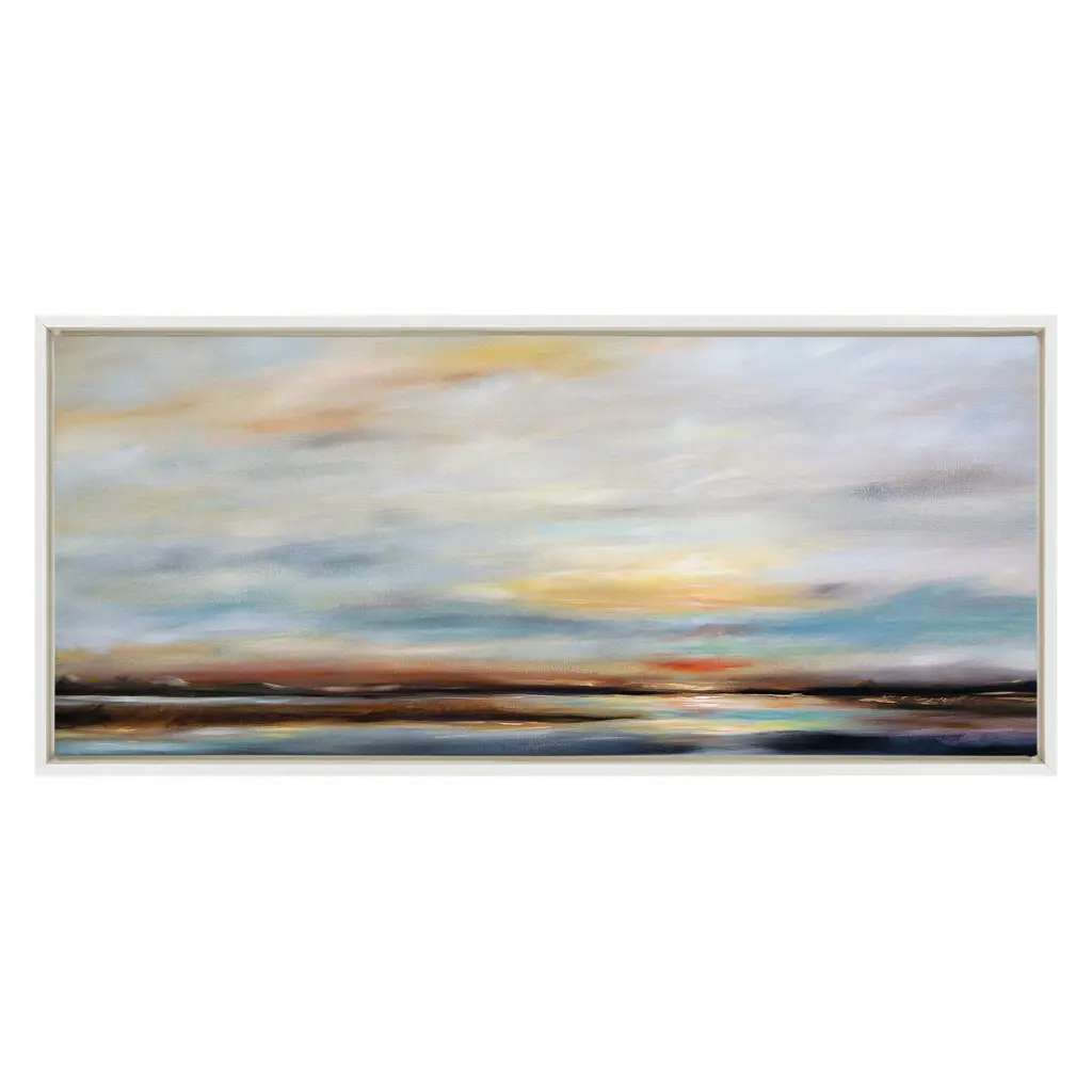Supply your space with a peaceful, Carolina sunset that effortlessly exudes tranquility by Mary Sparrow. This wide ocean skyline view gives your space a lovely coastal addition that reminds you of those long summer days on the water. Framed in the USA in Waunakee, Wisconsin, this floating canvas art will be a pleasure to look at every day in your living room, bedroom, nursery, or any room in the home. This art print also makes an excellent gift for birthdays, holidays, or house-warming parties. Printed on gallery-wrapped canvas and framed with a lightweight polystyrene frame, this wall art is easy to display on the wall. The outer dimensions are 18 inches by 40 inches by 1.6 inches. Print Name: "Carolina Sunset"