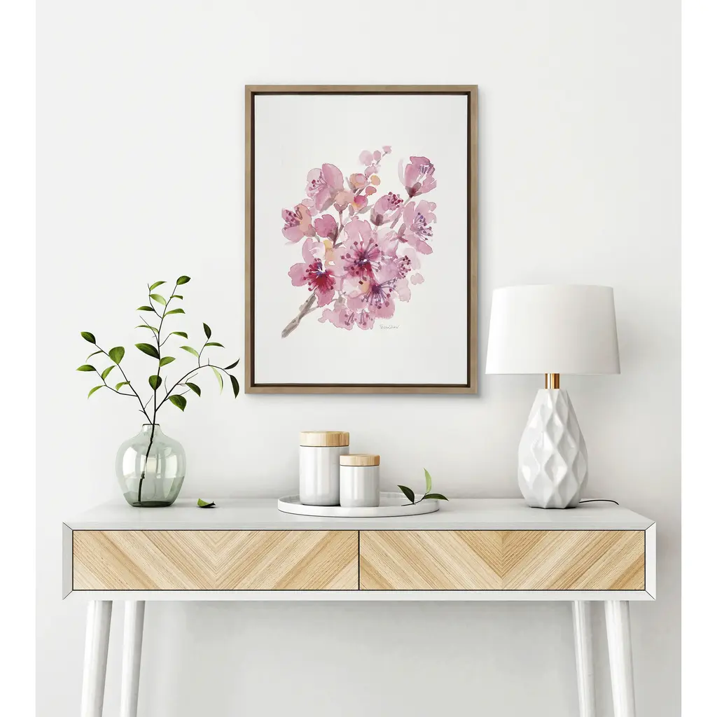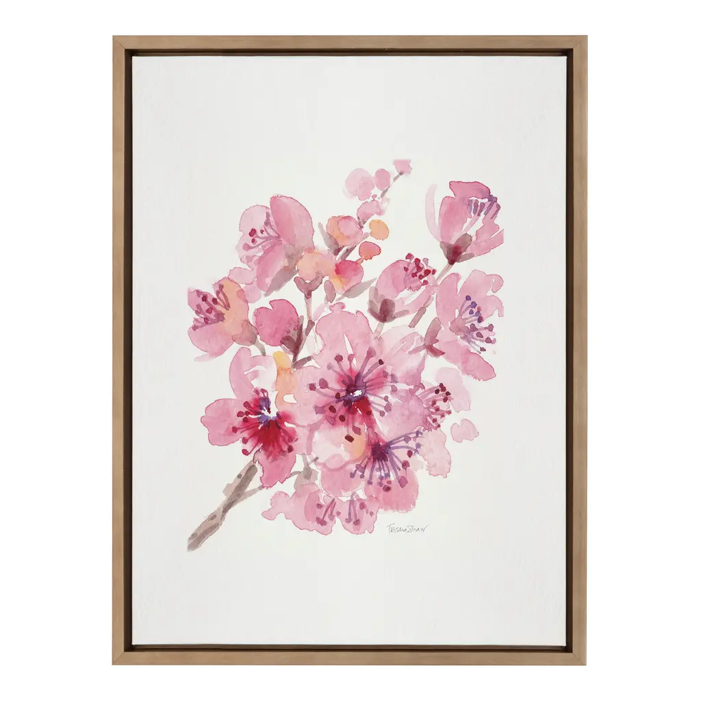 Immerse yourself in a mist of watercolor pink cherry blossoms with this floral print. Framed in the USA in Waunakee, Wisconsin, this floating canvas art will be a pleasure to look at every day in your living room, bedroom, nursery, or any room in the home. This art print also makes an excellent gift for birthdays, holidays, or house-warming parties. Printed on gallery-wrapped canvas and framed with a lightweight polystyrene frame, this wall art has two hangers already attached to the MDF back for easy wall display. The outer dimensions are 24 inches by 18 inches by 1.63 inches. Print Name: "Cherry Blossom 2"