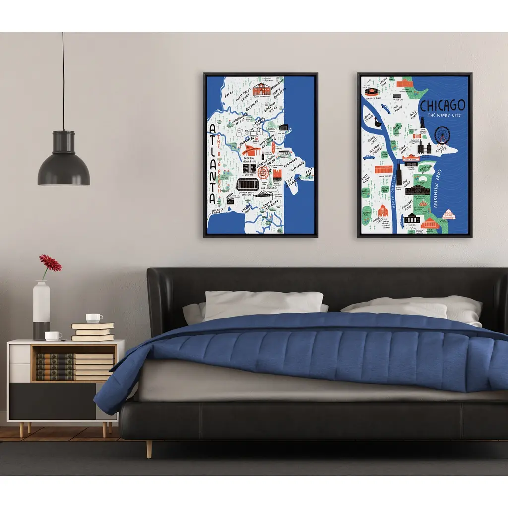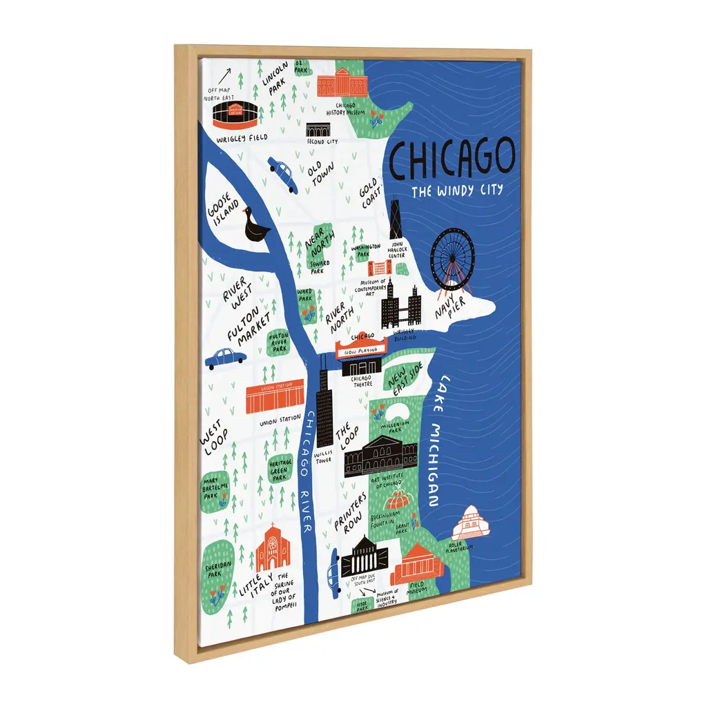 Rediscover your favorite moments in the Windy City with this touching, nostalgic canvas by artist Stacey Bloomfield. Displayed in a sleek modern frame, these fun, contemporary designs make for a vibrant statement to any room. Framed in the USA in Waunakee, Wisconsin, this floating canvas art will be a pleasure to look at every day in your living room, bedroom, nursery, or any room in the home. Printed on gallery-wrapped canvas and framed with a lightweight polystyrene frame, this wall art has two hangers already attached to the MDF back for easy wall display. The outer dimensions are 23 inches tall by 33 inches wide by 1.6 inches deep. Print Name: "Chicago Illustration". About The Artist: Stacie Bloomfield couldn't find any art for her daughter's nursery, so she decided to take it in her own hands. She launched her own company, "Gingiber" in 2009. Stacie was drawn to the irresistible essence of animals: their furry faces, perky ears, and their plethora of color and textures. Animals simply have a way of being adventurous and fun: visually, figuratively, and literally. She believes life should be that way, too. Stacie lives in Springdale, Arkansas, with her husband and three children.