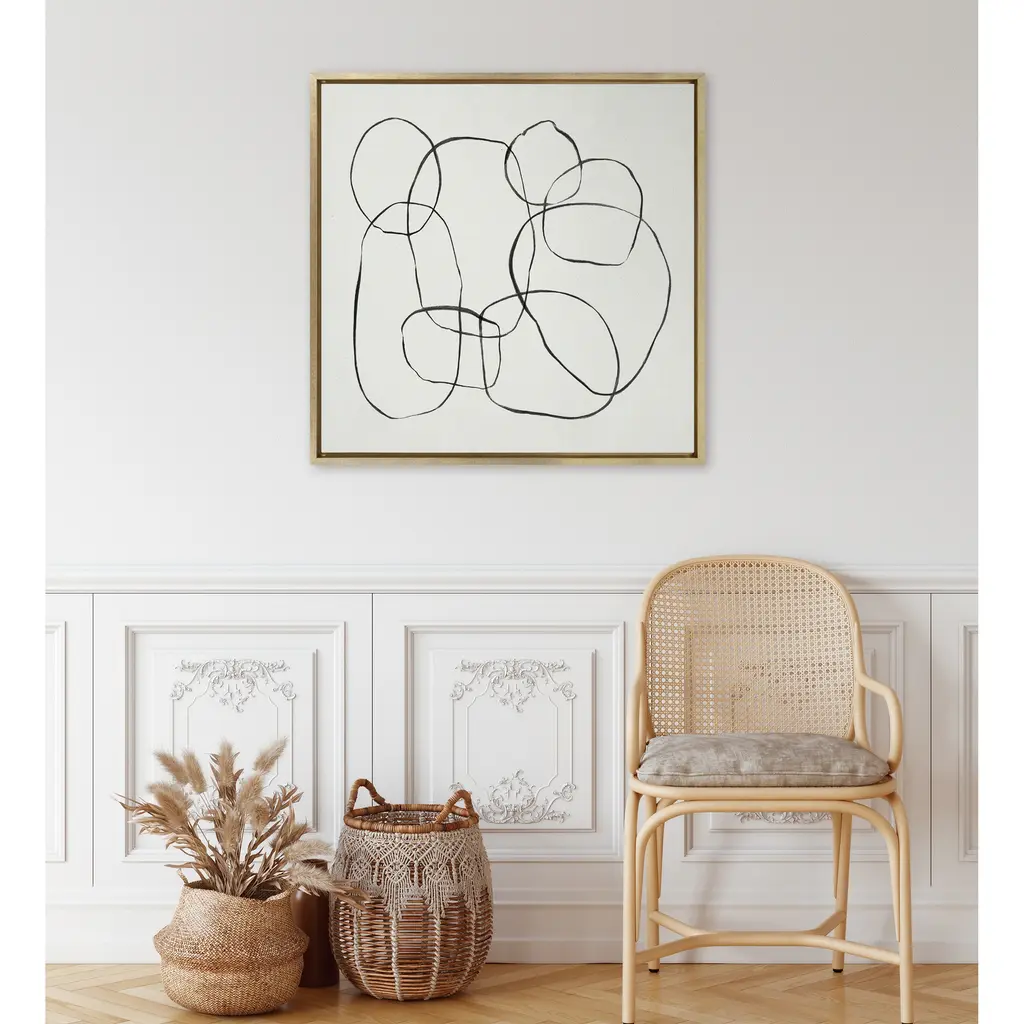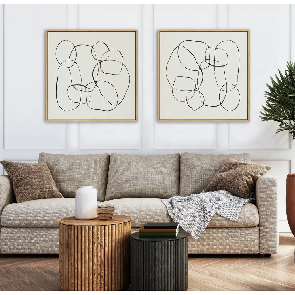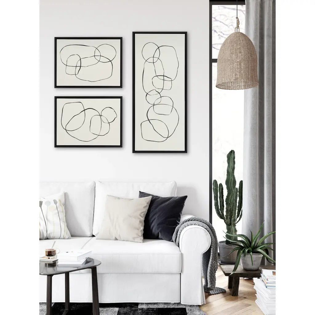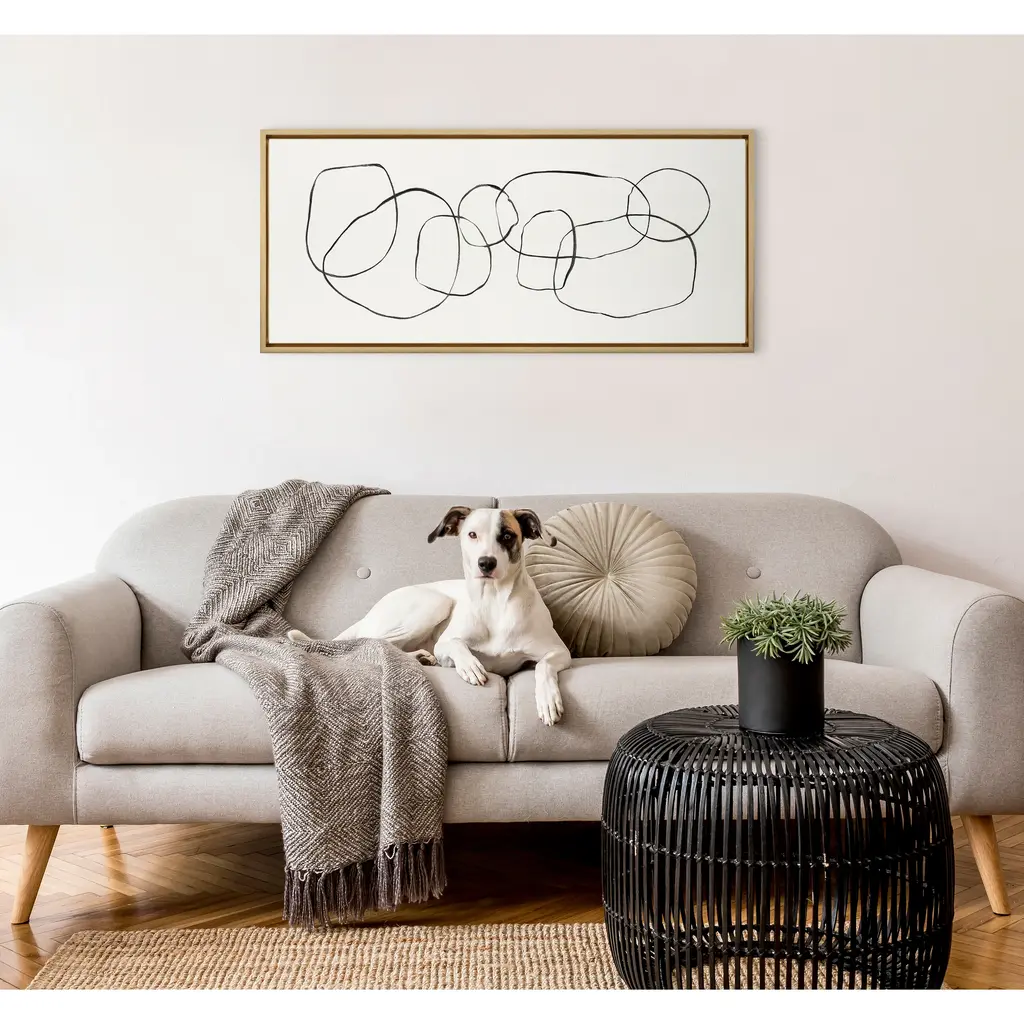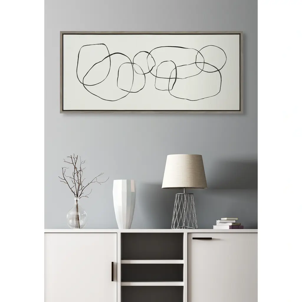 Create an enigmatic aesthetic in your home that exudes modern minimalist sophistication with this abstract art piece. Framed in the USA in Waunakee, Wisconsin, this floating canvas art will be a pleasure to look at every day in your living room, bedroom, office, or any room in the home. This art print also makes an excellent gift for birthdays, holidays, or housewarming parties. Printed on gallery-wrapped canvas and framed with a lightweight polystyrene frame, this wall art has two hangers already attached to the MDF back for easy wall display. The outer dimensions are 40 inches by 18 inches by 1.62 inches. Print Name: "Dancing Circles"