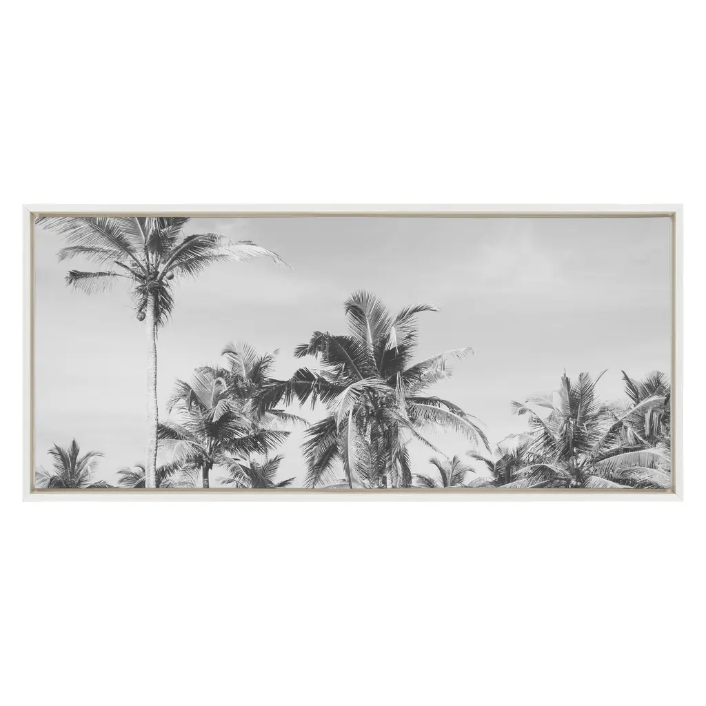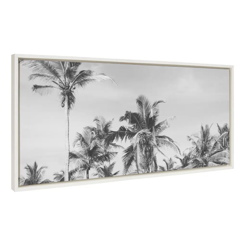 If you're looking for a warm, beachy vibe for your living room, bedroom, bathroom, entryway, or dining room, look no further than this palm tree-inspired canvas. Being long and narrow, it's perfect for that tall skinny vertical space or wide horizontal space. Framed in the USA in Waunakee, Wisconsin, this floating canvas art will be a pleasure to look at every day in your living room, bedroom, nursery, or any room in the home. This art print also makes an excellent gift for birthdays, holidays, or housewarming parties. Printed on gallery-wrapped canvas and framed with a lightweight polystyrene frame, this wall art is easy to display on the wall. The outer dimensions are 18 inches by 40 inches by 1.6 inches. Print Name: "Coastal Coconut Palm Tree Beach BW"