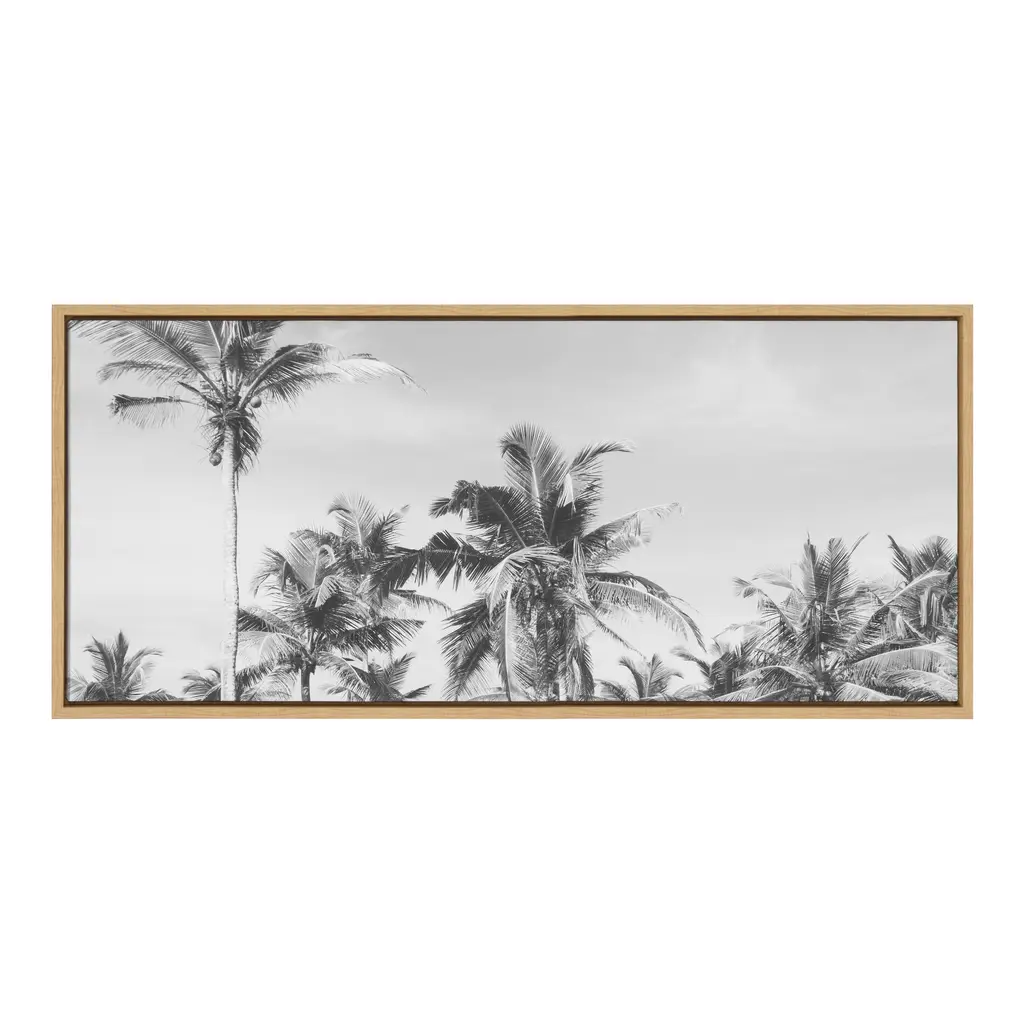 If you're looking for a warm, beachy vibe for your living room, bedroom, bathroom, entryway, or dining room, look no further than this palm tree-inspired canvas. Being long and narrow, it's perfect for that tall skinny vertical space or wide horizontal space. Framed in the USA in Waunakee, Wisconsin, this floating canvas art will be a pleasure to look at every day in your living room, bedroom, nursery, or any room in the home. This art print also makes an excellent gift for birthdays, holidays, or housewarming parties. Printed on gallery-wrapped canvas and framed with a lightweight polystyrene frame, this wall art is easy to display on the wall. The outer dimensions are 18 inches by 40 inches by 1.6 inches. Print Name: "Coastal Coconut Palm Tree Beach BW"
