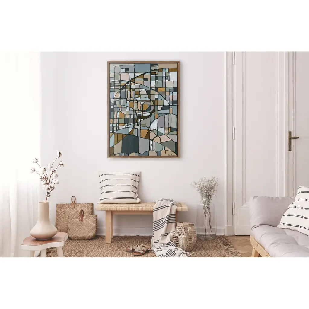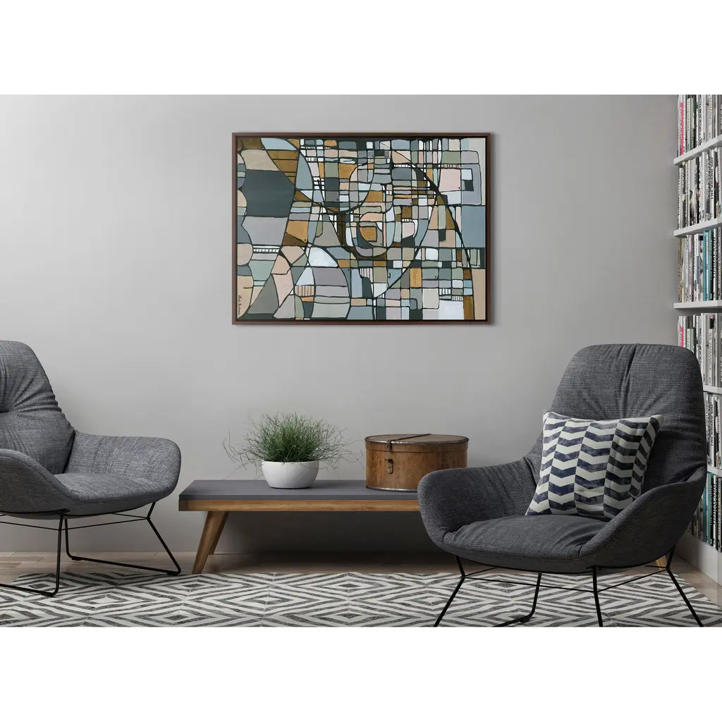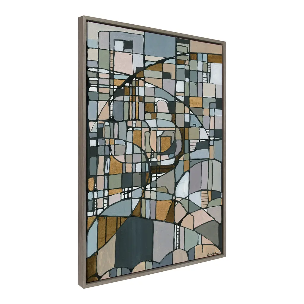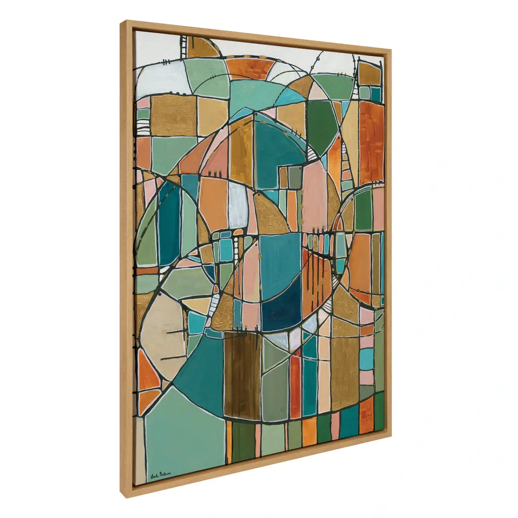 This unique mosaic beauty brings cool colors to your wall in a wide array of shapes and patterns, creating a visually alluring focal point for any room of your home. Framed in the USA in Waunakee, Wisconsin, this floating canvas art will be a pleasure to look at every day in your living room, bedroom, office, or any room in the home. This art print also makes an excellent gift for birthdays, holidays, or house-warming parties. Printed on gallery-wrapped canvas and framed with a lightweight polystyrene frame, this wall art has two hangers already attached to the MDF back for easy wall display. The outer dimensions are 38 inches by 28 inches by 1.6 inches. Print Name: "Deco Nadeau"