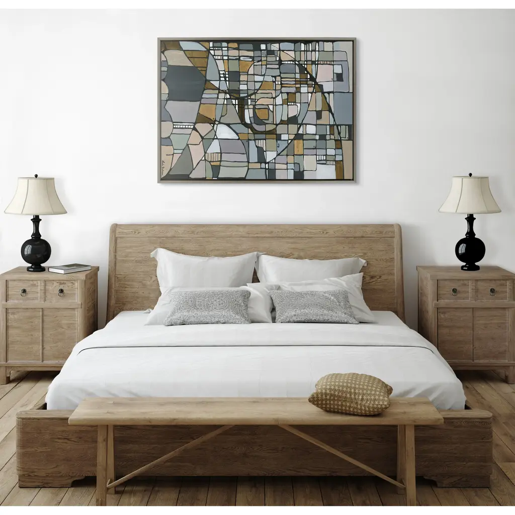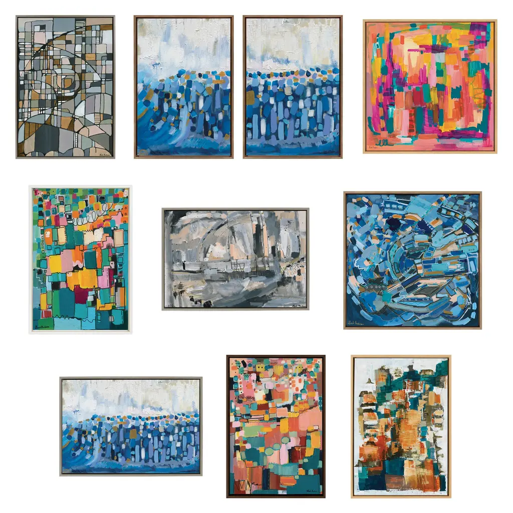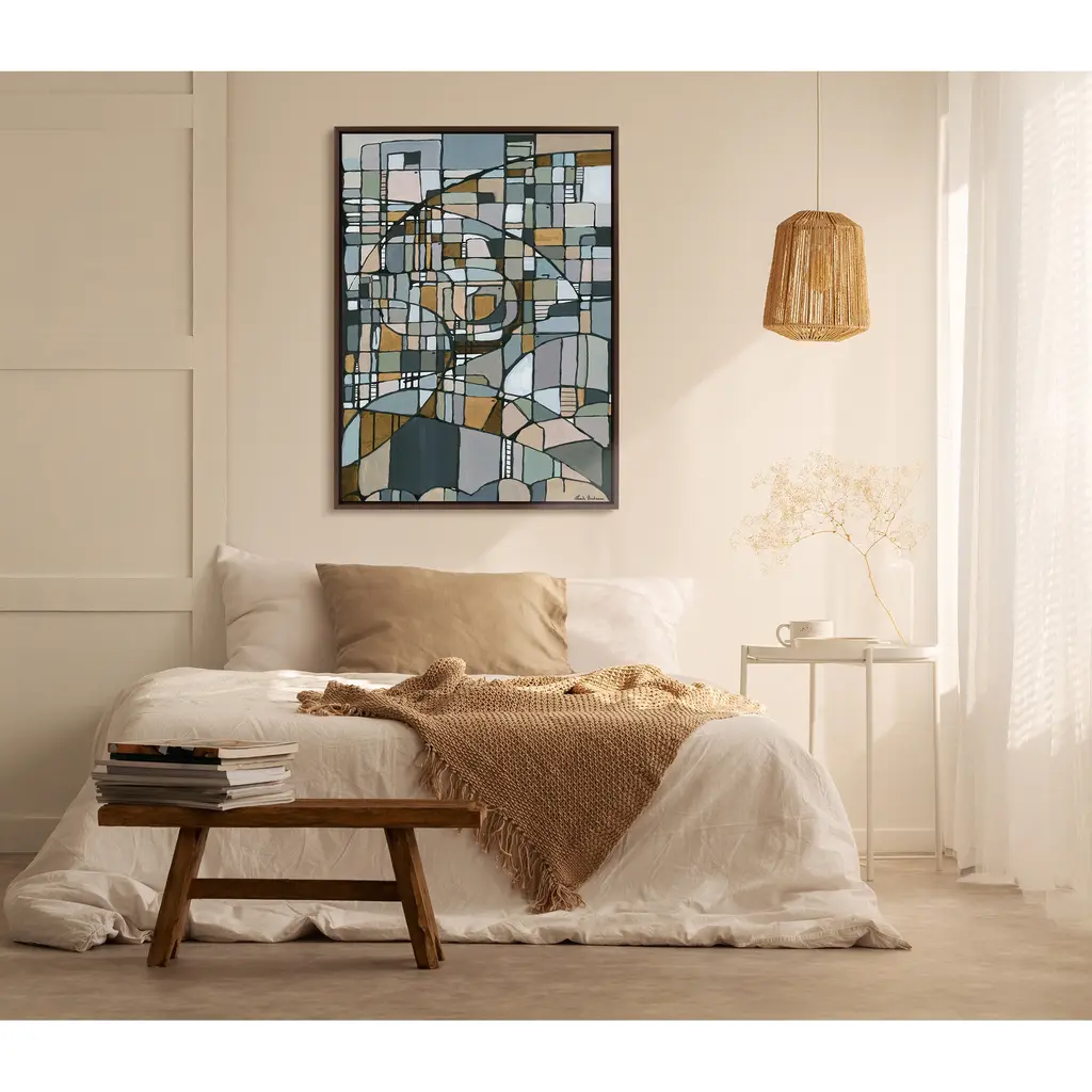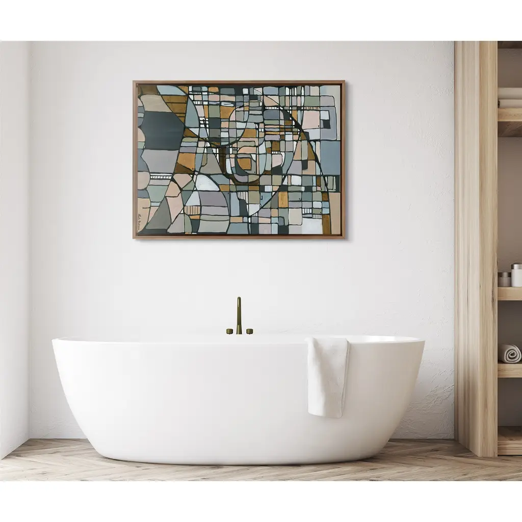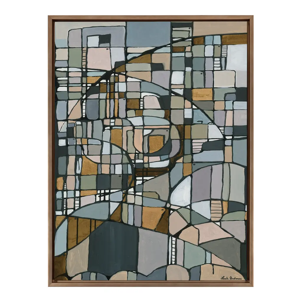 This unique mosaic beauty brings cool colors to your wall in a wide array of shapes and patterns, creating a visually alluring focal point for any room of your home. Framed in the USA in Waunakee, Wisconsin, this floating canvas art will be a pleasure to look at every day in your living room, bedroom, office, or any room in the home. This art print also makes an excellent gift for birthdays, holidays, or house-warming parties. Printed on gallery-wrapped canvas and framed with a lightweight polystyrene frame, this wall art has two hangers already attached to the MDF back for easy wall display. The outer dimensions are 38 inches by 28 inches by 1.6 inches. Print Name: "Deco Nadeau"