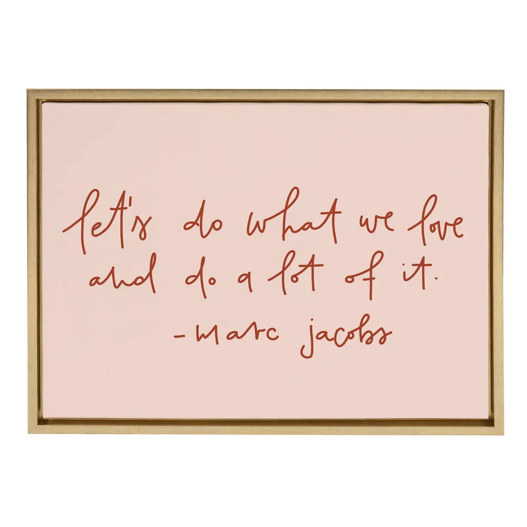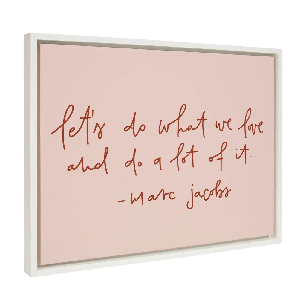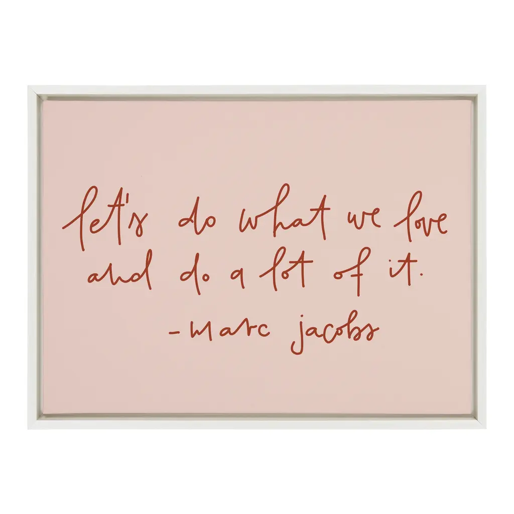 Inspire your day with this motivational quote from renowned designer Marc Jacobs. Framed in the USA in Waunakee, Wisconsin, this floating canvas art will be a pleasure to look at every day in your living room, home office, bedroom, nursery, or any room in the home. Printed on gallery-wrapped canvas and framed with a lightweight polystyrene frame, this wall art has two hangers already attached to the MDF back for easy wall display. The outer dimensions are 24 inches tall by 18 inches wide by 1.63 inches deep. Print Name: "Do What We Love".