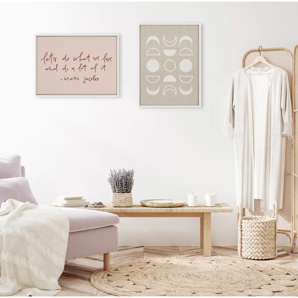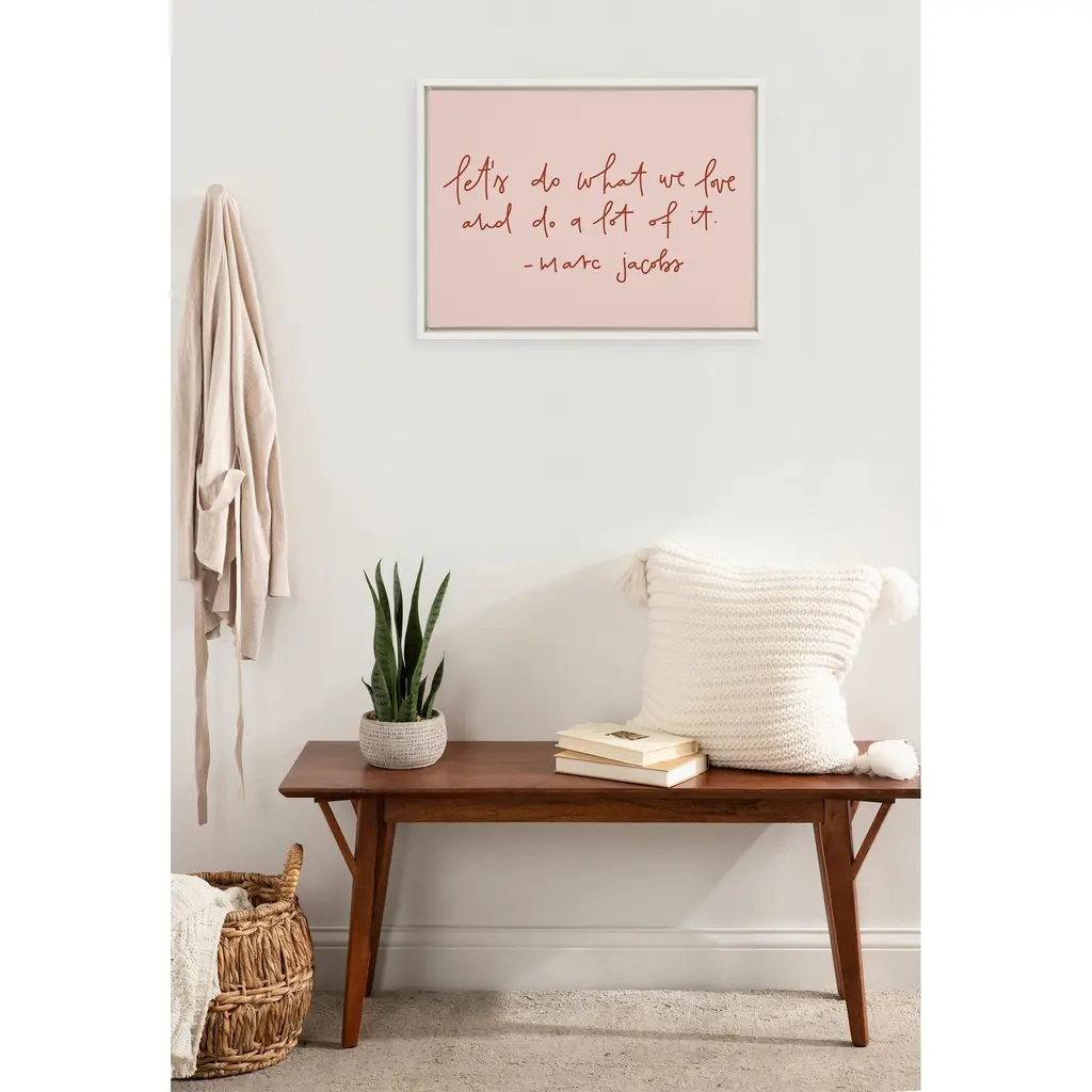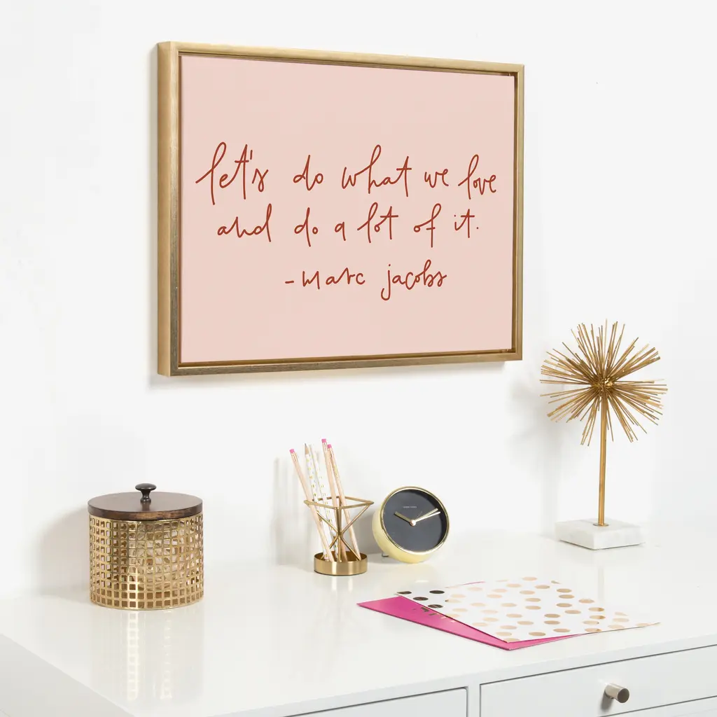 Inspire your day with this motivational quote from renowned designer Marc Jacobs. Framed in the USA in Waunakee, Wisconsin, this floating canvas art will be a pleasure to look at every day in your living room, home office, bedroom, nursery, or any room in the home. Printed on gallery-wrapped canvas and framed with a lightweight polystyrene frame, this wall art has two hangers already attached to the MDF back for easy wall display. The outer dimensions are 24 inches tall by 18 inches wide by 1.63 inches deep. Print Name: "Do What We Love".