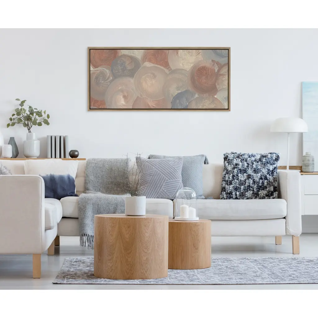 Elevate your wall decor with this stunning framed canvas wall art featuring abstract neutral circles in a narrow design. This art piece from our Mentoring Positives collaboration adds a touch of modern elegance and sophistication to any space. Framed in the USA in Waunakee, Wisconsin, this modern floating canvas art is sure to bring joy to your space. Our design team curates art that will fit perfectly in any room of your home. Showcase this art in your living room, bedroom, home office, kitchen, bathroom, nursery, or anywhere you want to bring a little beauty and charm to your walls. Specializing in home décor, we are continually bringing timeless works of art for the traditional decorator as well as trend-forward pieces for that eclectic art lover. Our high-quality framed canvas art also makes excellent gifts for birthdays, holidays, or housewarming parties. Printed on gallery-wrapped canvas and framed with a simple gallery frame this wall art is easy to display on the wall and will match with any décor style. The outer dimensions are 18 inches by 40 inches by 1.6 inches. Print Name: "Dots"