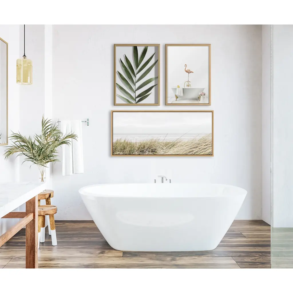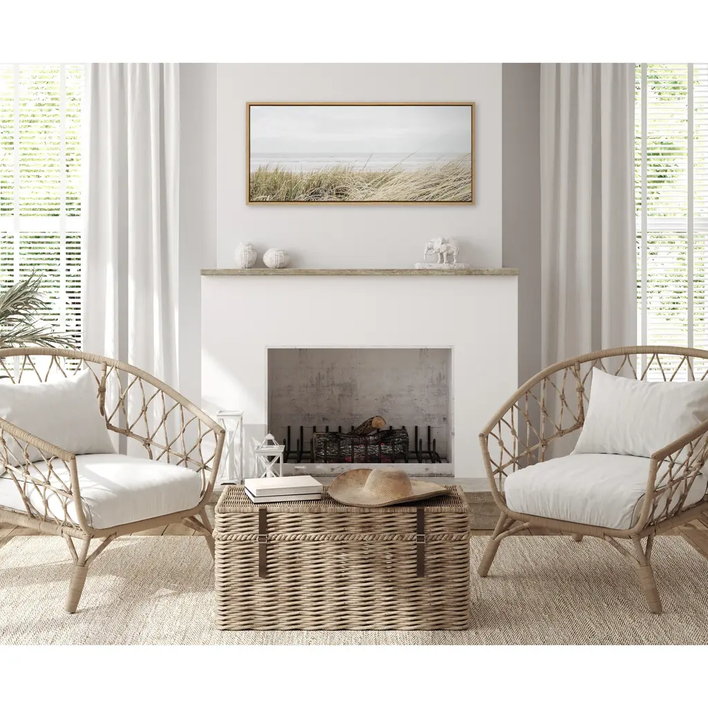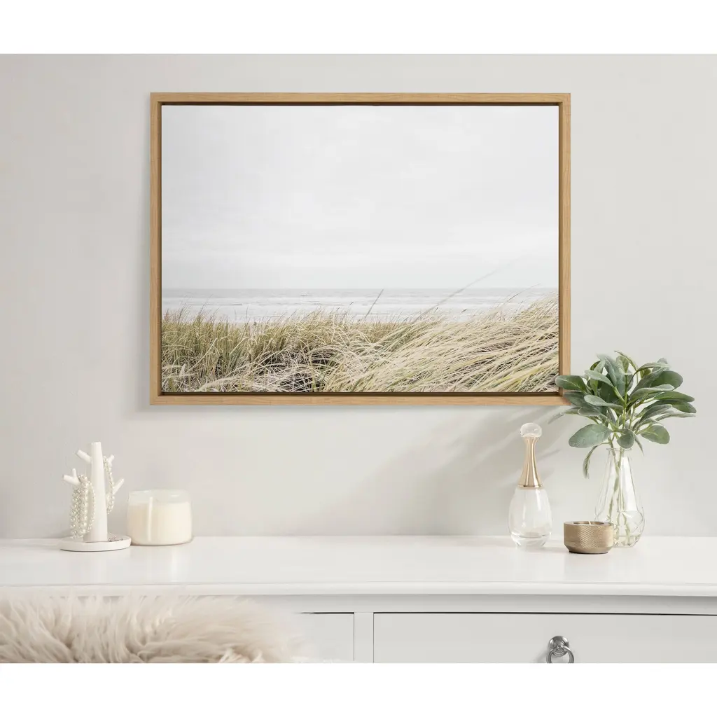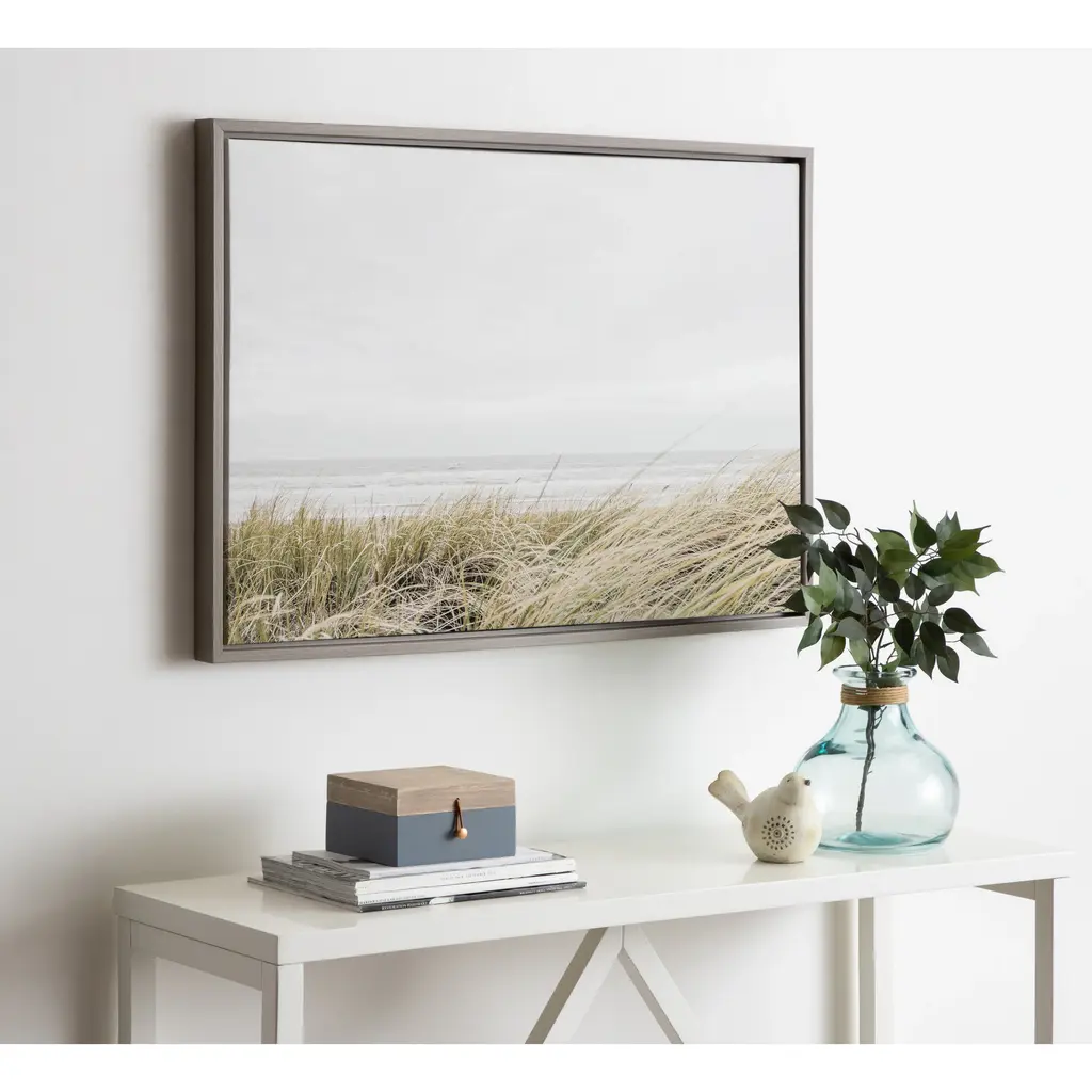Imagine yourself in this beautiful coastal beach with this print by Amy Peterson. Framed in the USA in Waunakee, Wisconsin, this floating canvas art will be a pleasure to look at every day in your living room, bedroom, nursery, or any room in the home. Printed on gallery-wrapped canvas and framed with a lightweight polystyrene frame, this wall art has two hangers already attached to the MDF back for easy wall display. The outer dimensions are 33 inches tall by 23 inches wide by 1.63 inches deep. Print Name: "East Beach"